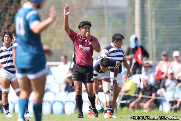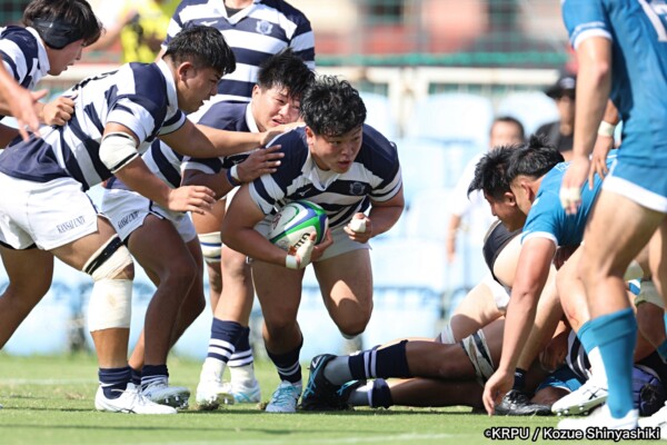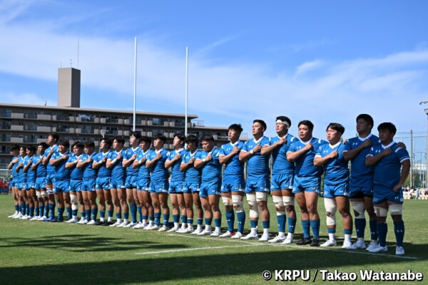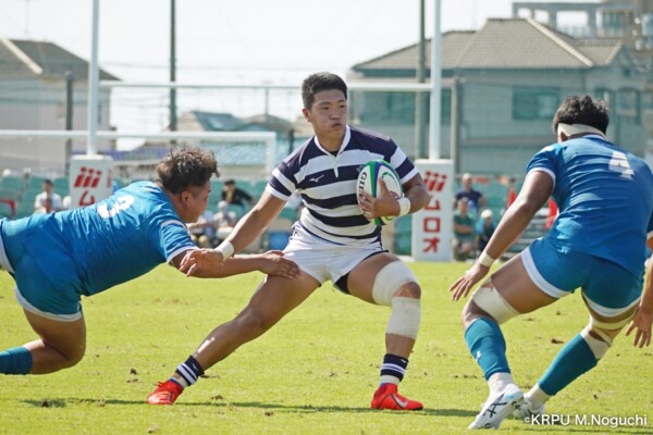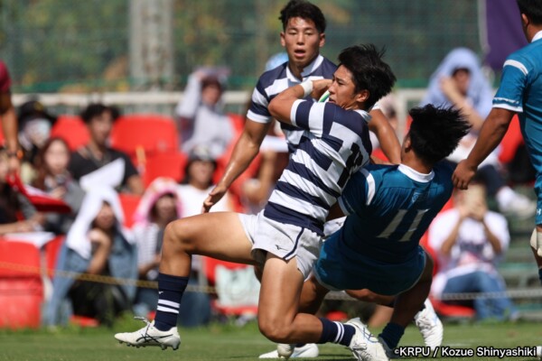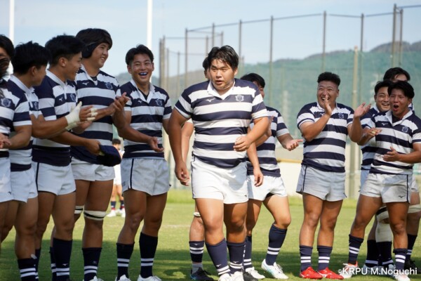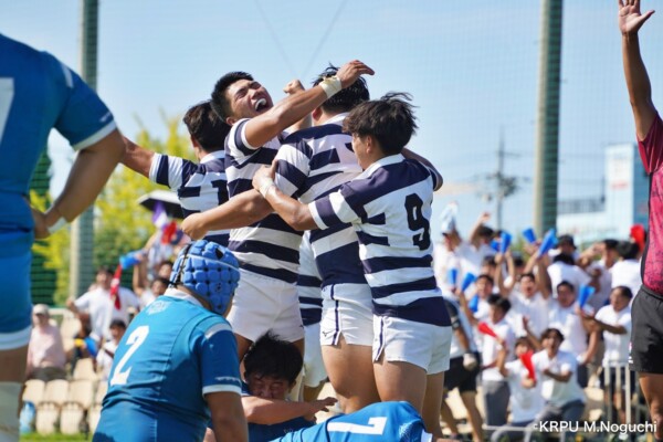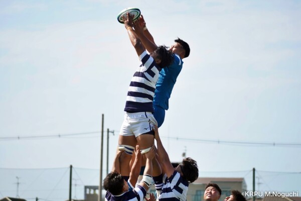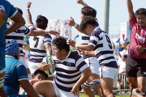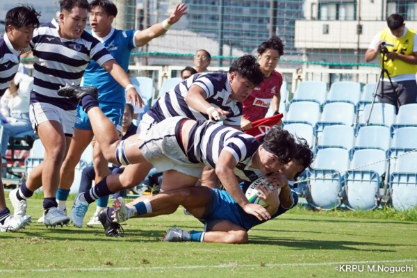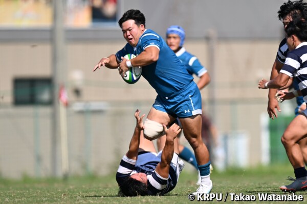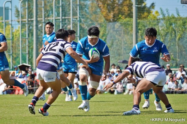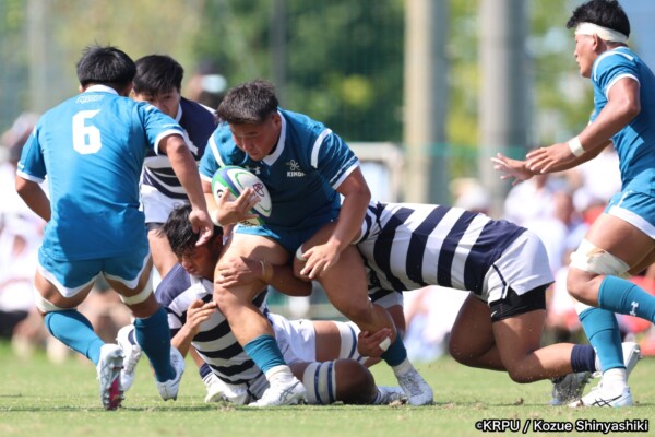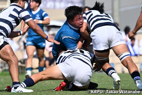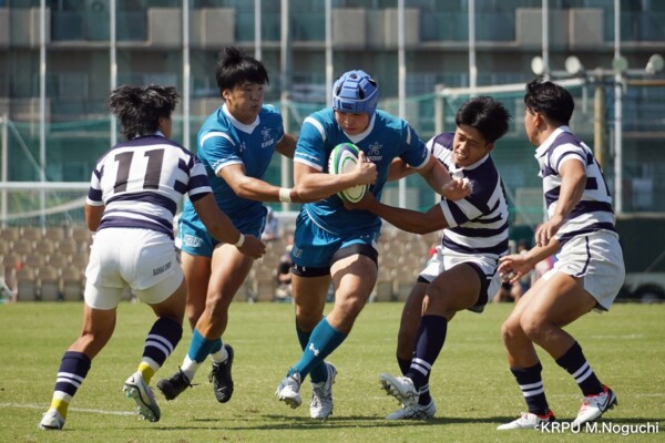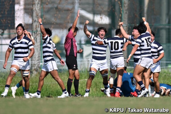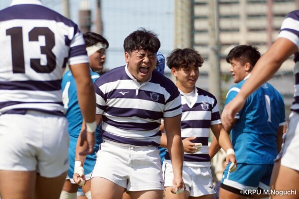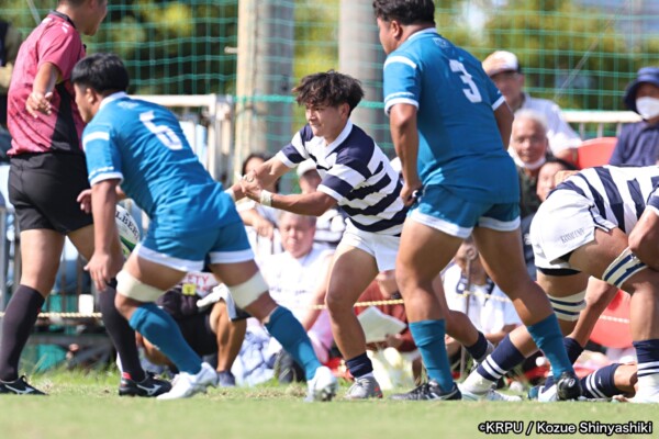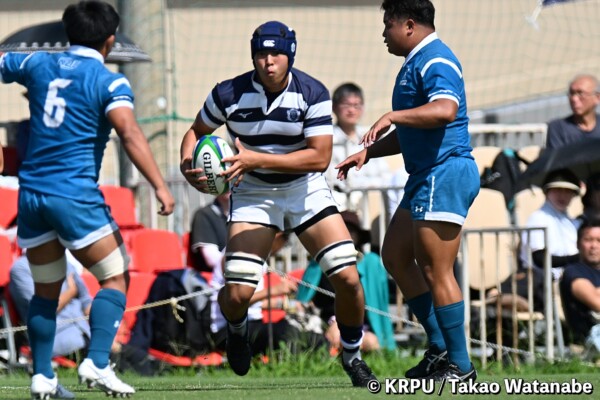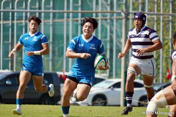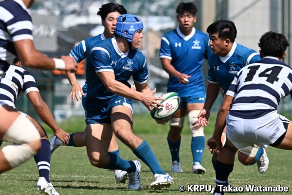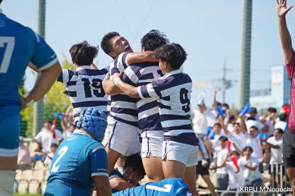 ロスタイム43分、関大は⑩崎田の見事な50/22のタッチキックから、ゴール前6M付近でのマイボールラインアウトの機会を自ら作る。モールを形成するも崩れ、FWがラックサイドから右サイドを攻める。途中から入った大きな体の1年生PR⑱森下陽希が右サイドを突くがとり切れず。また、次の機会にも右サイドを積極的に突くも阻止される。⑱森下の3度目の挑戦で左サイドを攻め飛び込んで逆転トライ(GK成功)し、関大はロスタイムの逆転劇で貴重な1勝をもぎ取った。(25-31)