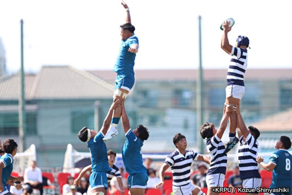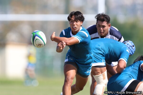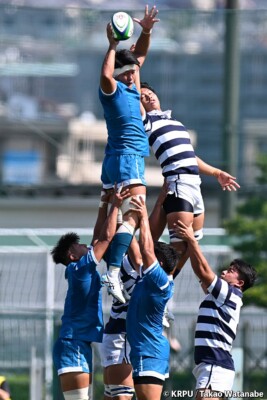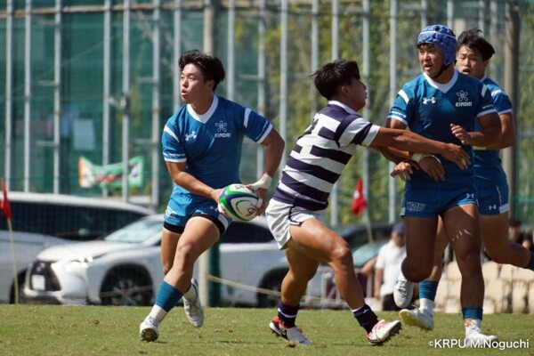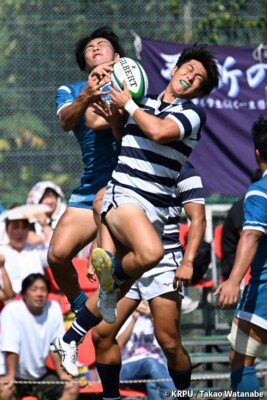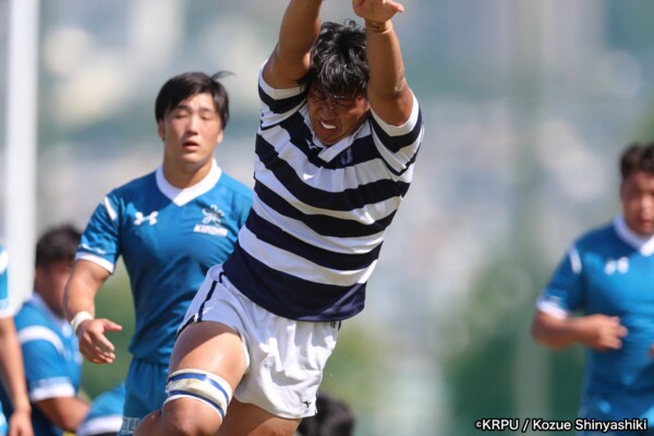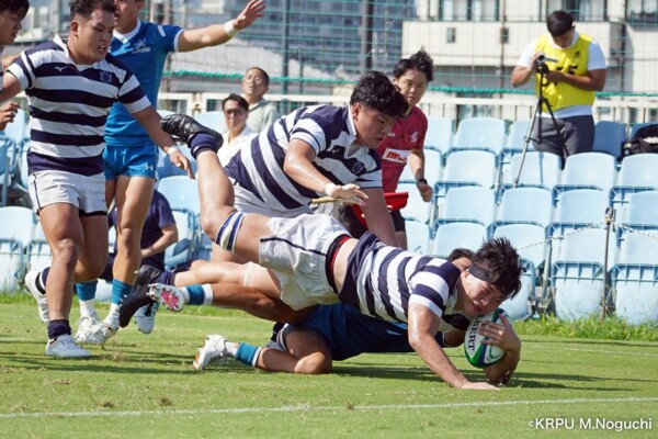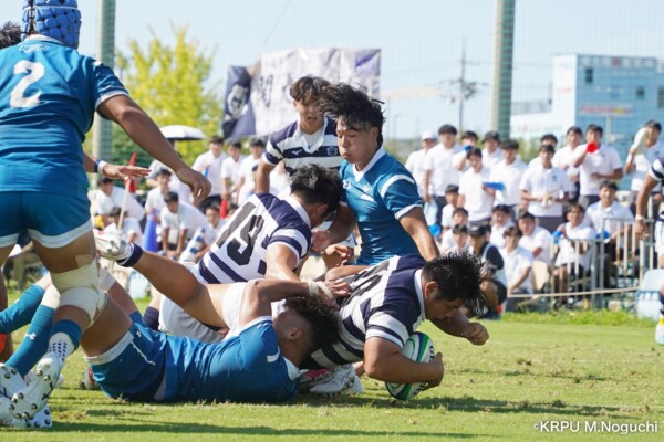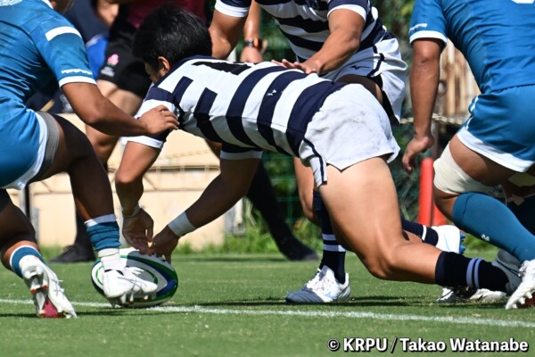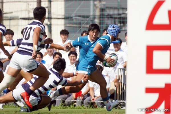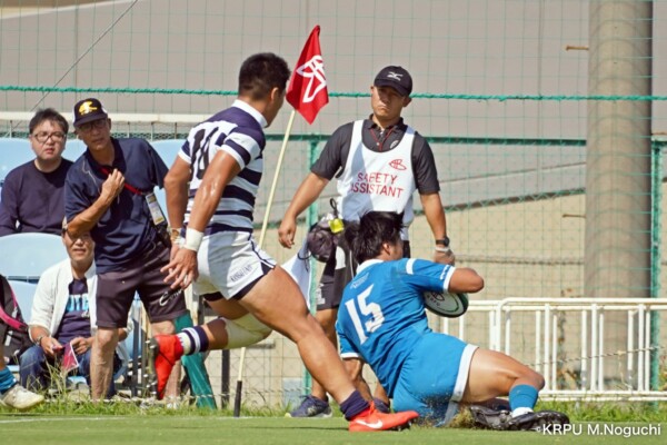 だが、関大もすぐに反撃。17分、敵陣ゴール前15M付近のフリーキックからSH⑨宮内幹太が素早くリスタート、⑩崎田がゴール前にハイパント、FB⑮立石和馬が見事にジャンピングキャッチ、そのまま、右中間に押さえすぐに追いつく。(5-5)