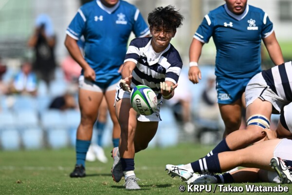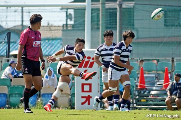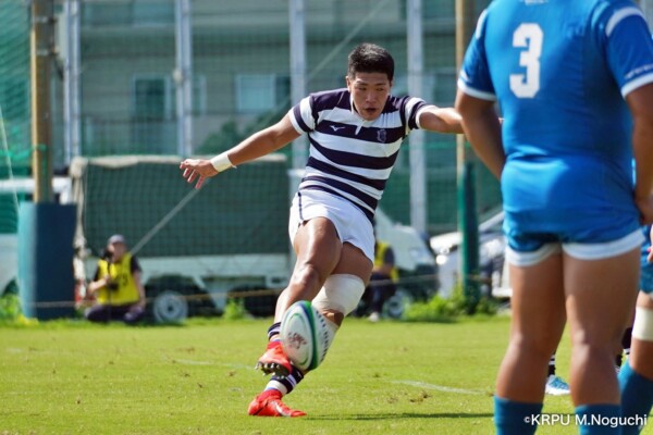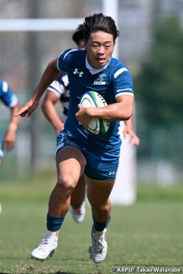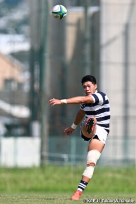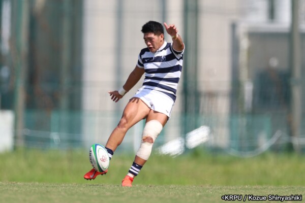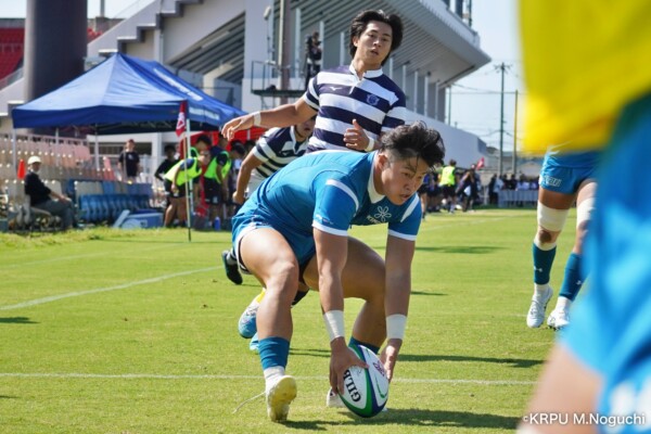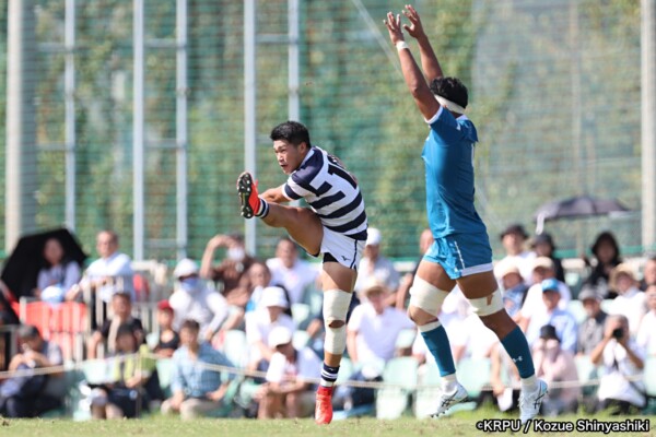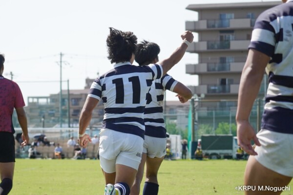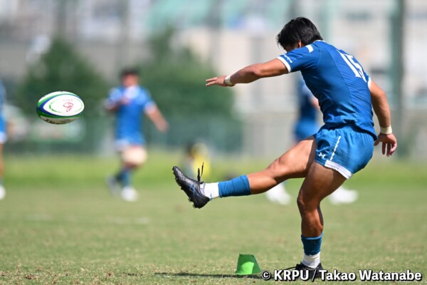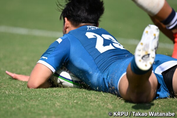 残りあと10分を切った32分、ゴール前でラインアウトの機会を得た関大。FWで取り切ろうとするが、阻止されBKへ右展開、右大外で取り切れず、今度は左へ展開、⑩崎田から飛ばしパスをもらったWTB⑪遠藤亮真が左隅へ飛び込む。難しい位置からのGKは⑩崎田が決めて点差を詰める。(25―17)