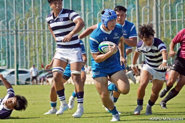 序盤、お互い優秀なロングキッカー(近大WTB⑪阿曽有馬、関大SO⑩崎田士人)を要し、エリアの取り合い(キック合戦)で甲乙つけがたい展開が続く。