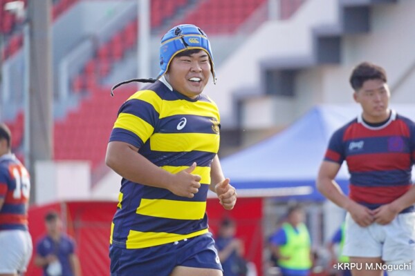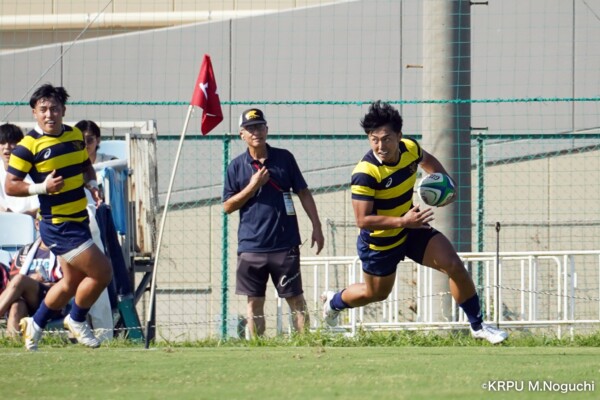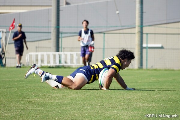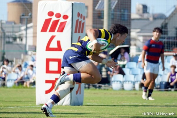 最初にチャンスを掴んだのは立命大9分、ゴール前20m左ラインアウトからフェーズを重ね、ラックからSH⑨福本颯翔がダミーパスでそのままゴールポスト下に持ち込み先制トライ、GKもSO⑩キャプテン山下真之介が成功。7-0