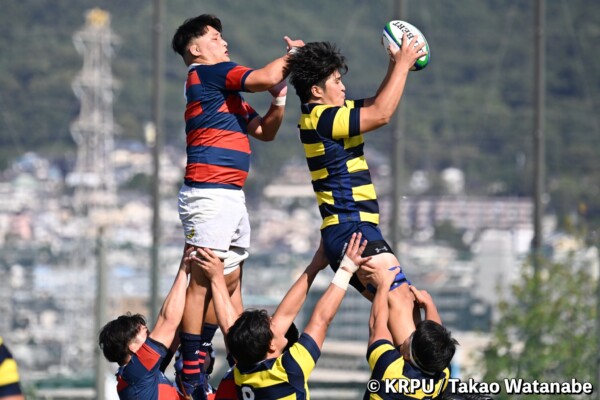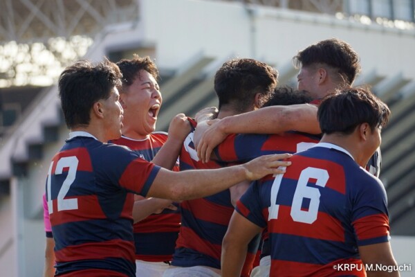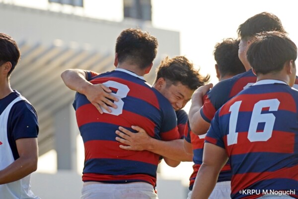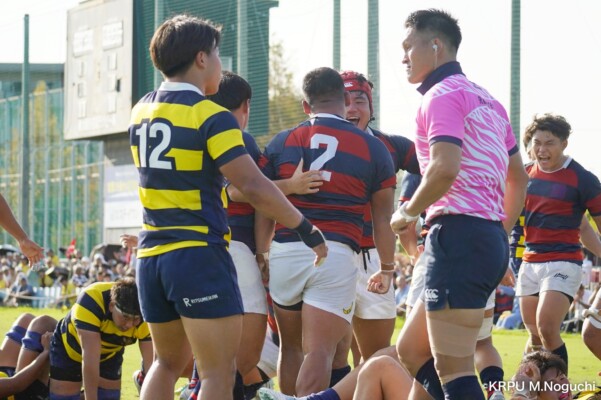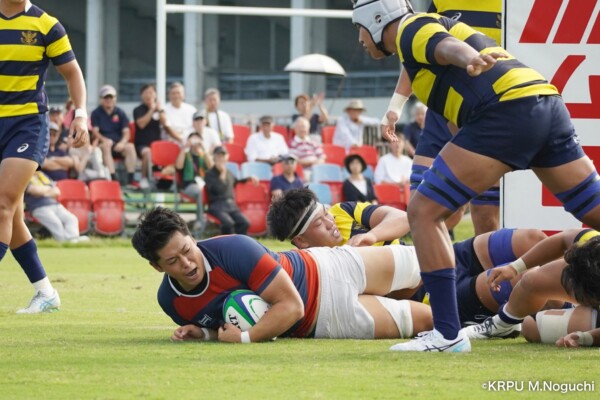 追い上げられた立命大は11分、オフサイドのペナルティからキックでSO⑩山下が蹴り出し、ゴール前5m左ラインアウトからスロワーHO②大本からジャンパーLO④共同キャプテン本郷正人がモールを形成しそのまま押し込み最後尾についたHO②大本が落ち着いて左中間トライ、GK不成功。22-14