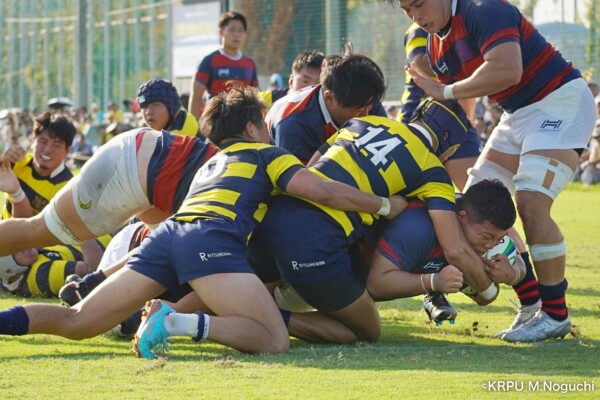 18分、立命大がゴール前20m右中間スクラムから左に展開しSH⑨福本からHO②大本峻士に渡りSO⑩山下からCTB⑫中村颯汰にパスを繋ぎ、最後はFB⑮御池蓮二がゴールポスト下に回り込みトライ、GKもSO⑩山下が成功。14-7