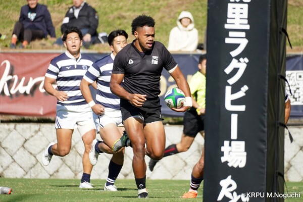 開始2分、天理大は関西大学(関大)のキックオフリターンボールをFW選手もBK選手も相手に体をヒットさせながら7~8フェーズ繋ぎ、最後はWTB⑭ナイバルワガ・トマシが30mほど走り切り中央にトライ。GKはFB⑮筒口允之が難なく決めて先制する。(0-7)