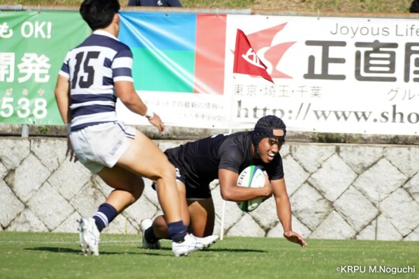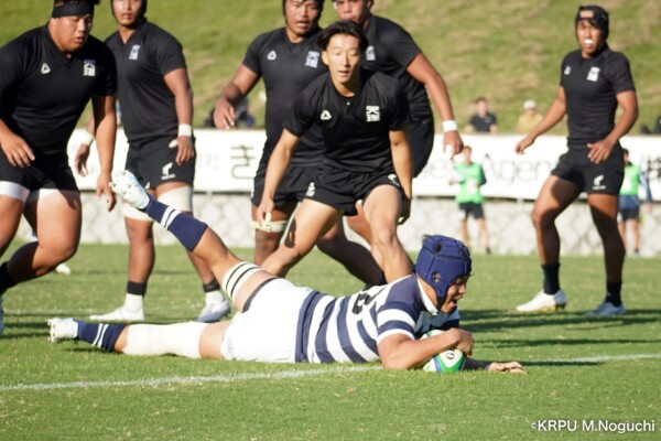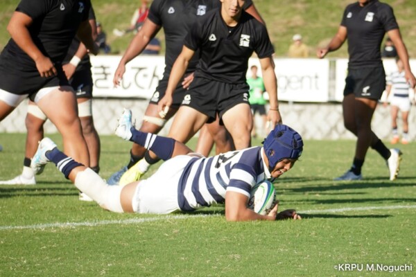 復帰してすぐの奥平がトライ。後半のプランはしっかり敵陣にまず入ることだった。トライを取った後もキックオフからもう1回自分たちのリズムを作っていこうと話していた。