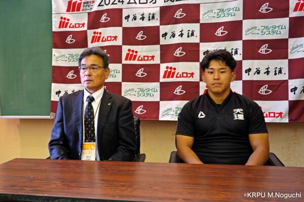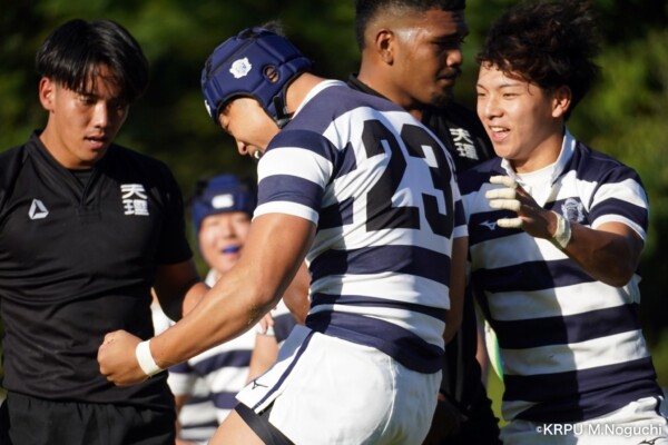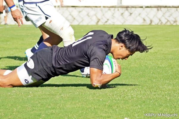 その後も天理大が優勢に進めるなか、9分、左サイドを駆け抜けながらWTB⑪藤原竜之丞が相手の裏にゴロパント、CTB⑫山田晟大がキャッチ、そのまま右中間にグラウンディング(GK成功)で突き放す。(0-14)