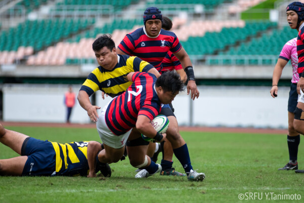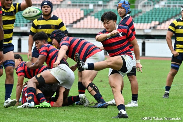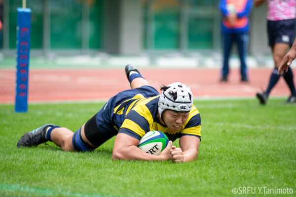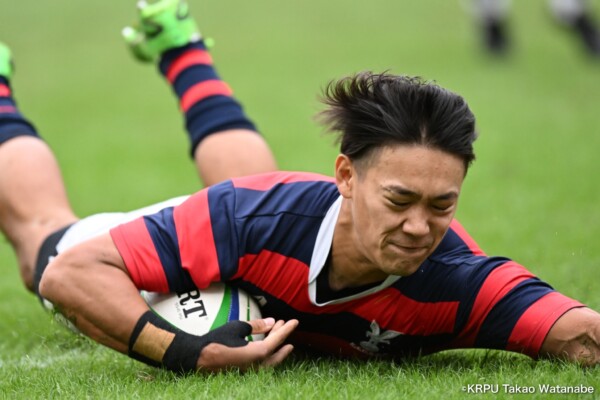 さらに、立命大は、後半24分、相手陣ゴール前5mから連続攻撃で出来た左中間のラックで、SH㉑福本から、右タッチライン沿いのLO④本郷正人へロングパスが渡ると、右隅へトライ、12-42とする。