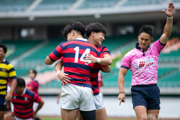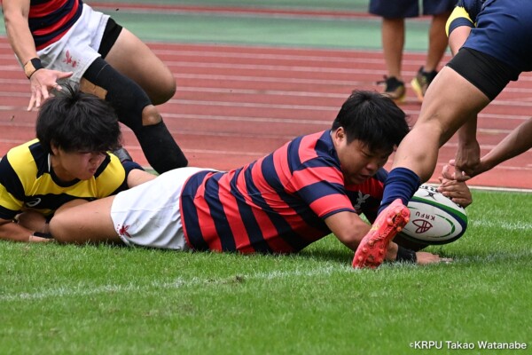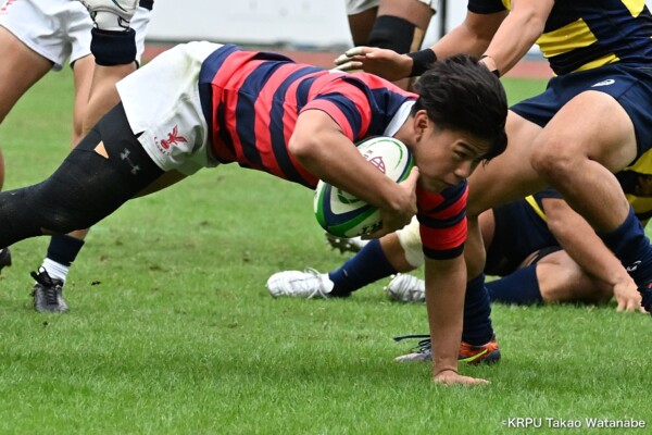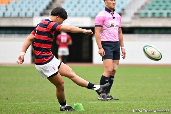 前半6分、相手陣22m内側に入り、立命大のノットロールアウェイのペナルティ、京産大はキックで前進し、相手陣ゴール前5m左ラインアウトからモールを形成すると、HO②李淳弘が左へ持ち出し、左隅へ相手タックルを受けながら手を伸ばしトライ、SH⑨土永旭が難しい角度のコンバージョン成功で、7-0とする。