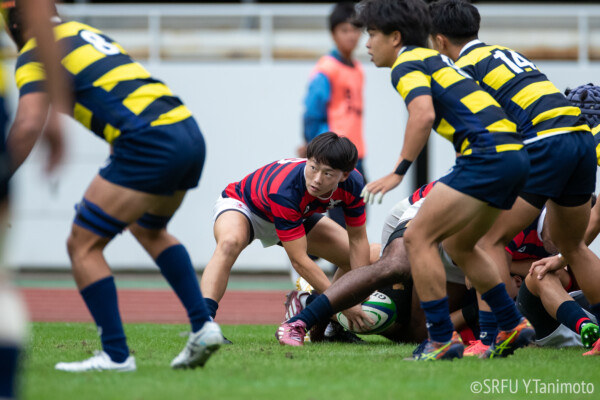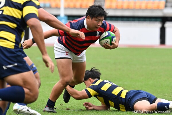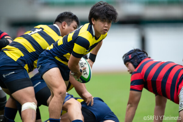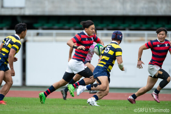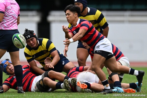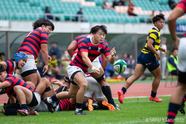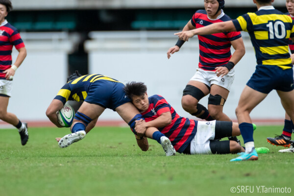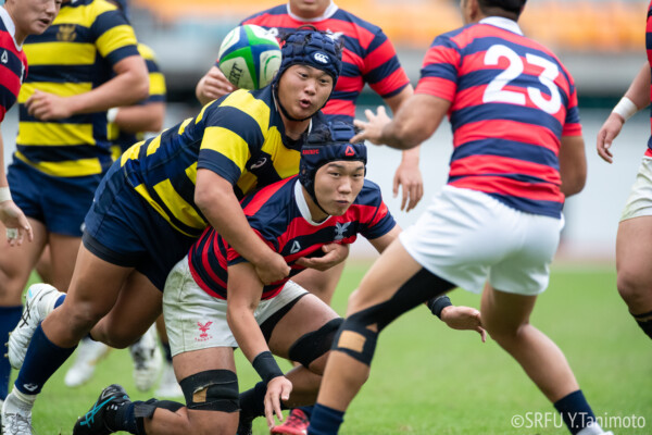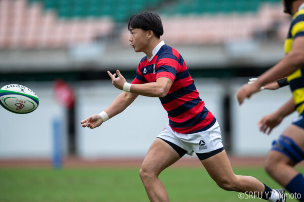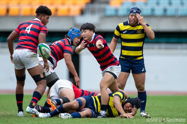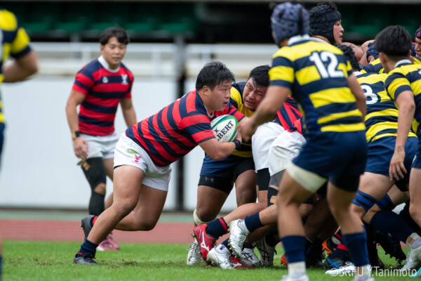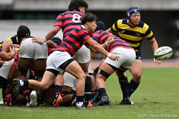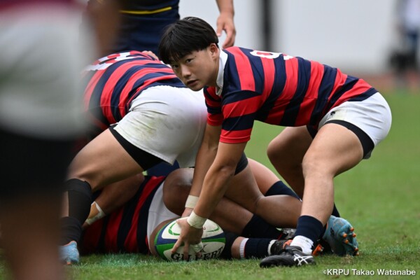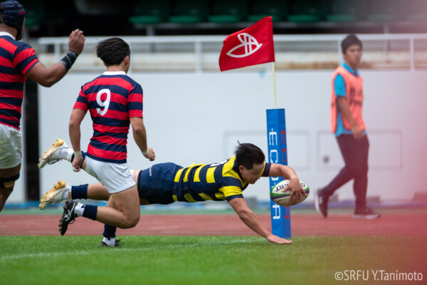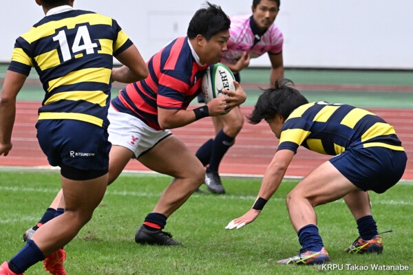 後半19分、立命大は、相手ノックオンでの相手陣10m内側右中間スクラムから、No8⑧生島拓海が持ち出し、WTB⑭御池蓮二へパスが渡ると、ディフェンスの間を突きディフェンスをかわしながらゴールポスト前へ、ラックを形成、素早くSH㉑福本颯翔から主将のSO⑩山下真之介へ、さらにWTB⑪髙橋謙へ飛ばしパスが渡ると左隅へトライ、⑩山下のコンバージョンも決まり、7-42とする。