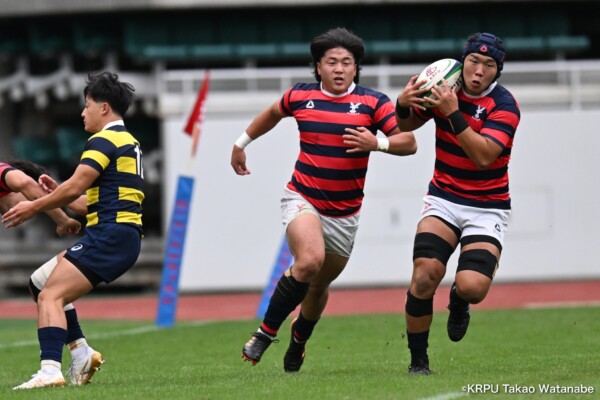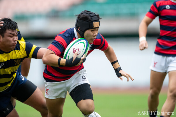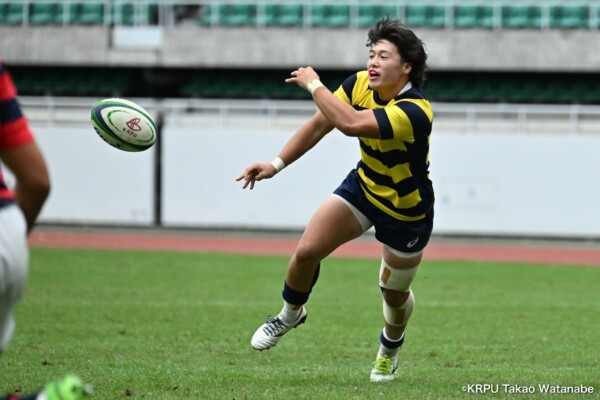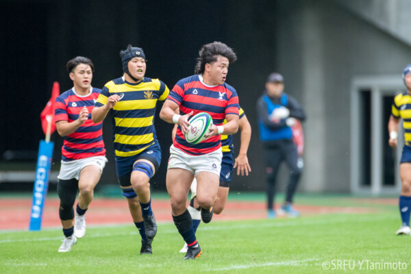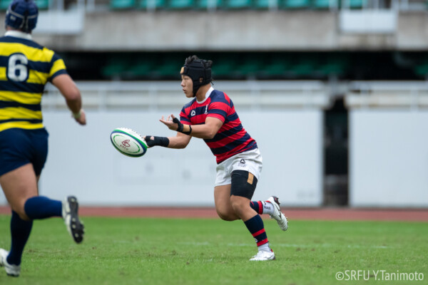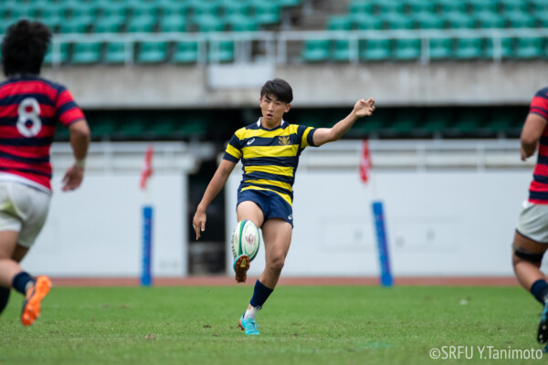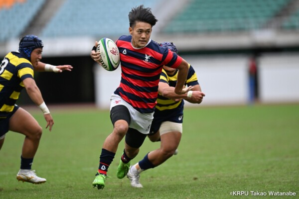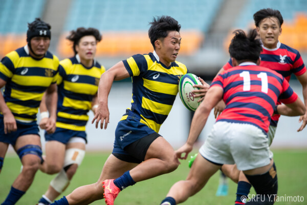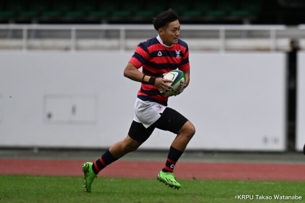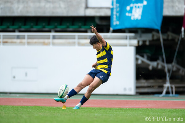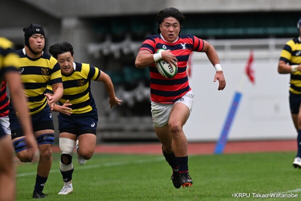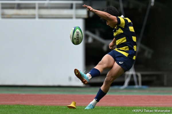 京産大は、前半34分にも、相手陣10m内側左ラインアウトから、右左へ展開、相手陣22m内側へ入り出来たラックから、SH⑨土永、CTB⑫藤本凌聖、裏を走るFB⑮奈須貴大へパスが渡ると、ディフェンスの間を突き右中間へトライ、⑨土永がコンバージョンを決める。
