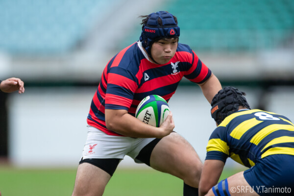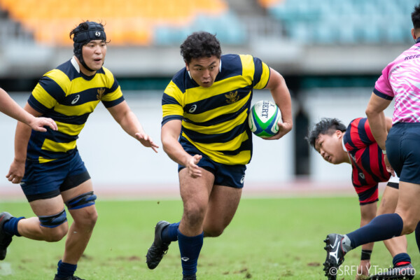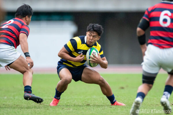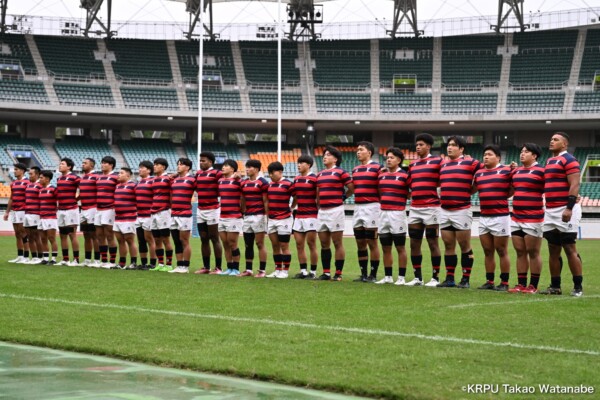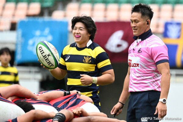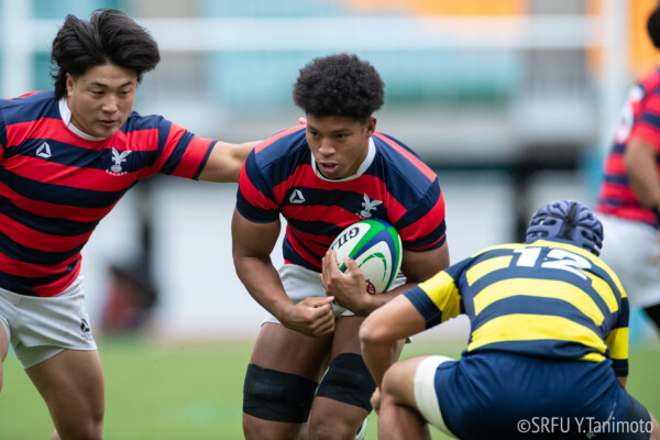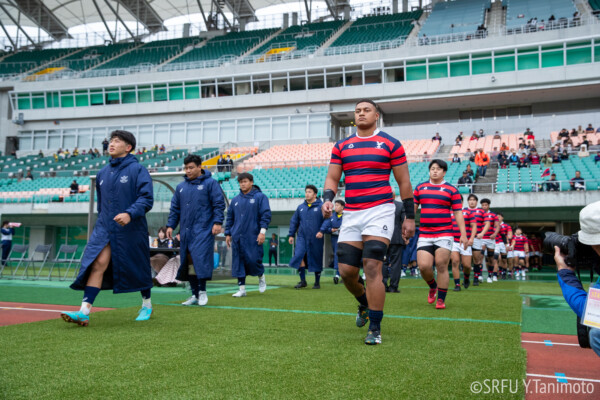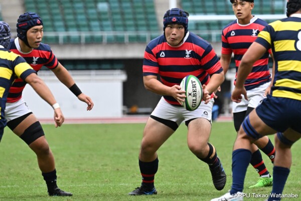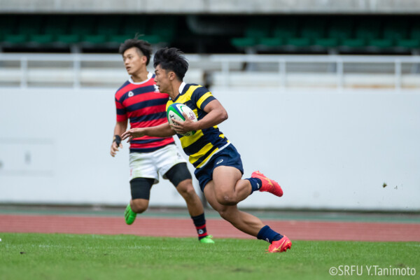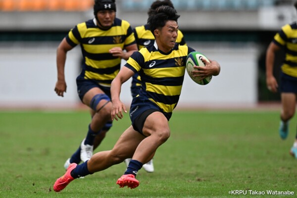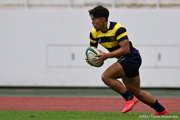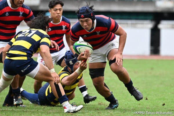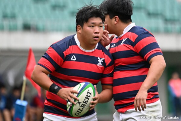 京産大は、前半34分にも、相手陣10m内側左ラインアウトから、右左へ展開、相手陣22m内側へ入り出来たラックから、SH⑨土永、CTB⑫藤本凌聖、裏を走るFB⑮奈須貴大へパスが渡ると、ディフェンスの間を突き右中間へトライ、⑨土永がコンバージョンを決める。