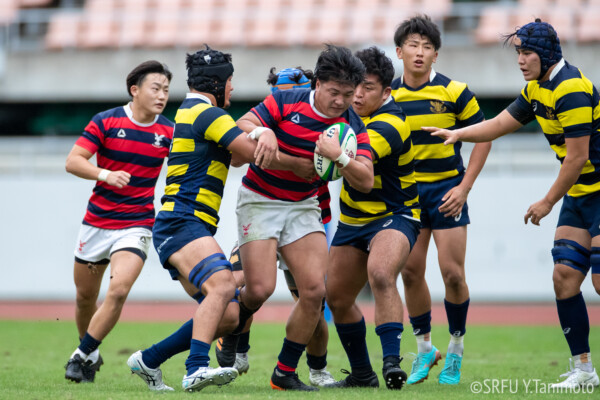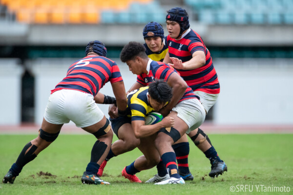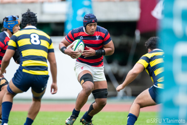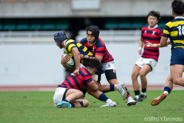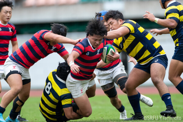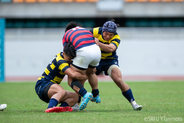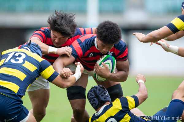 立命大はしっかりとしたディフェンスで、相手がフェーズを重ねるもノックオンを誘う。