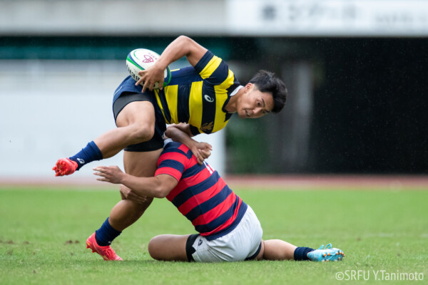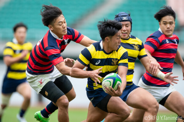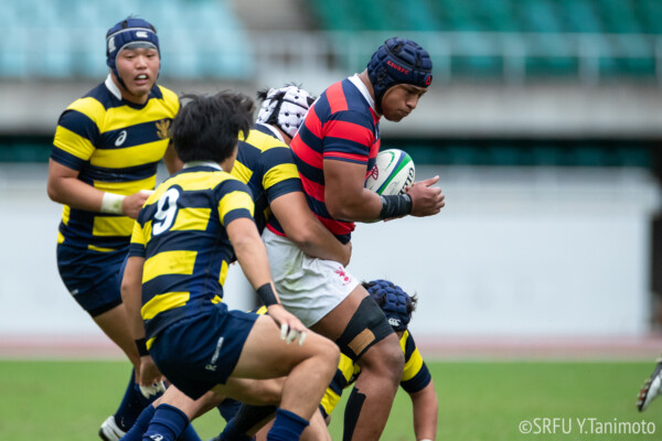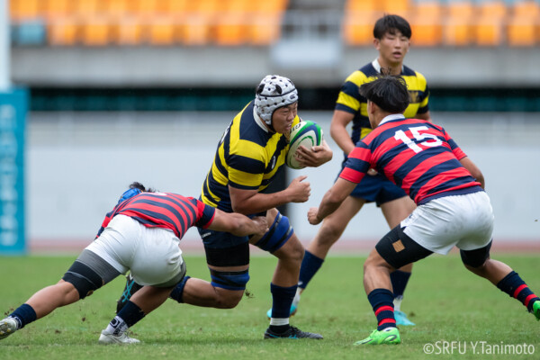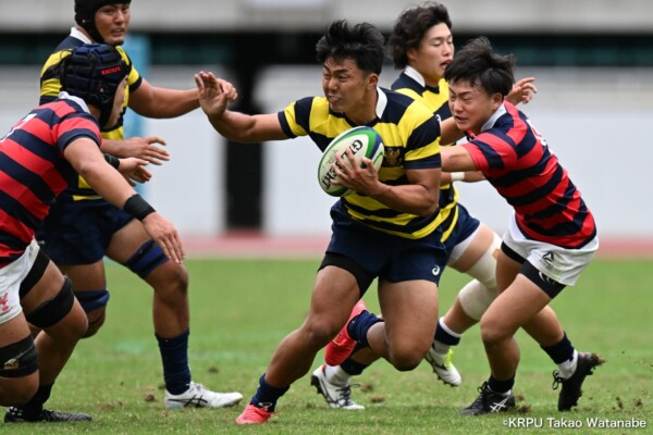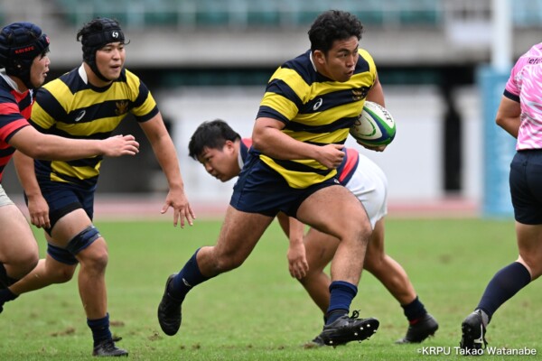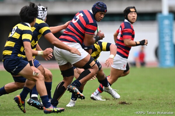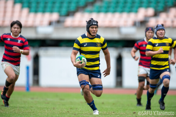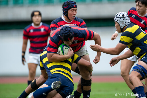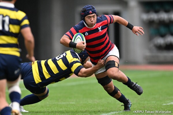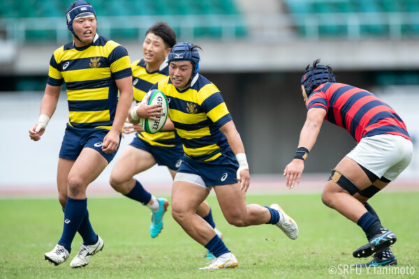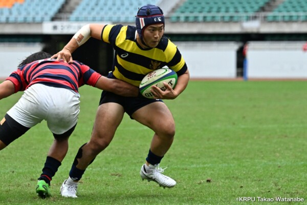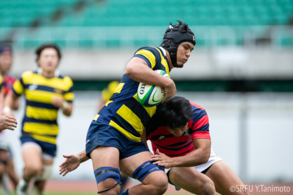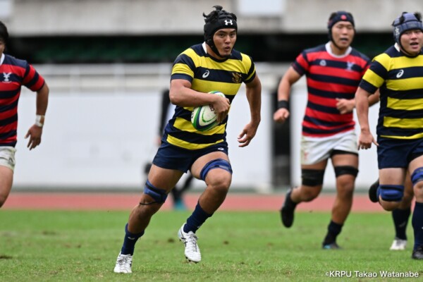京産大はしっかりとしたディフェンスで相手をノートライに抑え、28-0で前半を折り返す。