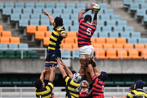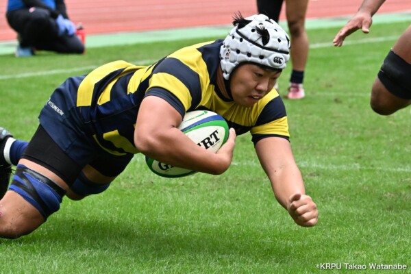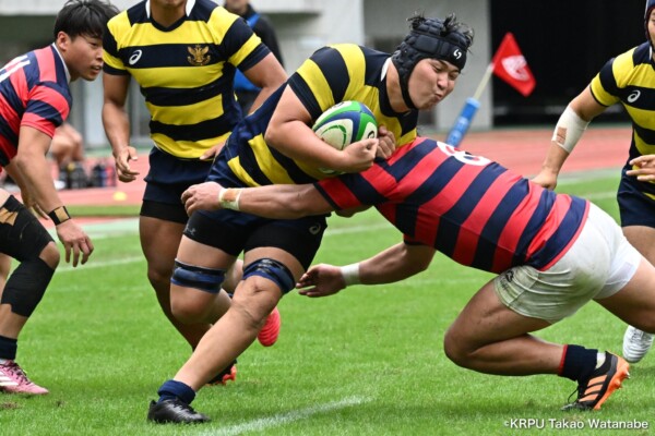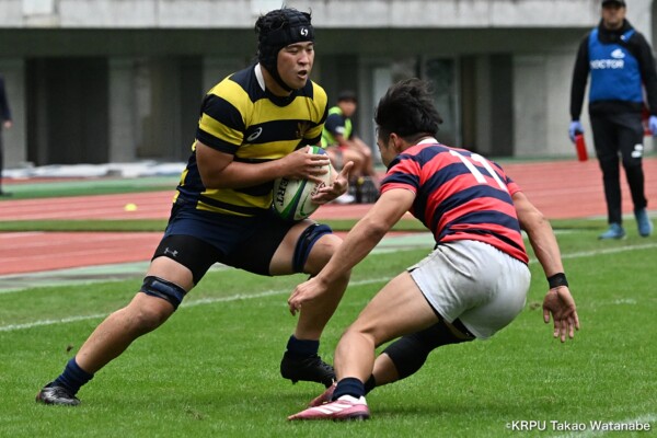 さらに、京産大は、自陣22m外で、相手ノックオンのボールをマイボールとすると攻め、相手ハイタックルのペナルティを得るとキックで前進、後半15分、相手陣22m左ラインアウトから素早い連続攻撃でゴール前へ迫ると、ラックからここでもFL⑥伊藤がピック&ゴーで2連続トライ、⑨土永がコンバージョンを決め、42-0と大きくリードをひろげる。