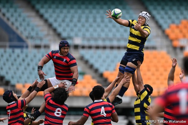 立命大は、前半10分すぎ、相手ペナルティからキックで前進し、相手陣ゴール前左ラインアウトはノットストレート、チャンスを活かせない。