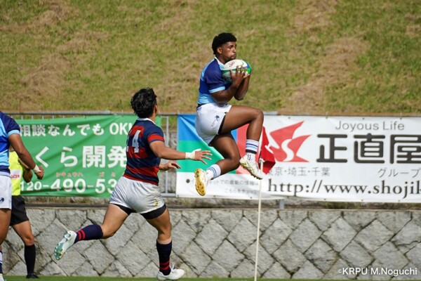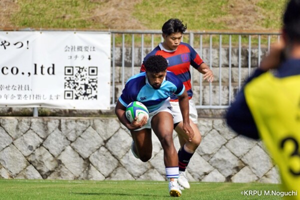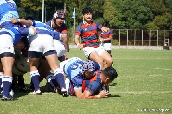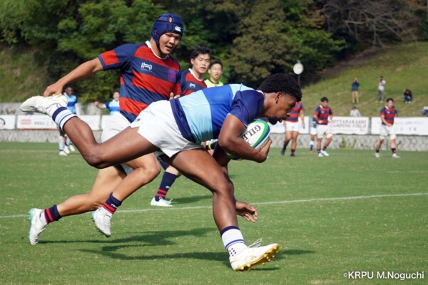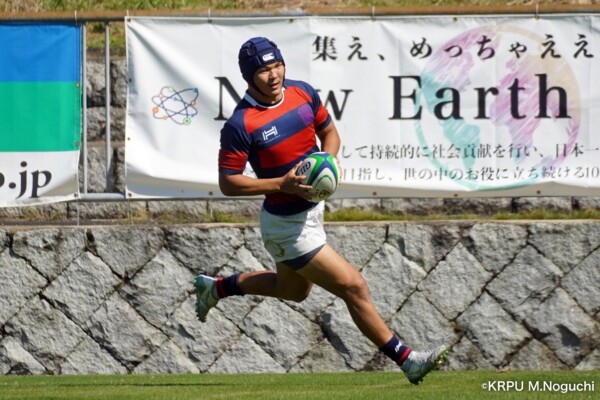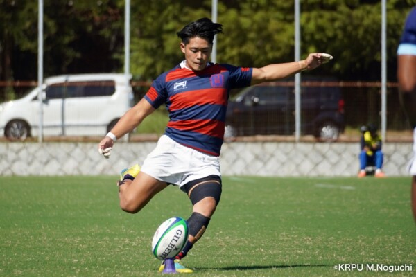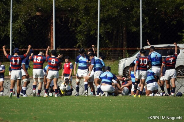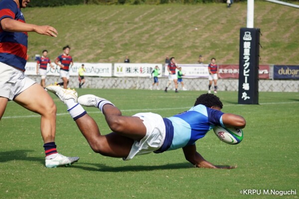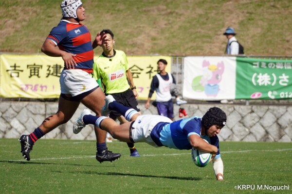 お互いに攻めるがチャンスを活かせない時間が経過したが、20分、摂南大が自陣から攻めフェーズを重ね、SH⑨松下宇宙からパスを受けたFB⑮前田晃明が走り込みゴールポスト下にトライ、GKもWTB⑪カストン・マイケルズが成功。12-7