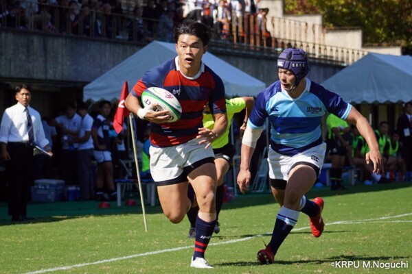 19分、再び関学大が敵陣20m右ラインアウトから攻め込みSH⑨川原からNO8⑧小林典大にパスを受けたHO②平生が右隅にトライ、GKも難しい角度からSO⑩澤田が成功リードを広げる。39-19