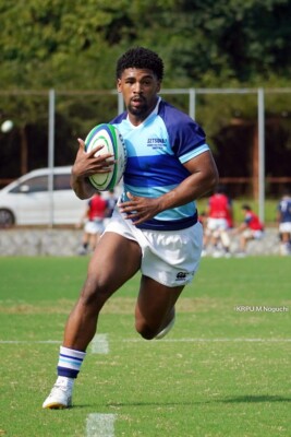 34分、摂南大が再び攻め込みHO②昇幹太からパスを受けたSO⑩村上のキックパスを再びWTB⑪カストンがキャッチし右中間にトライ、GK不成功、追い上げる。42-31