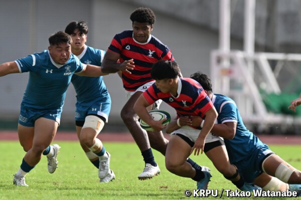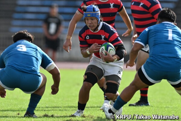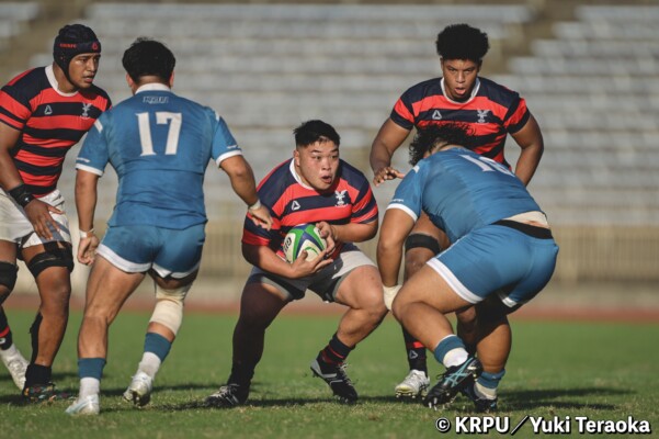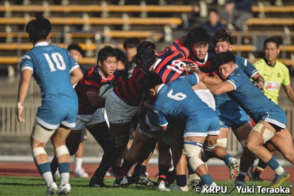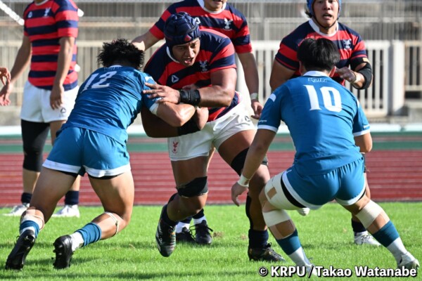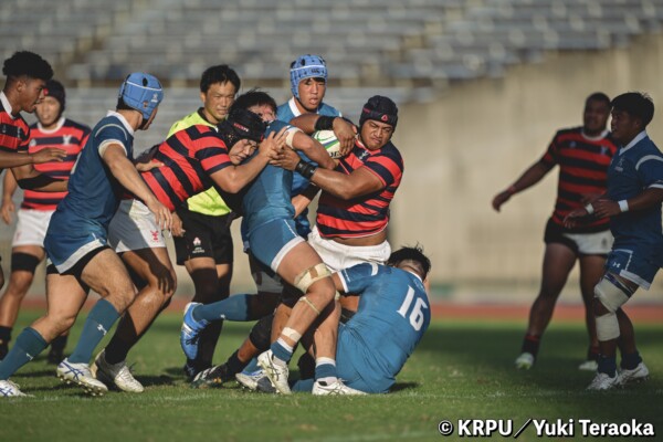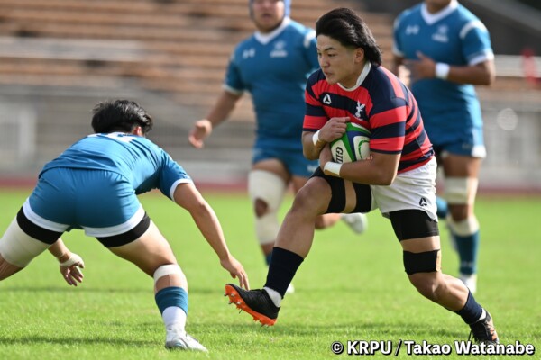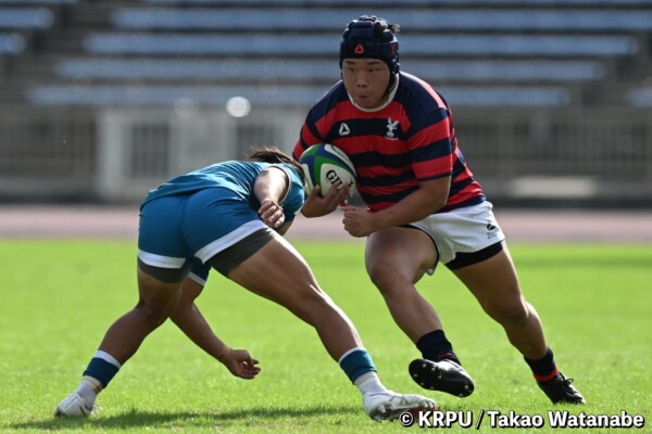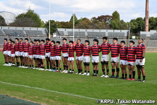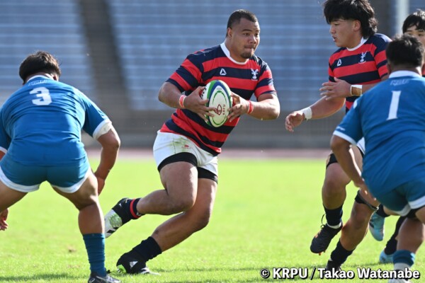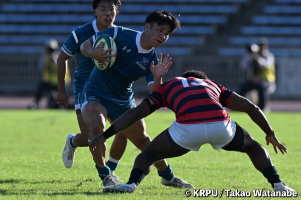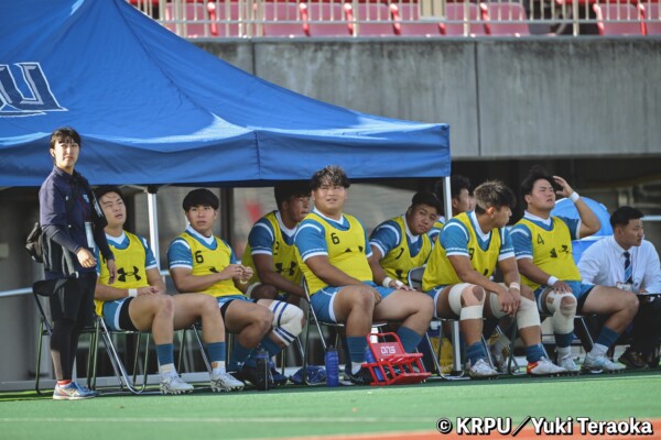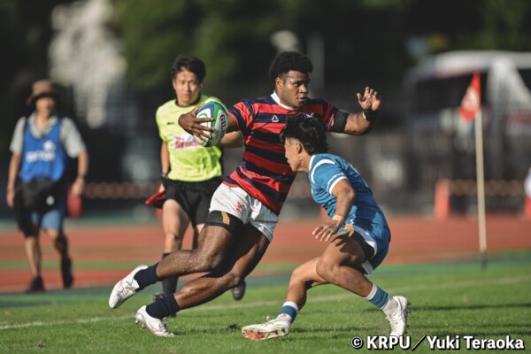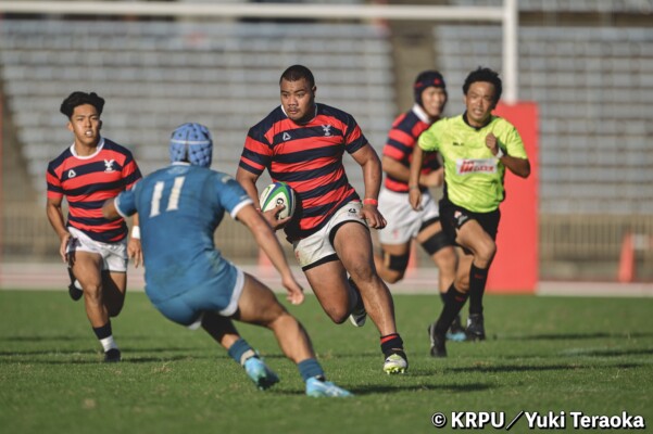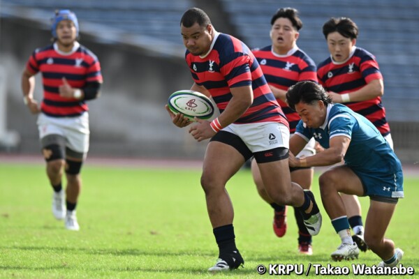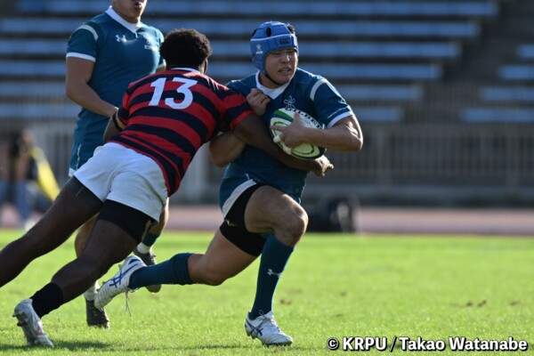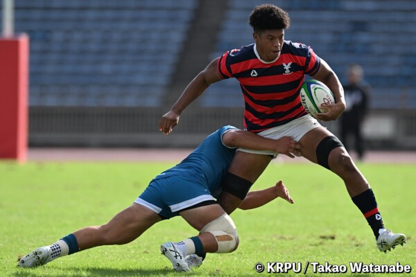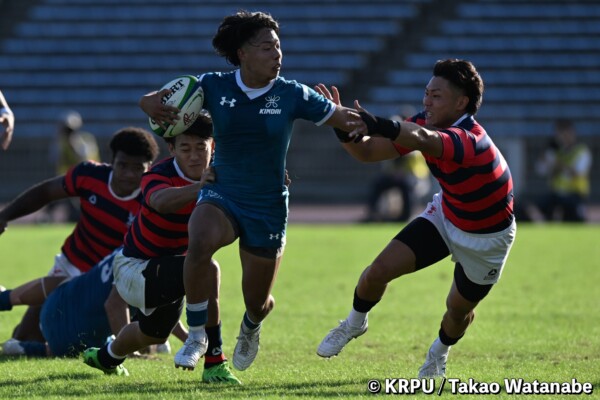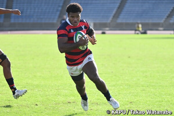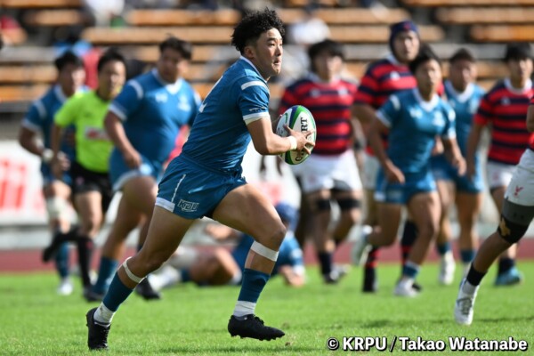 京産大は終了間際の39分にも、ゴール前5Mラインアウトからモールで取り切れなかったものの左へボールを散らし、最後は後方から走り込んできた⑬エロニへパス、そのまま駆け抜けてトライ(GK成功)でリードを広げて前半を終える。(28-7)