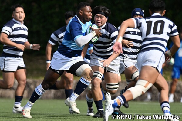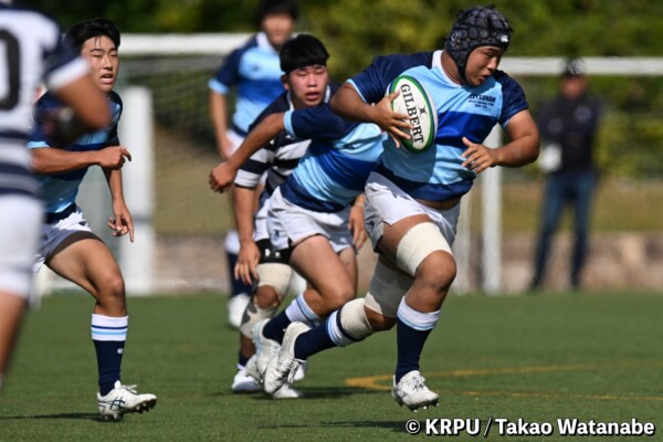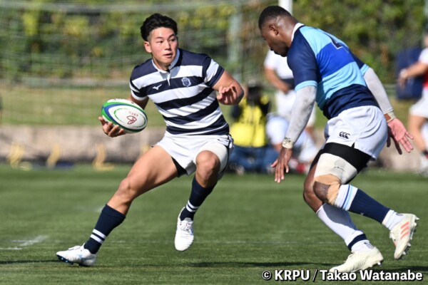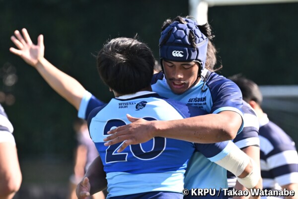 36分には、摂南大が相手ボールのLOをFL⑥大島優輝が取って、そのまま抜ける。その後をフォローしていたロック⑤レンズ・モルンガへつなぎ、最後はロック④ショー・アミニアシが右中間にトライ。GKもSO⑩川上凌空が成功。7-17