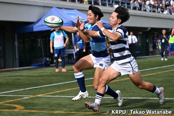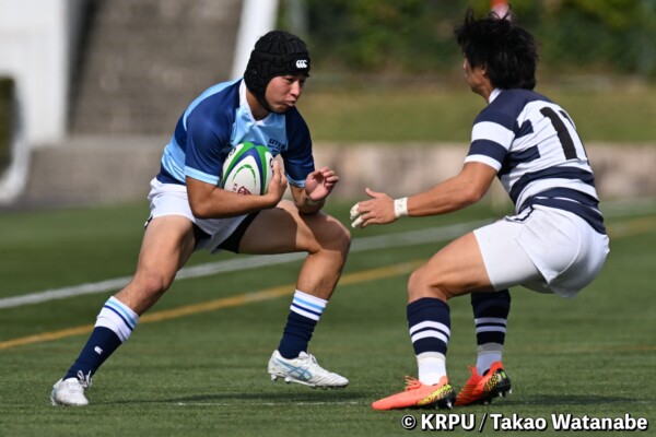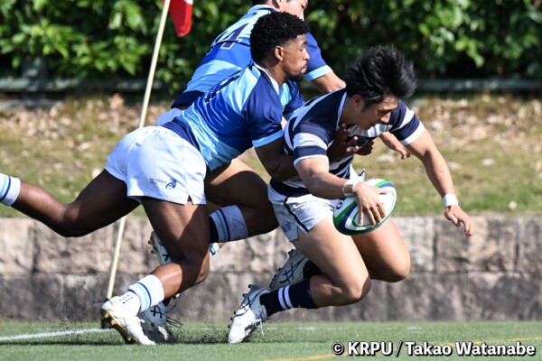 17分には、関西大がLOからバックスに展開、ポイントを作った後、⑩→⑬→⑭と繋ぎ、ウイング⑭正田青海が左サイドを大きくゲイン、最後はFB⑮立石和馬が左隅にトライ。GK不成功。19-20