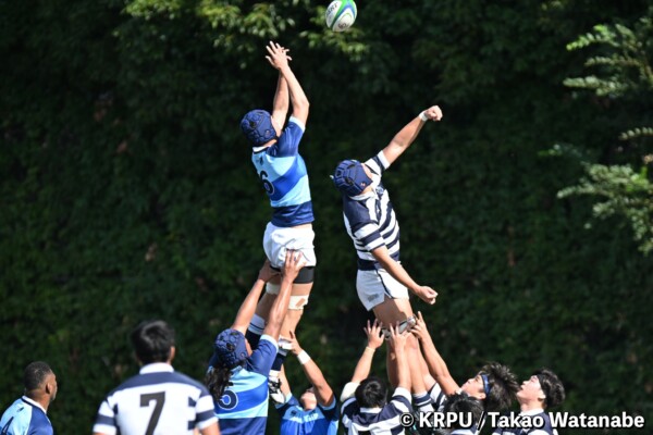 開始11分、関西大が相手ゴール前20m付近のラインアウト(LO)からモールをしっかりと組み、そのままゴールラインまで押し込み、最後はフッカー②山本真士が左中間に先制トライ。GKもSO⑩崎田士人が成功。7-0