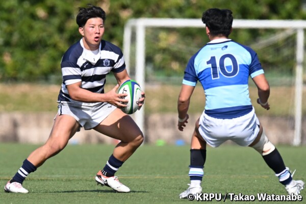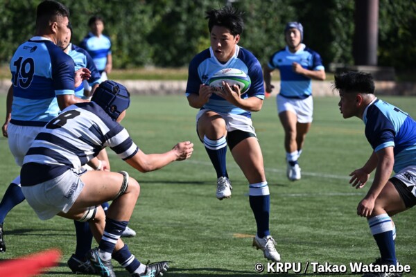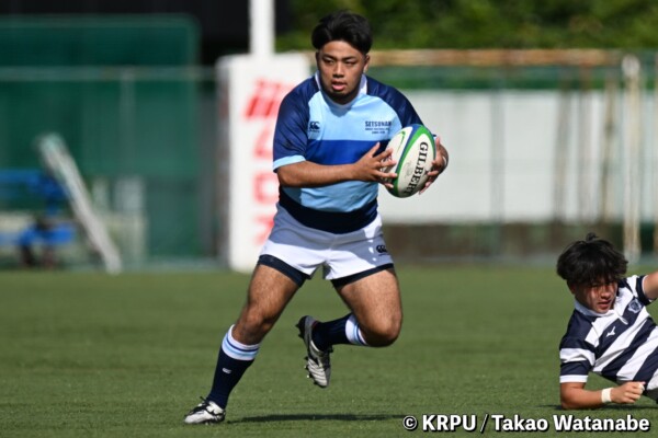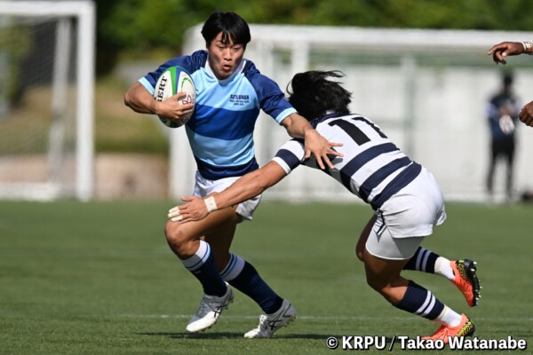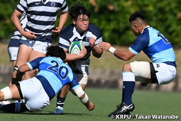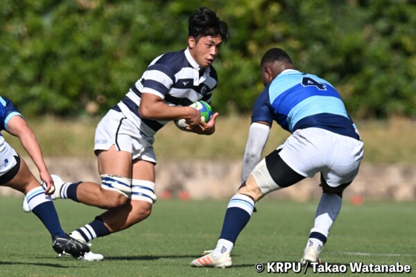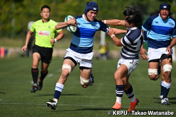 5分に、摂南大センター⑫嶋本大賀が相手のノッコンを誘う強烈なタックル。それで得たスクラムでも相手のペナルティを誘い。PGをSO⑩川上凌空が成功。7-20