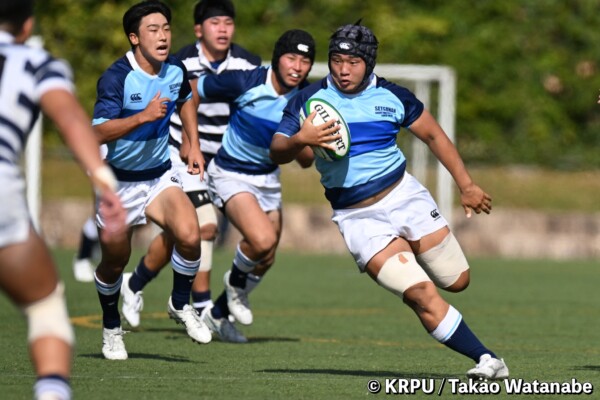 30分には、摂南大がスクラムからバックスに展開し、センター⑫嶋本大賀がロングゲイン、素早いリサイクルから、最後はSH⑨松下宇宙がインゴールに飛び込みトライ。GKもSO⑩川上凌空が成功。7-10