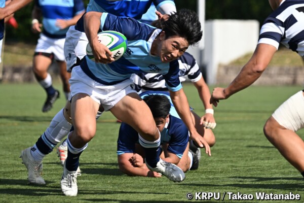 9分に、関西大がLOからモールをしっかりと組み、そのままゴールラインまで押し込み、最後はフッカー②山本真士が右中間にトライ。GKもSO⑩崎田士人が成功。14-20