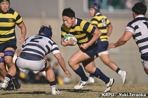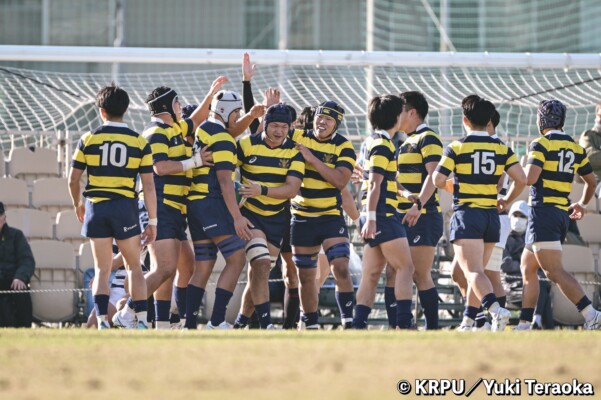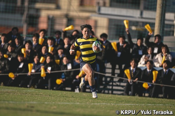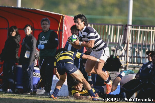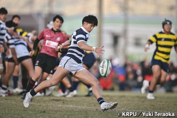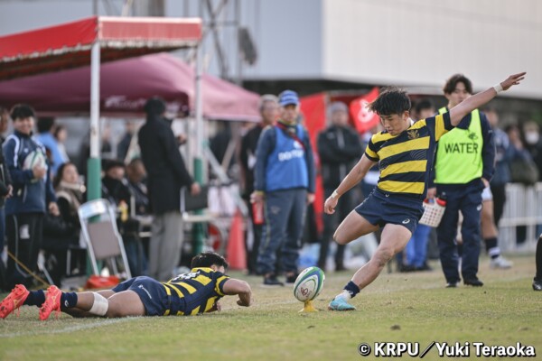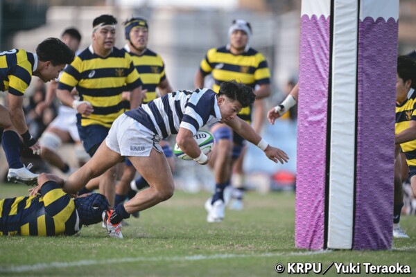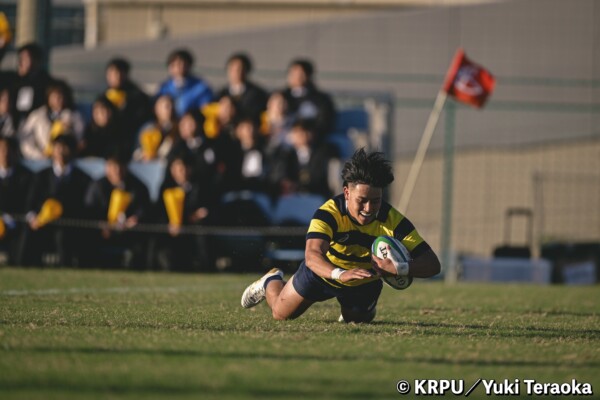 前半は風上である関西大学のキックオフで開始。最初にスコアしたのは関西大学。