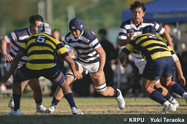 ロスタイムに入った48分、一矢報いたい関西大学。敵陣ゴール前でペナルティを得て、FWが攻め込みフェーズを重ねLO⑤中村豪選手がトライ。⑩立石選手のGKは決まらずノーサイド。(8―38)