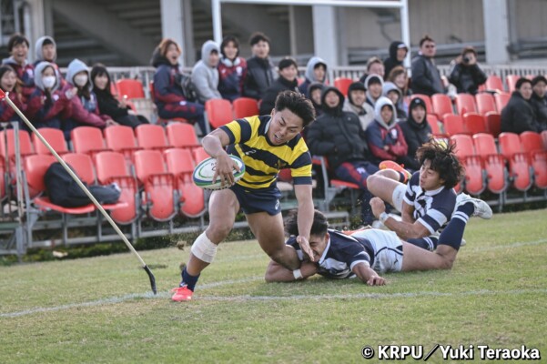 39分、立命館大学FB⑮樋川蔵人選手が自陣22mからこぼれ球を拾い、ディフェンスを振り切りSO⑩山下選手に渡り中央にトライ。そのままGKも決める。(3-19)