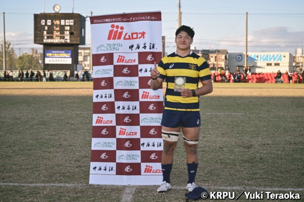 POMはこの日、先制トライを取り、また攻守に渡り身体を張ったプレイを見せてくれた立命館大学⑥榎本匡志選手が選ばれた。