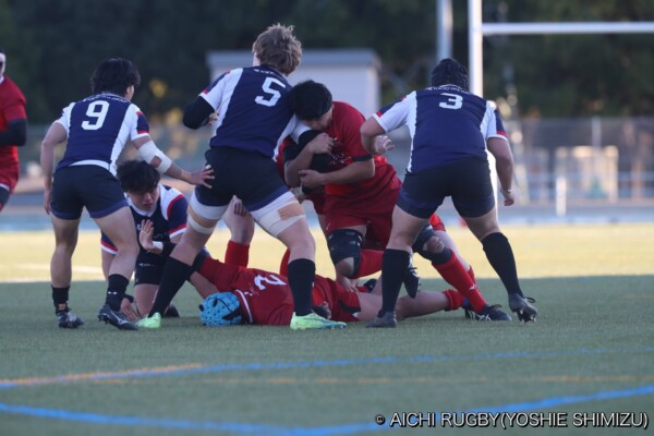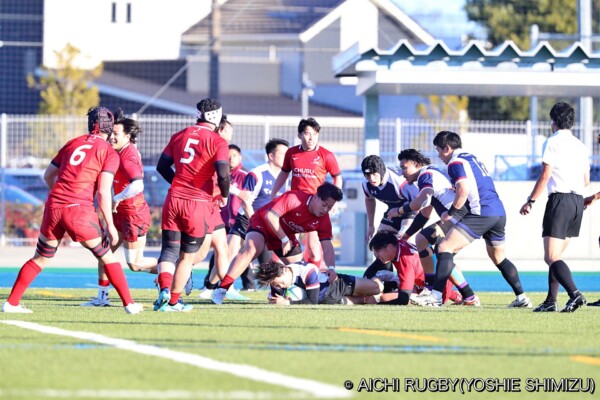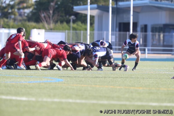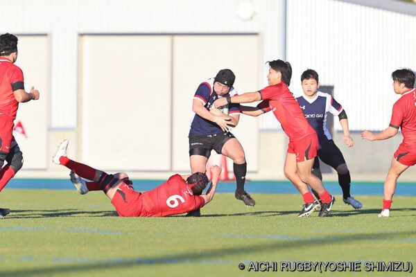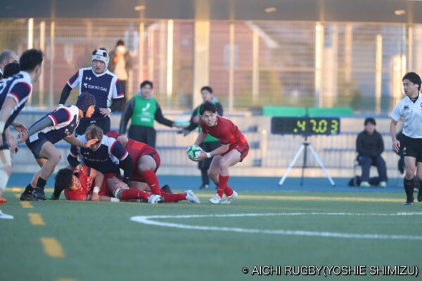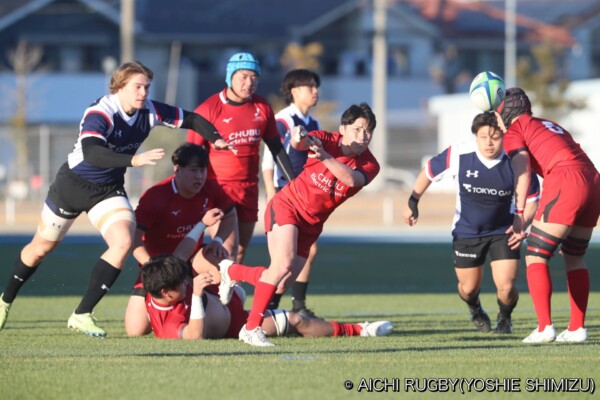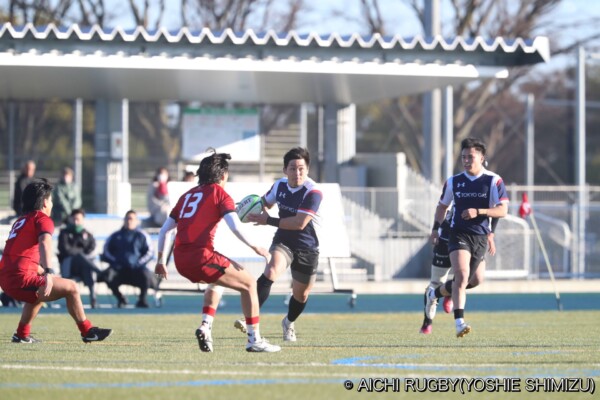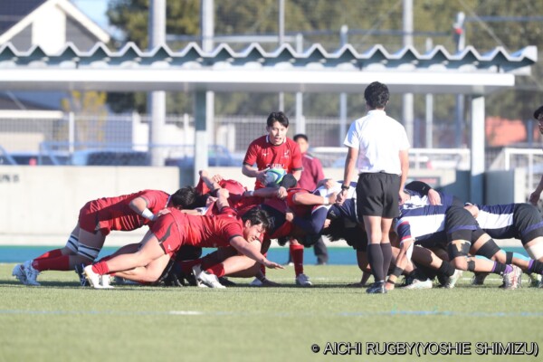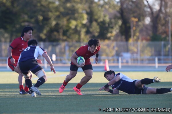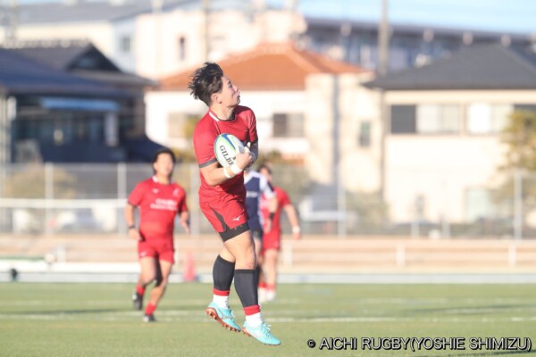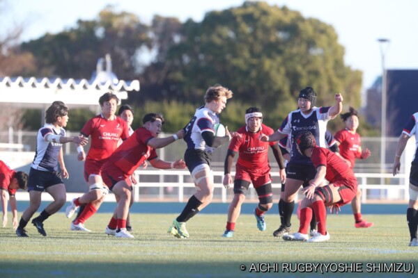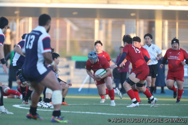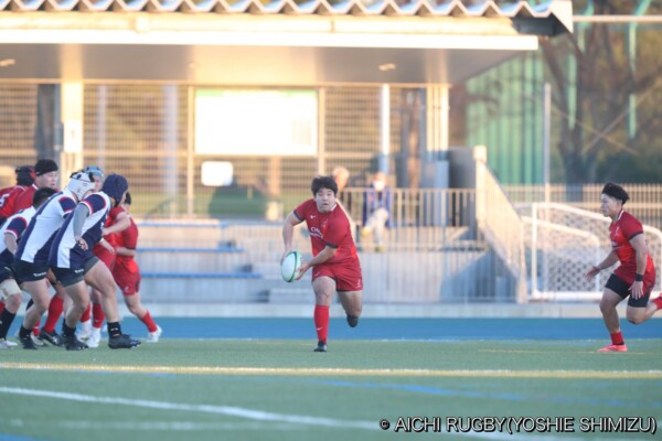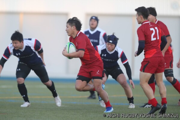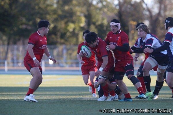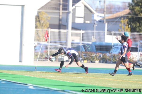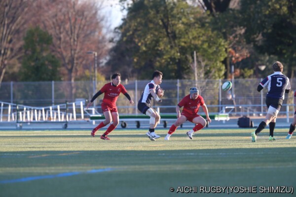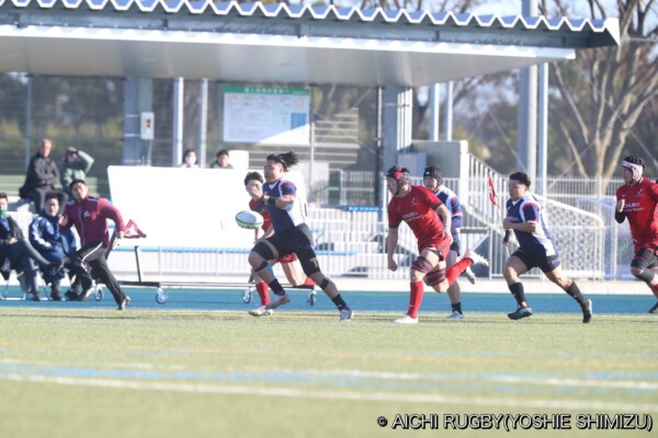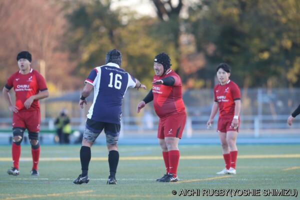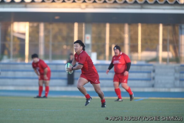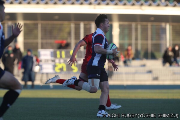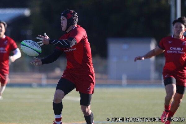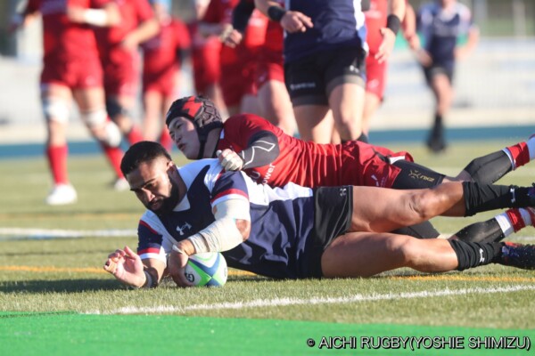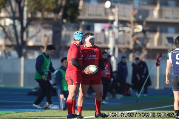 引き離されたくない中部電力は、相手陣22m内側へ入り、さらに、相手ペナルティーからキックで前進、前半31分、相手ゴール前5m外側右ラインアウトから攻め、ゴール前のラックから⑨西川敢太がショートサイドの⑦石田翔吾へパス、右隅へ飛び込みトライ、8-22とする。
