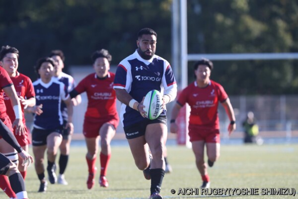 次のトライは東京ガス、前半23分、相手陣22m右でのスクラムから左へ展開、⑩西仲から⑬タウタラタシへパスが渡ると縦に抜けゴールポスト左へトライ(⑩西仲コンバージョン成功)、22-3とする。