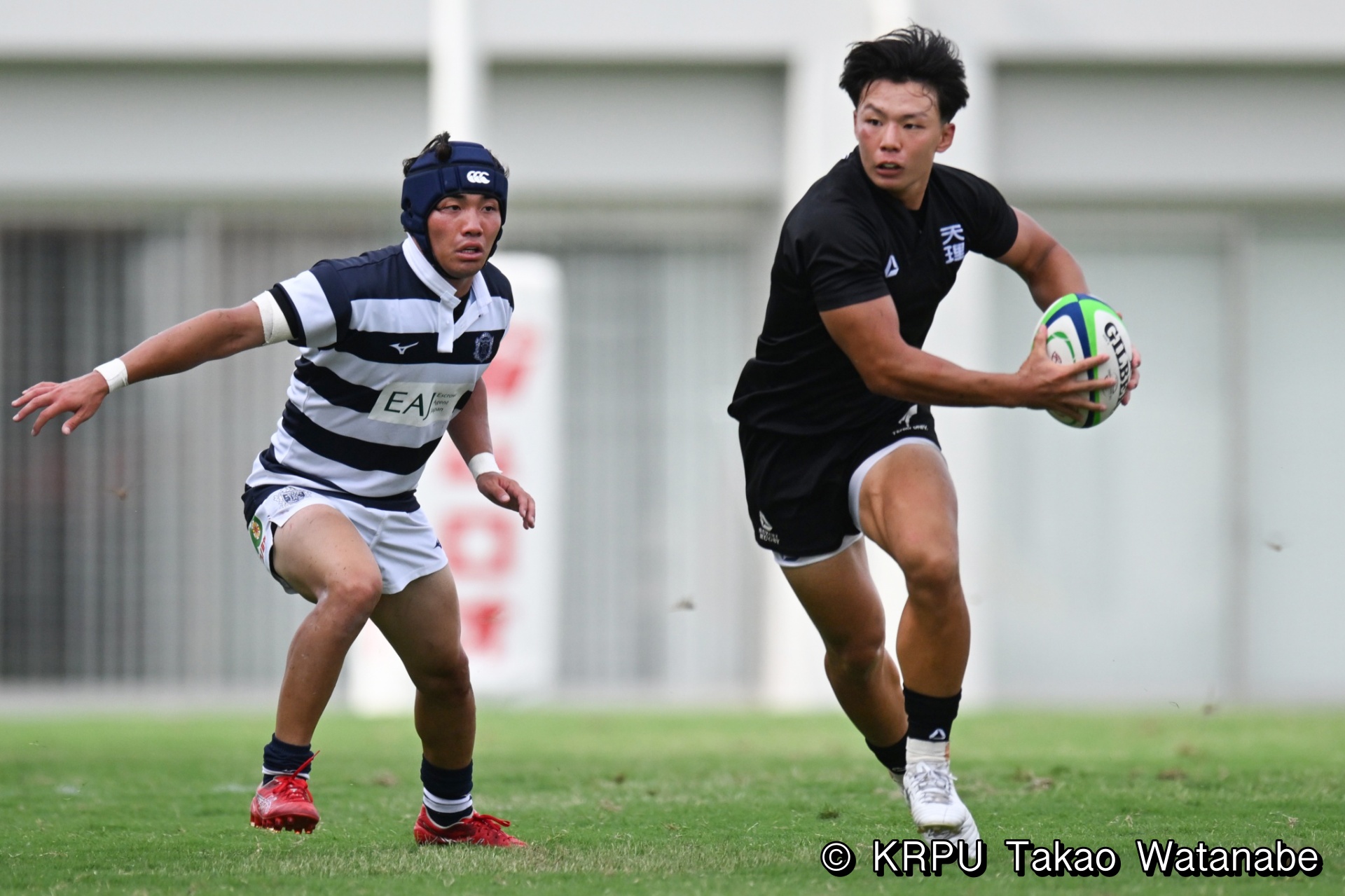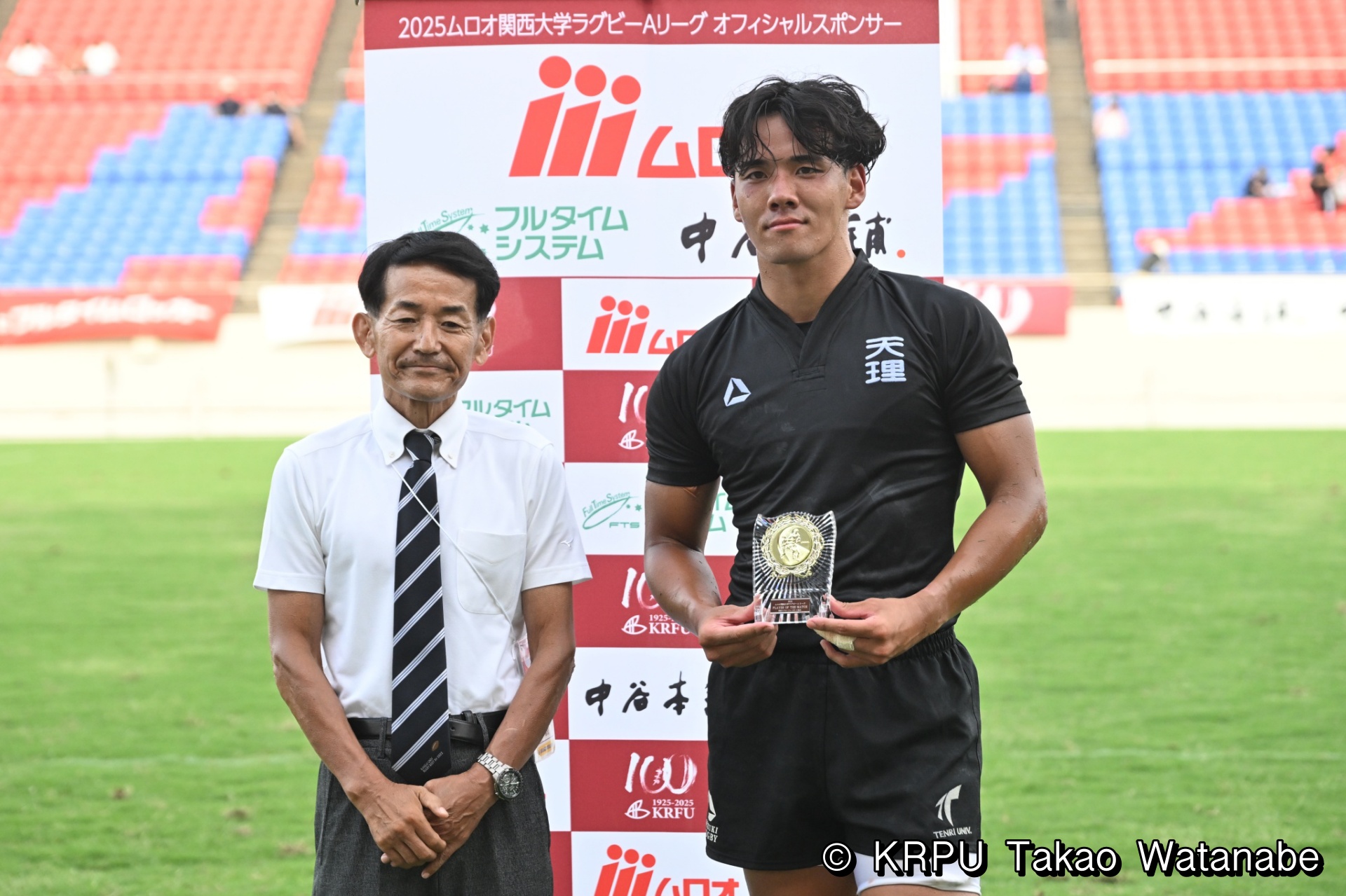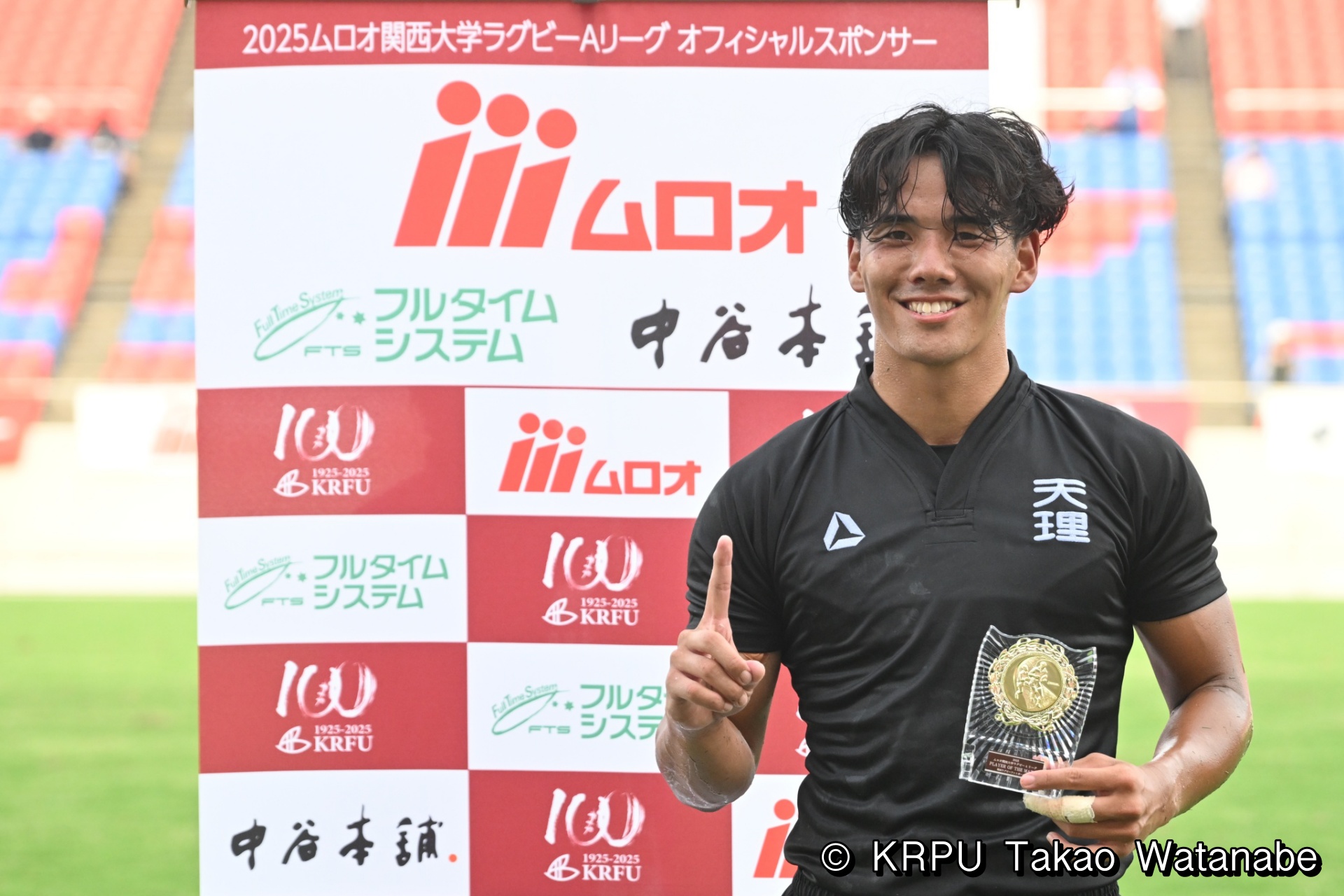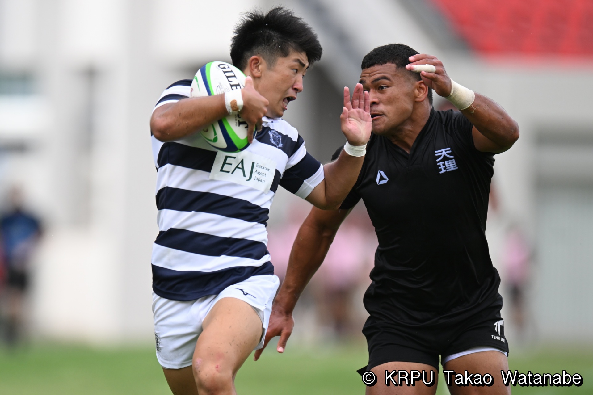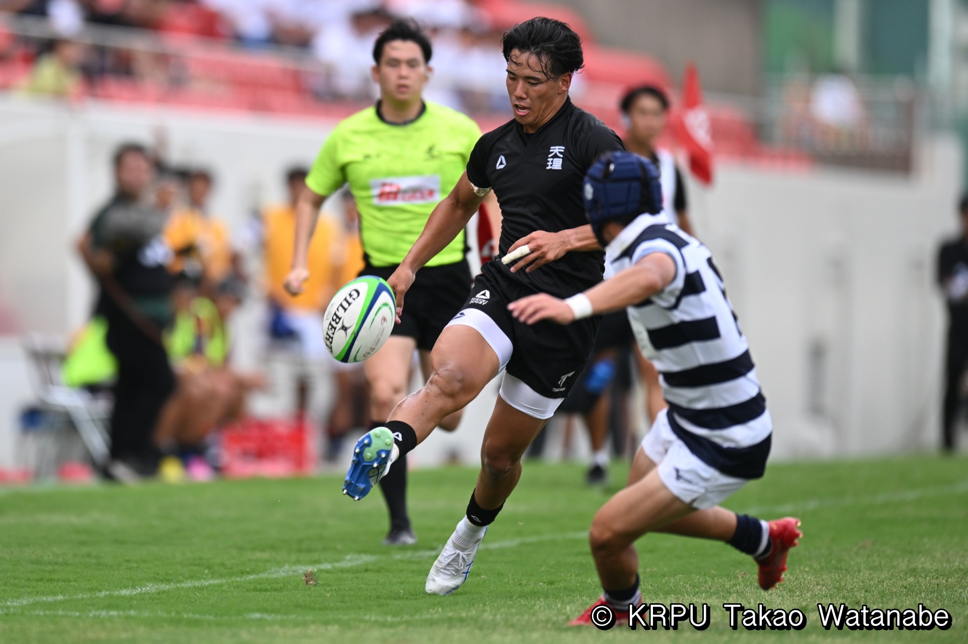 関西大は前半、天理大ゴールに迫るテンポの良い攻撃も見られたが、ミスでチャンスを逸したのが悔やまれる。POMには、随所での的確な判断やゴールキックで勝利に貢献した天理大のSO⑩上ノ坊駿介が選ばれた。
