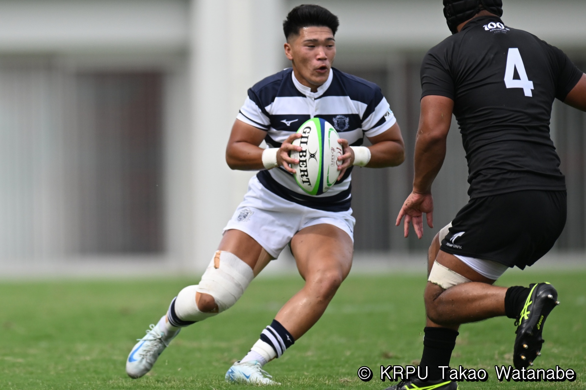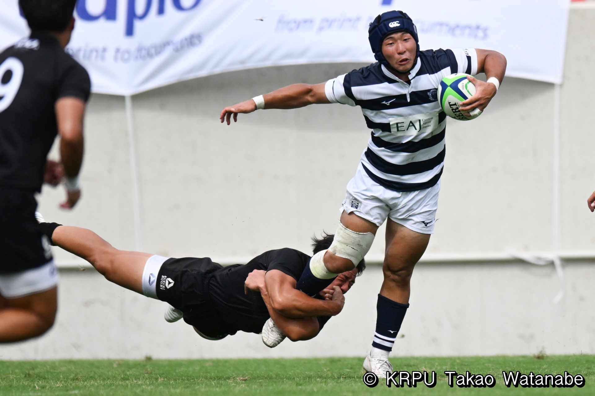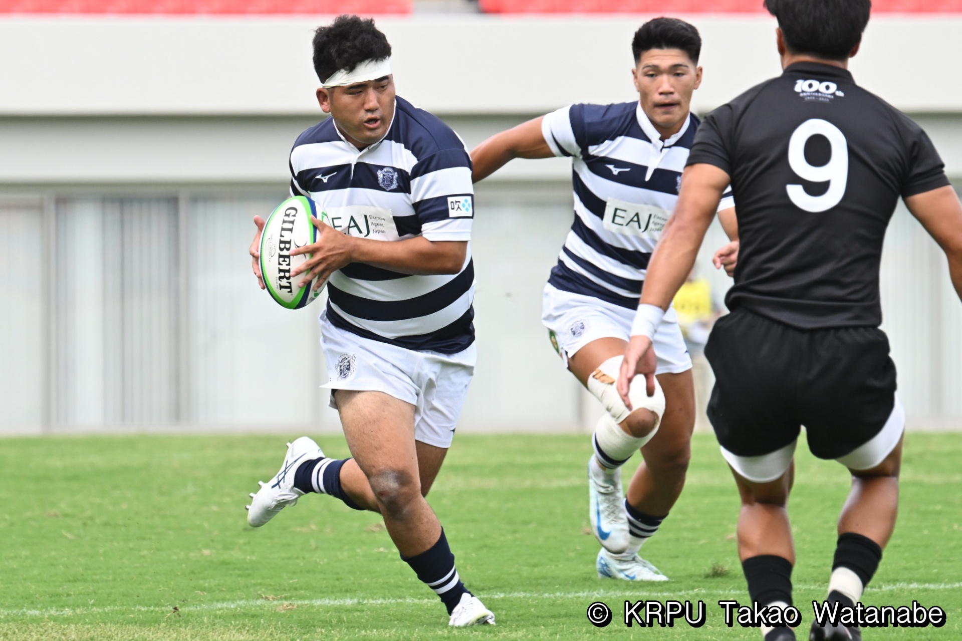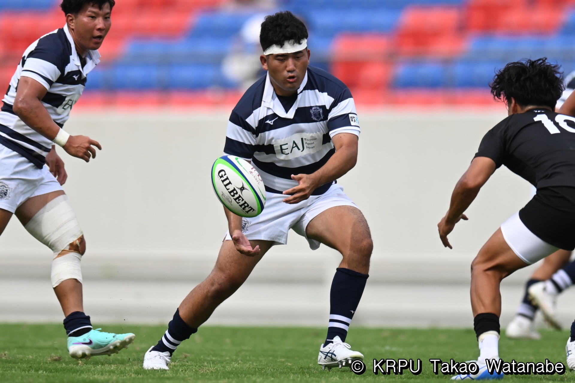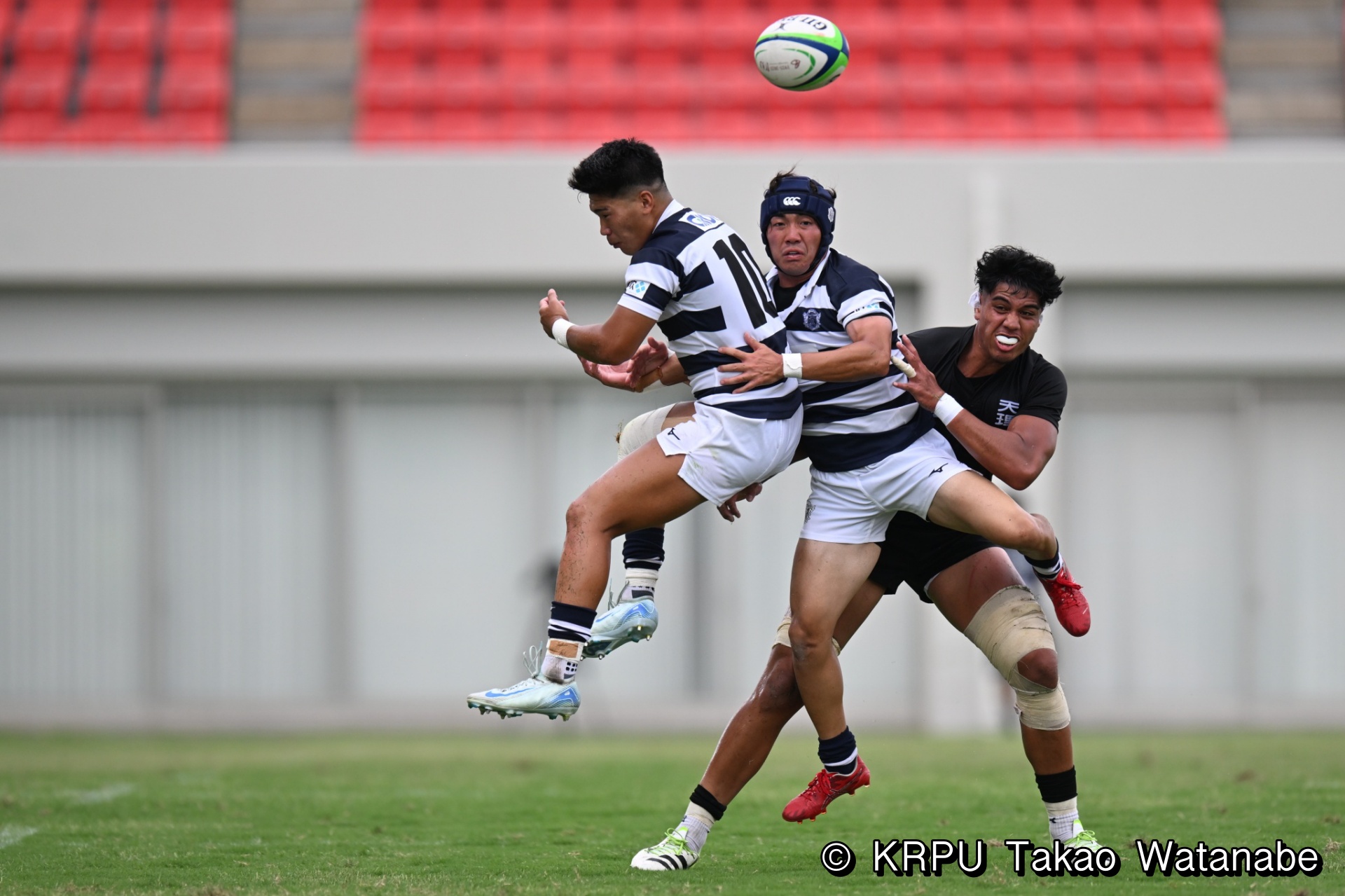 関西大は前半、天理大ゴールに迫るテンポの良い攻撃も見られたが、ミスでチャンスを逸したのが悔やまれる。POMには、随所での的確な判断やゴールキックで勝利に貢献した天理大のSO⑩上ノ坊駿介が選ばれた。