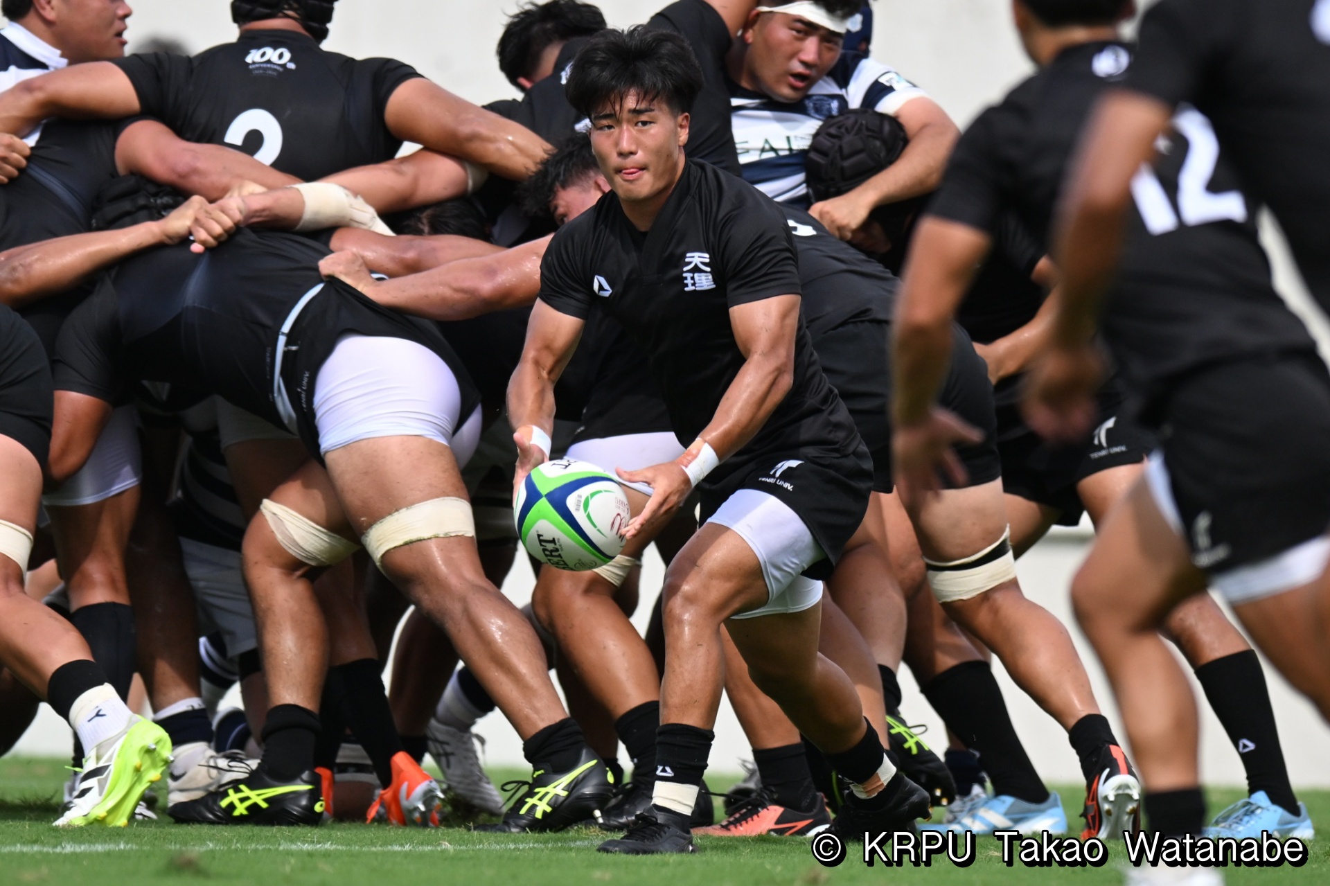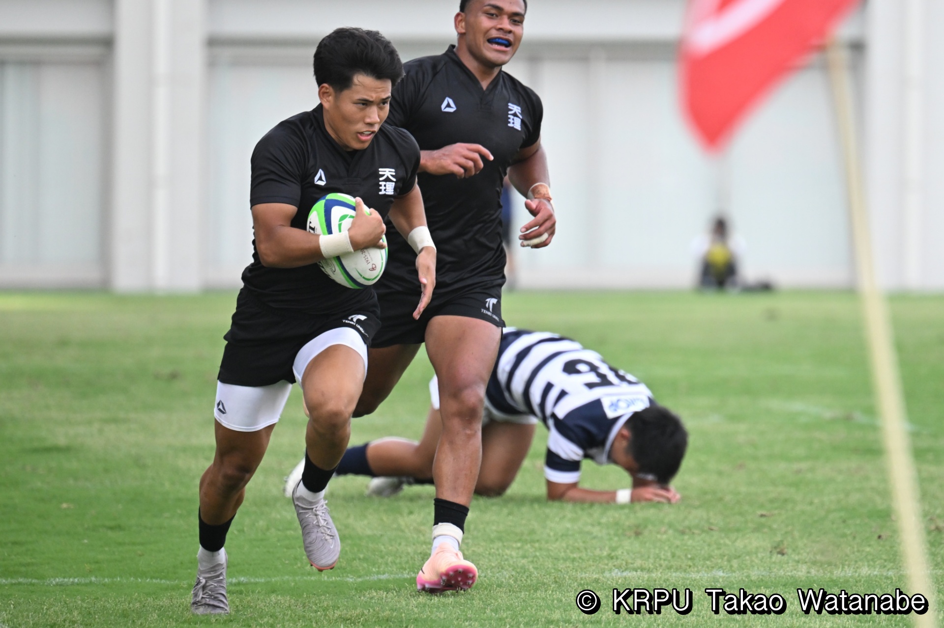 天理大のSO⑩上ノ坊のキックオフで後半開始。まず3分、天理大がゴール前ラインアウトから連続攻撃を重ね、最後はSH⑨朝倉が右中間にトライ。GKもSO⑩上ノ坊が成功して0-24。