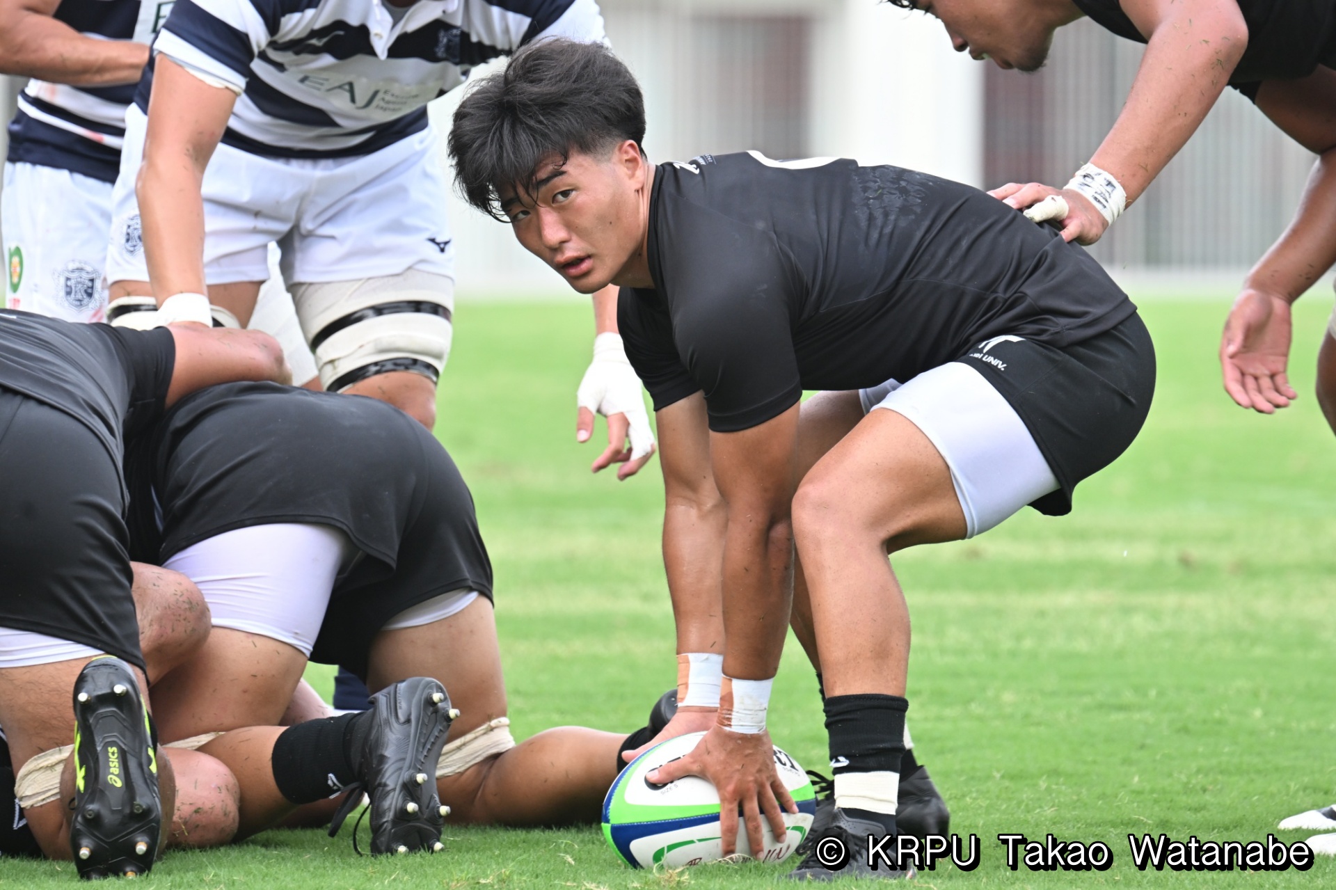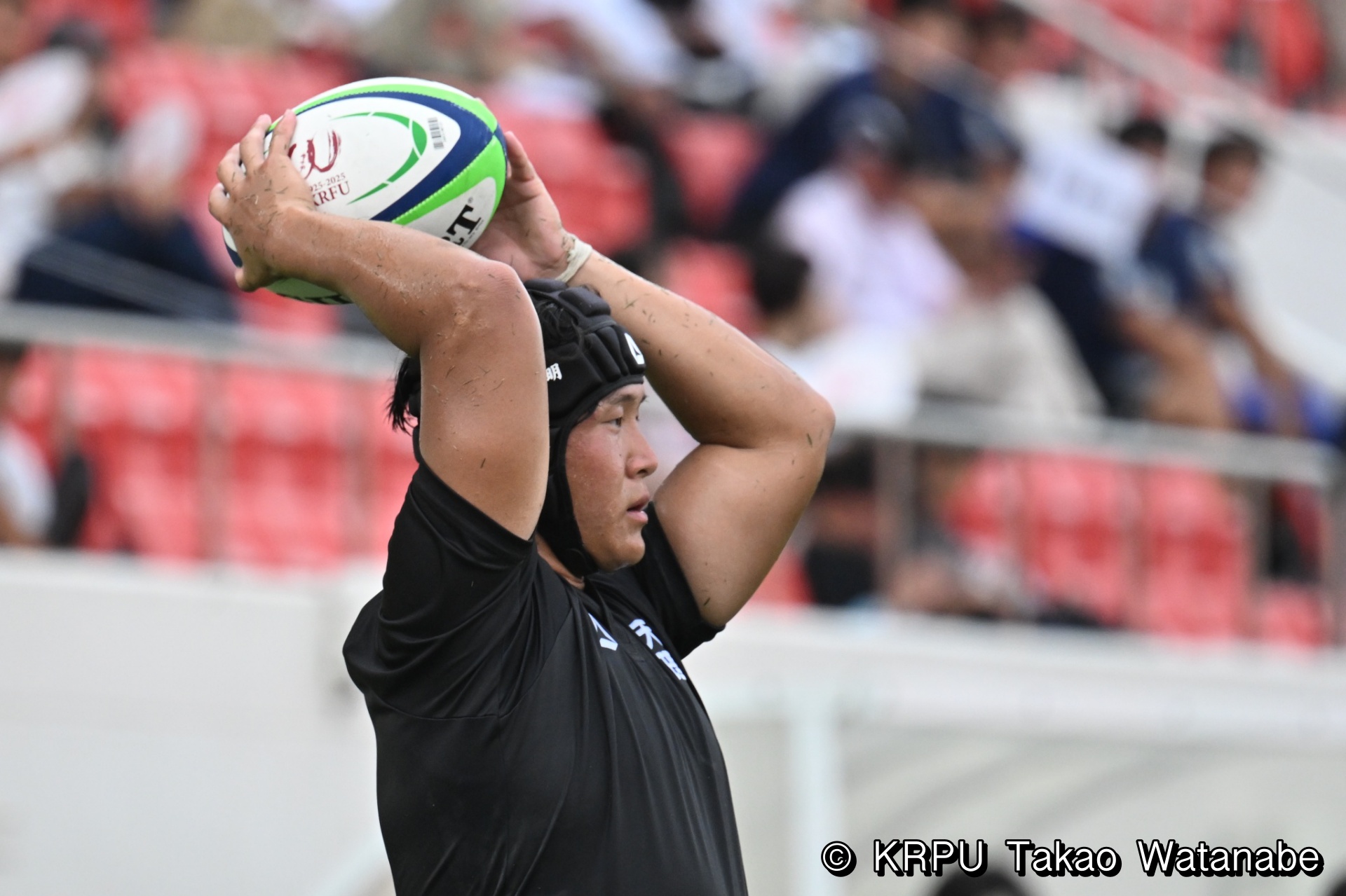 まずは6月の不祥事で、皆さまに大変ご迷惑・ご心配をおかけいたしました。申し訳ございませんでした。本日、こうして試合ができたことに大変感謝しております。春のトーナメント戦は最下位で、このリーグ戦は相手がどこであれ、しっかり試合をしようという気持ちでやってきました。その中で、ディフェンスでプレッシャーをかけ、スクラムも頑張れていたと思います。まだ修正点や未完成な部分もありますが、試合の中でも成長していけるよう頑張っていきたいです。