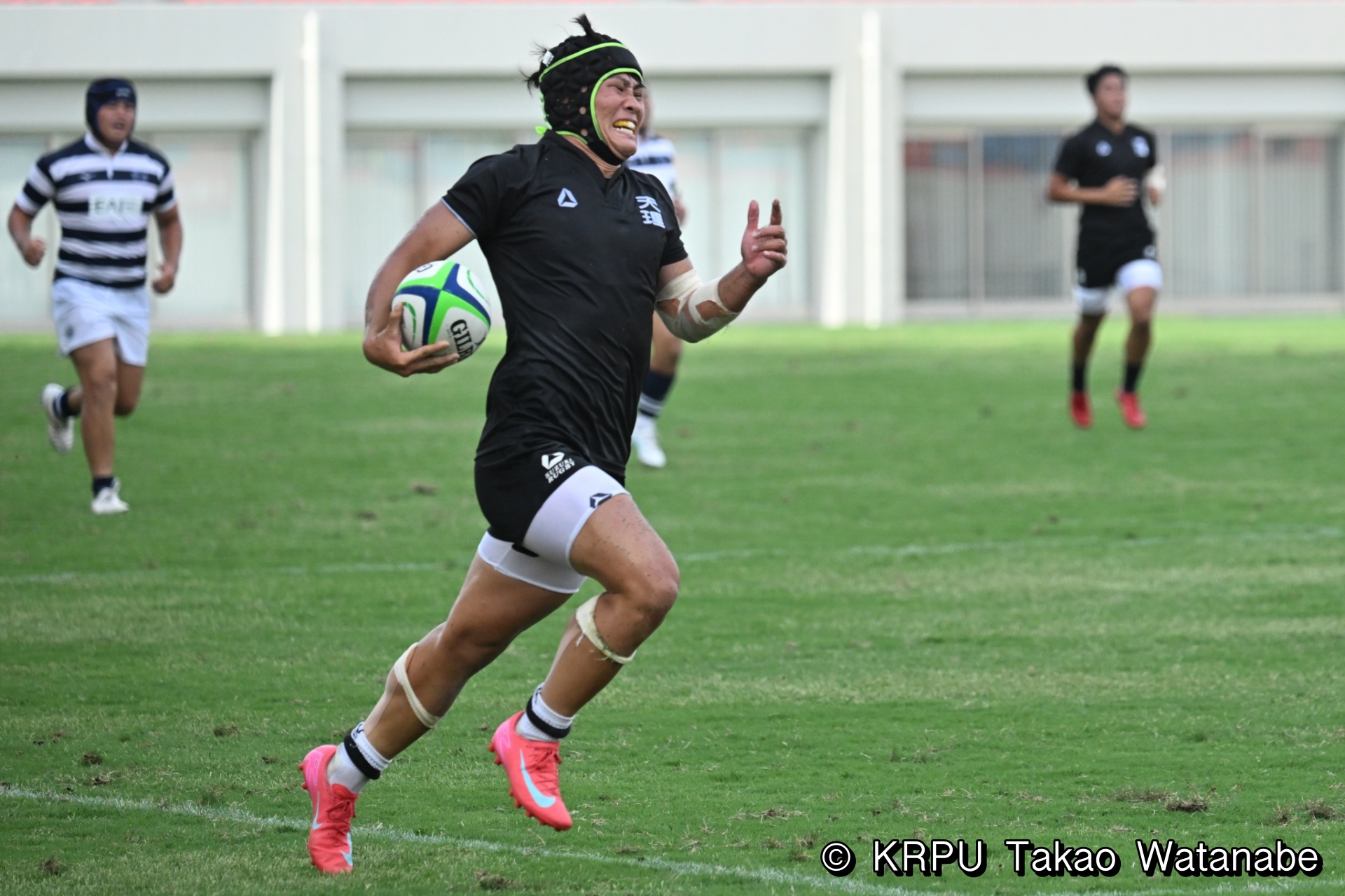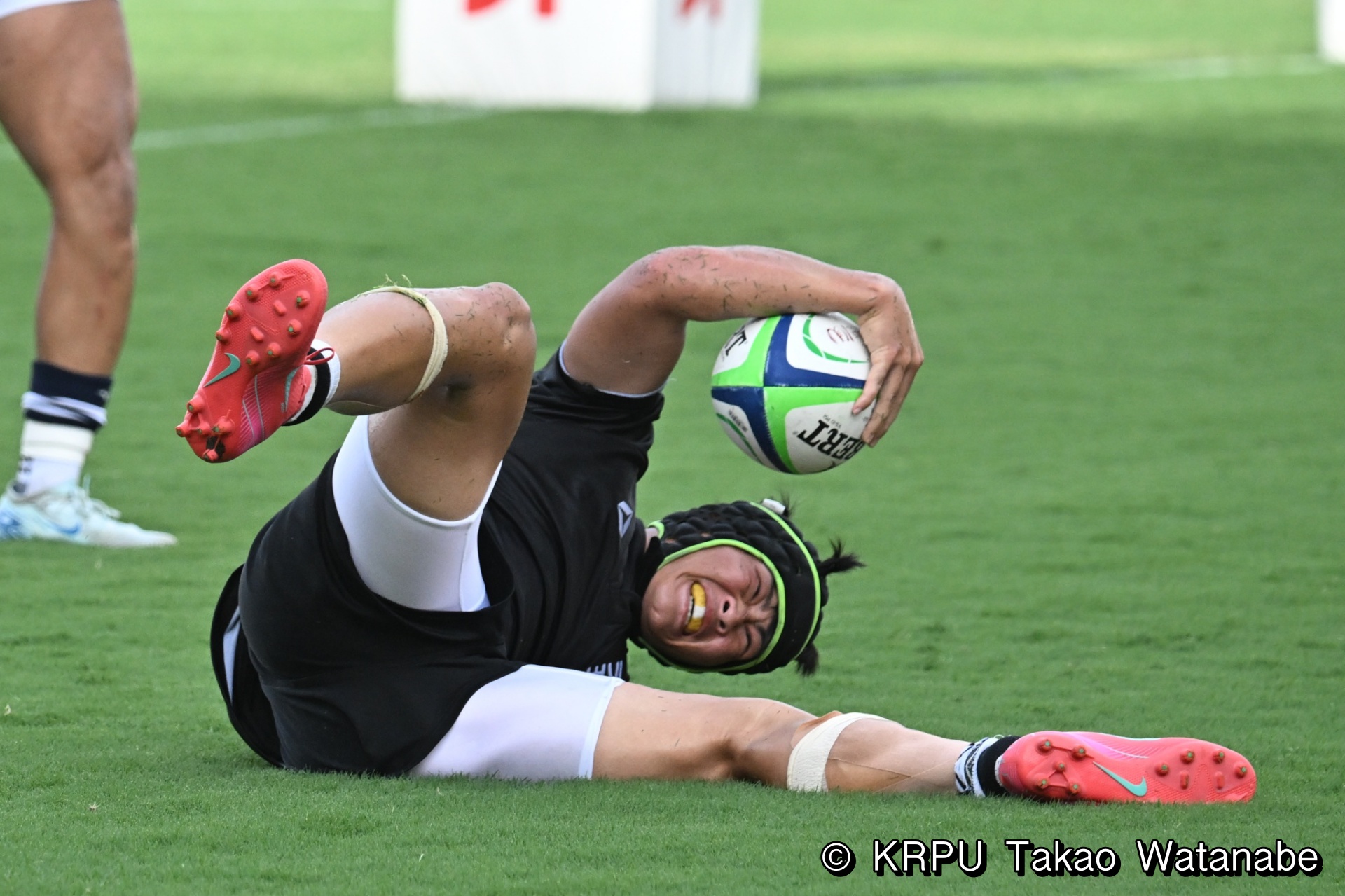 7分、相手陣10m付近でパスを受けたSO⑩上ノ坊が右タッチライン際でパントを上げ、自らキャッチして右隅にトライ。GK不成功で0-29。
