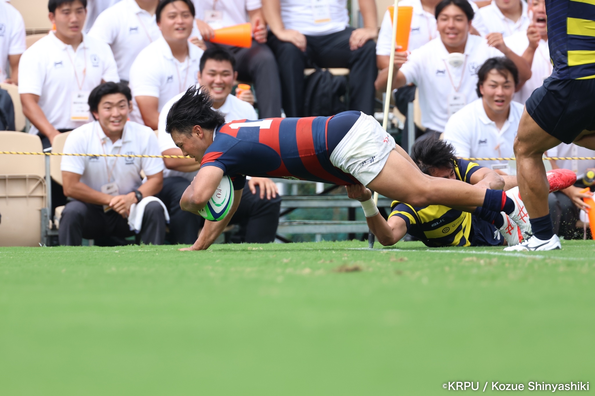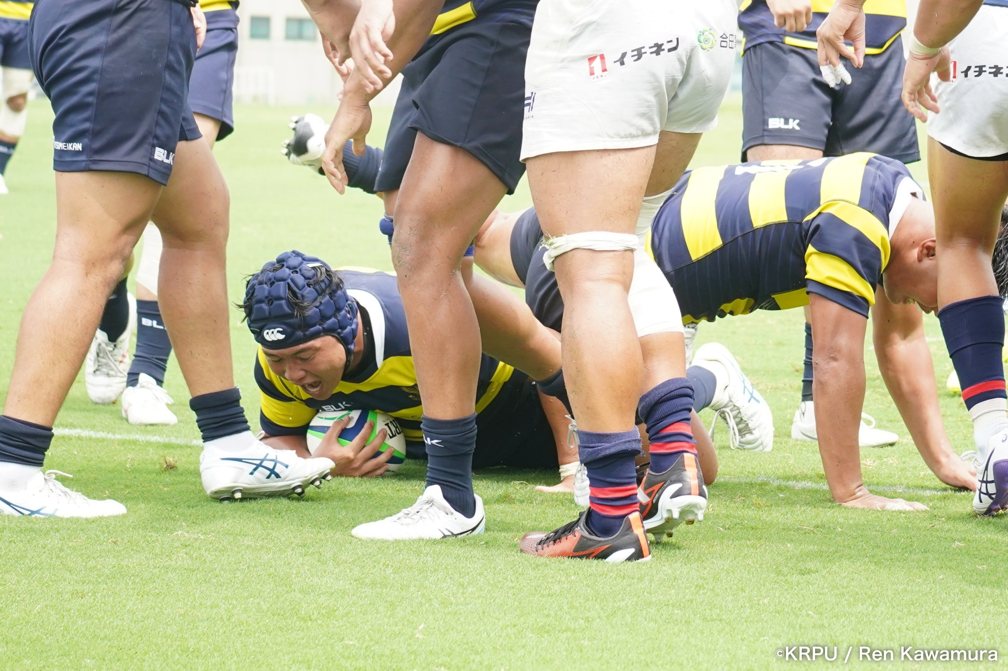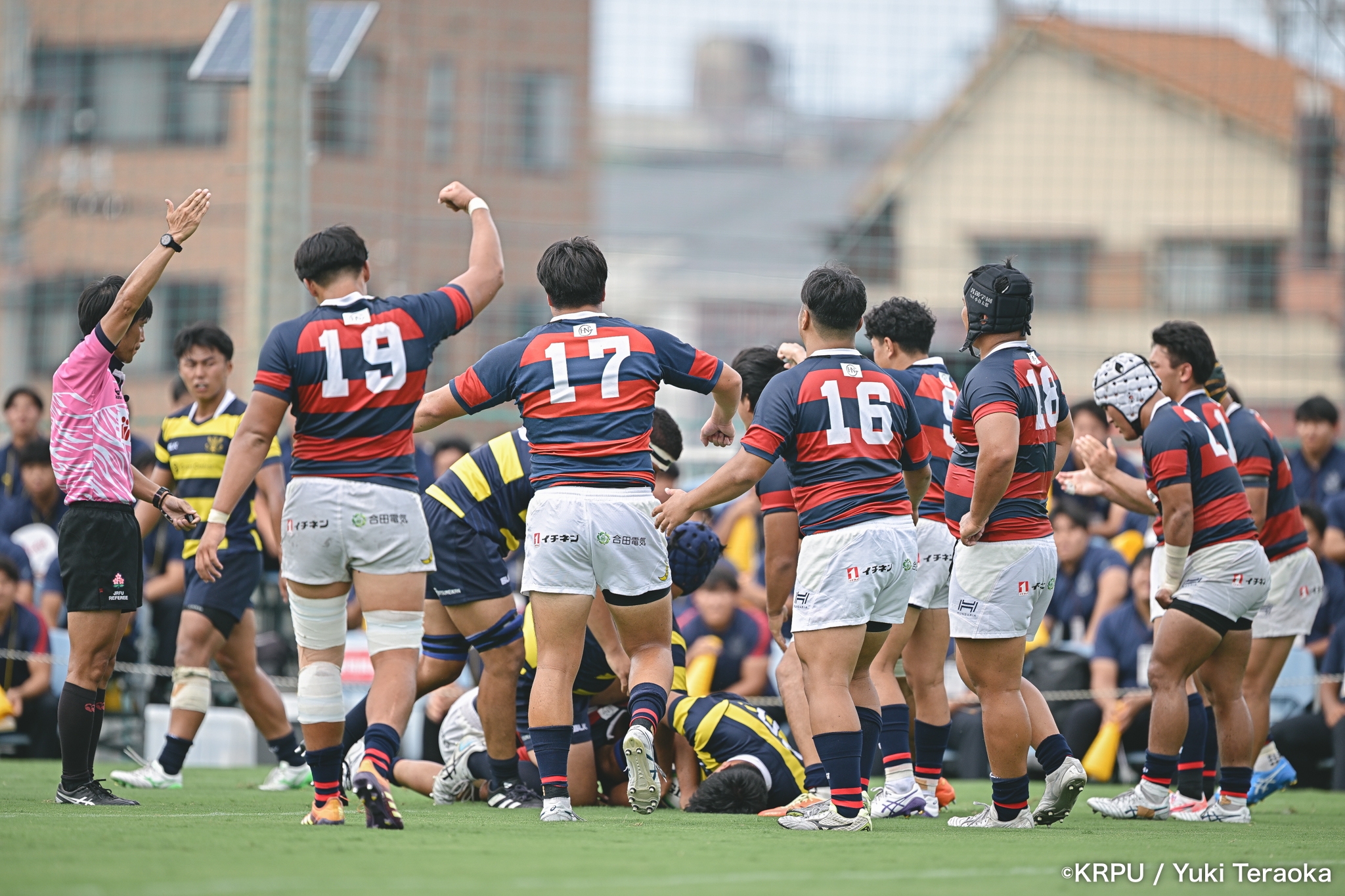続いて関学は、立命のラインアウト・モールを凌ぐと、17分、逆に自軍のラインアウト・モールを15m押し込み、HO②田中健太が右中間にトライ。SO⑩新井のゴールも決まり、24-10。
