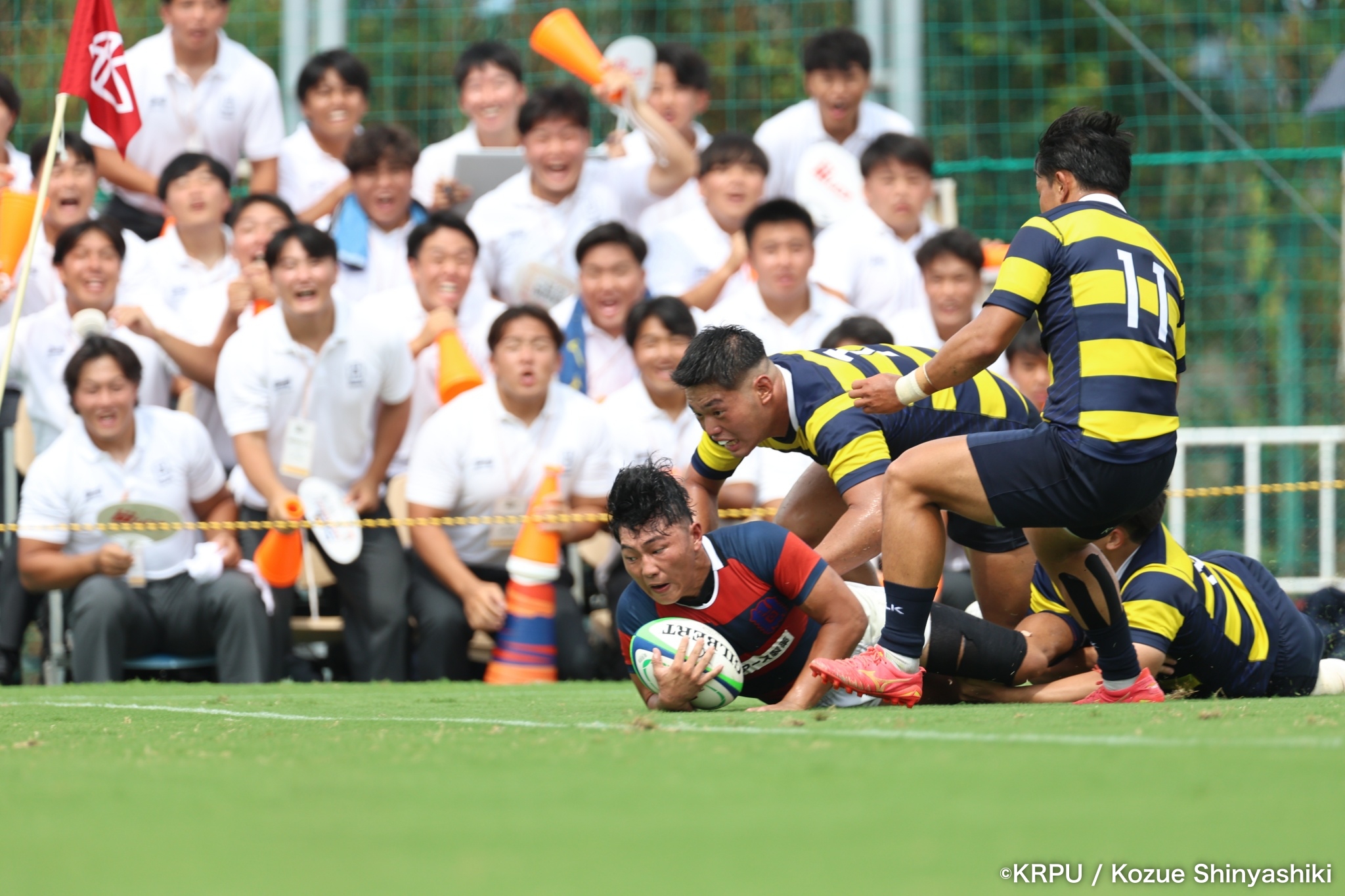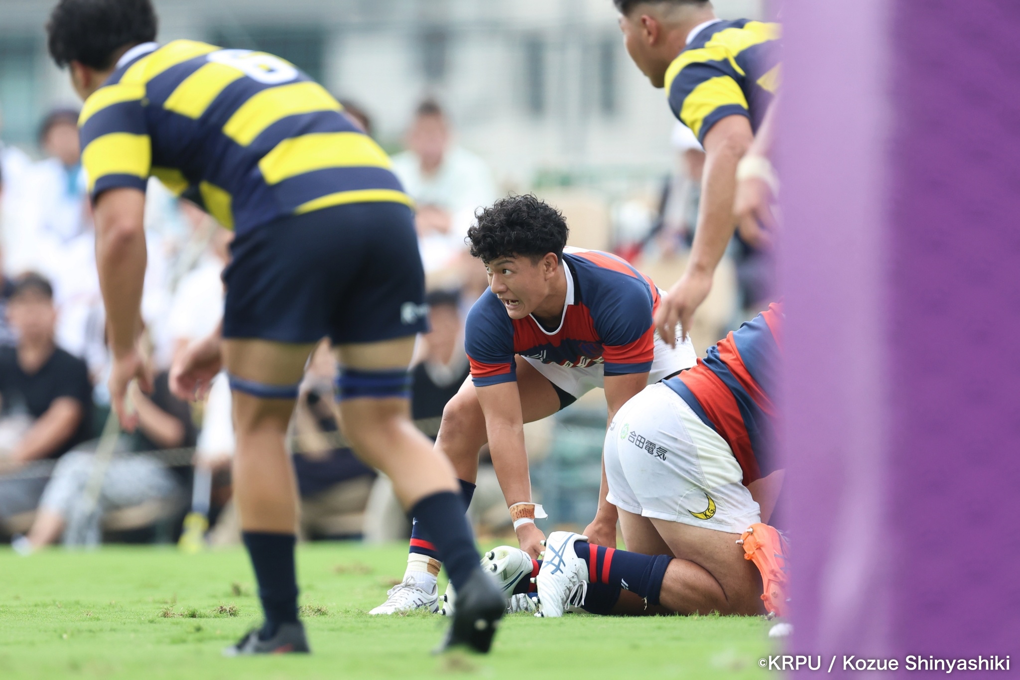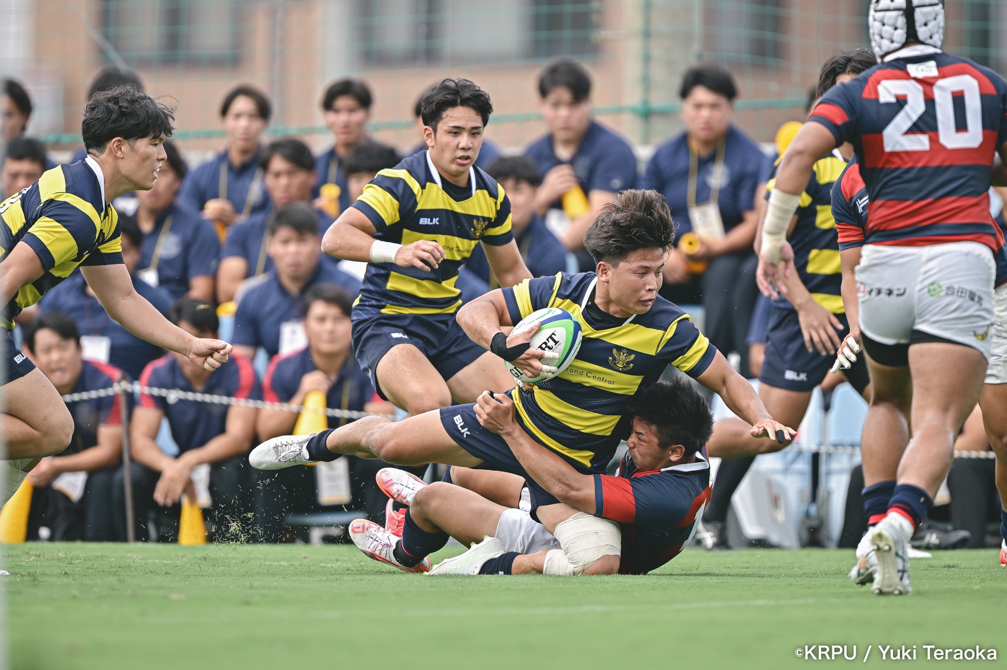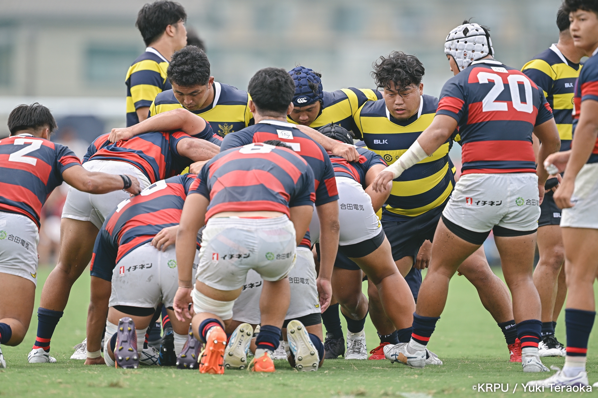 続いて関学は、立命のラインアウト・モールを凌ぐと、17分、逆に自軍のラインアウト・モールを15m押し込み、HO②田中健太が右中間にトライ。SO⑩新井のゴールも決まり、24-10。
