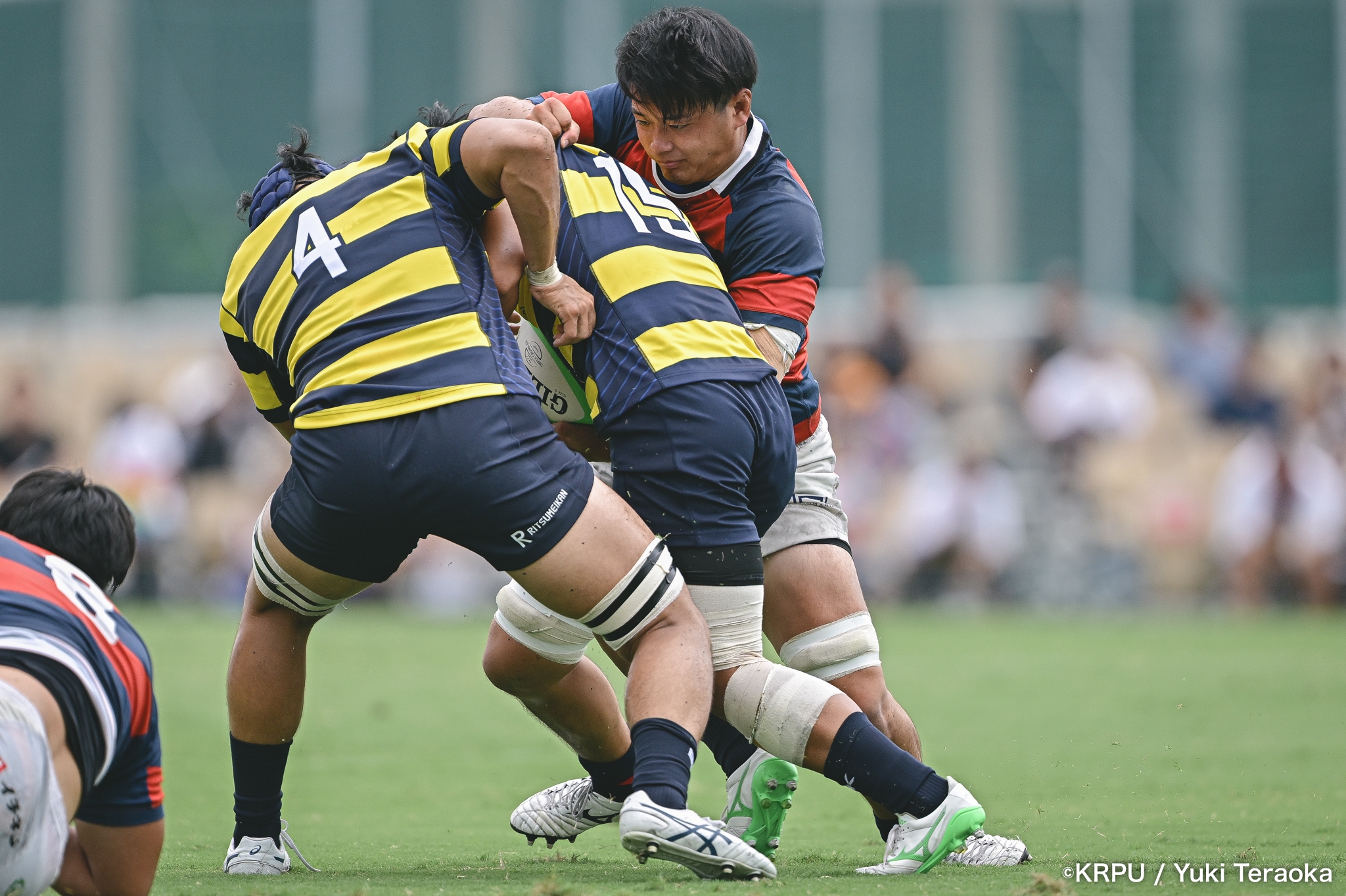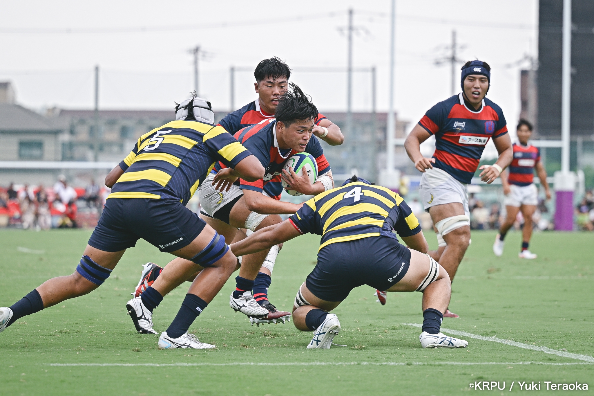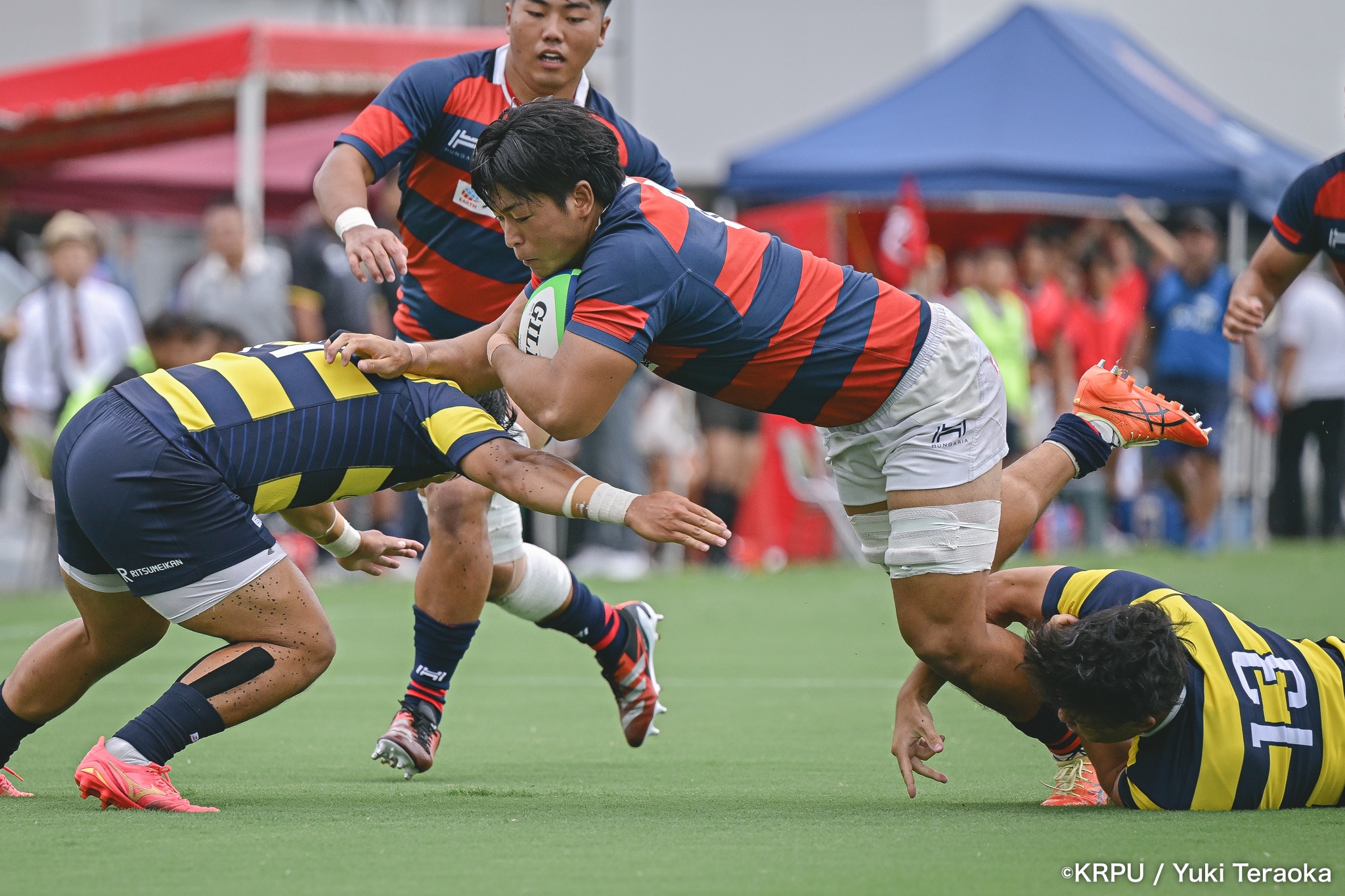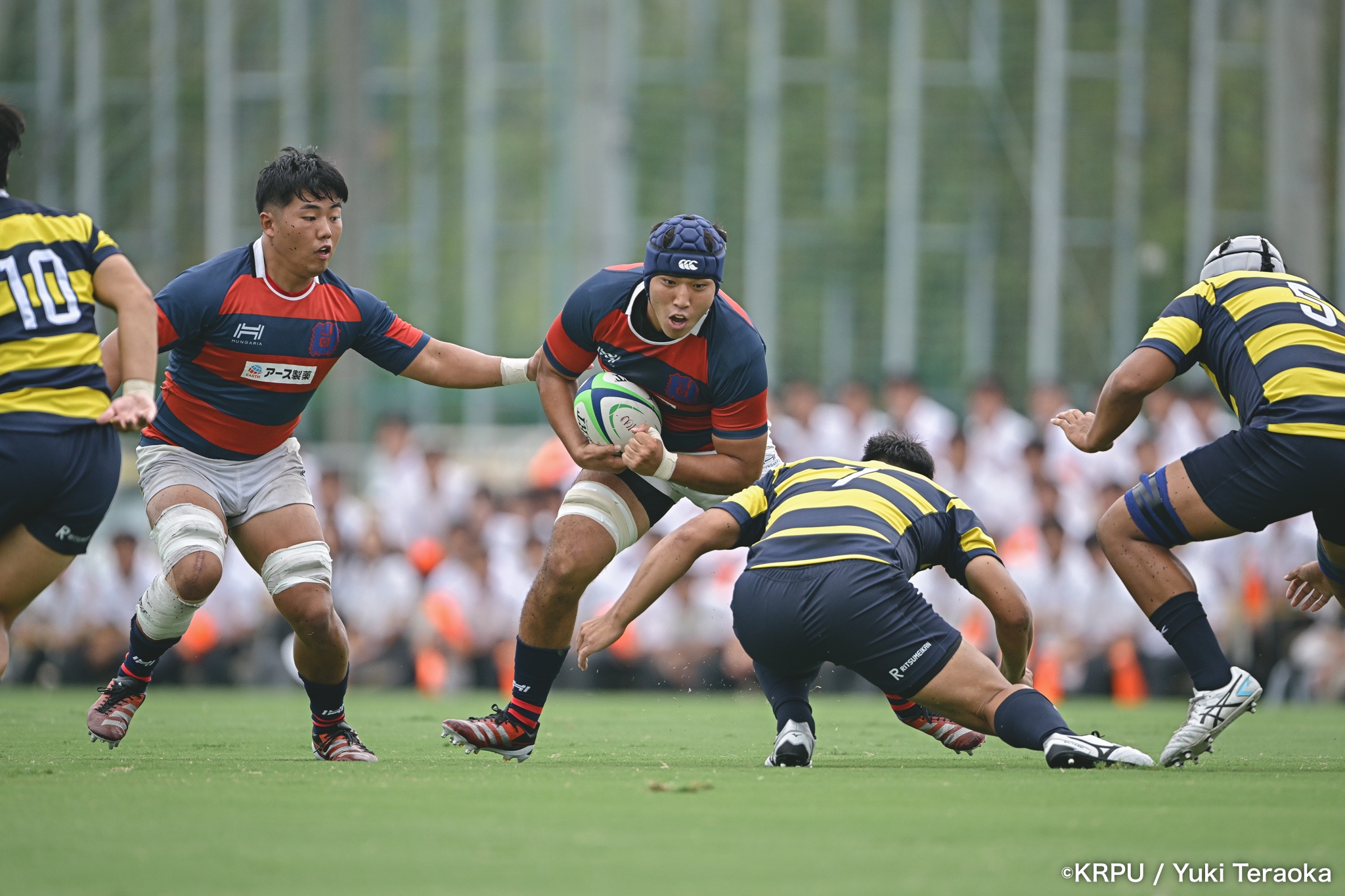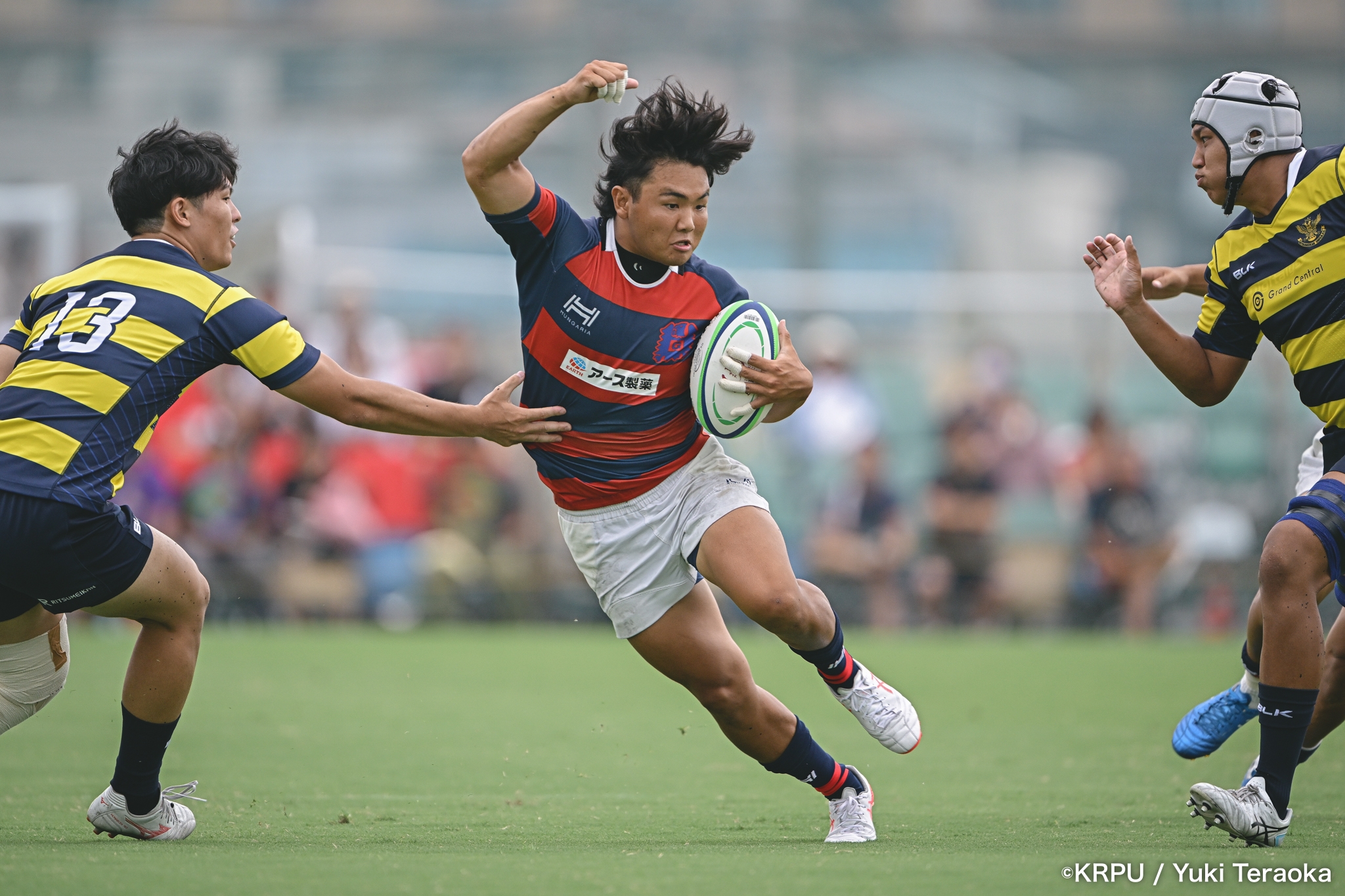 6分、立命はCTB⑫中村颯太がラインブレイクして関学陣に入るも、後が続かない。その後は関学が立命陣でアタックを続けるが、立命が激しいディフェンスで対抗。10分には関学が立命TLに迫るも、WTB⑭三浦遼太郎のスチールでピンチを脱出。