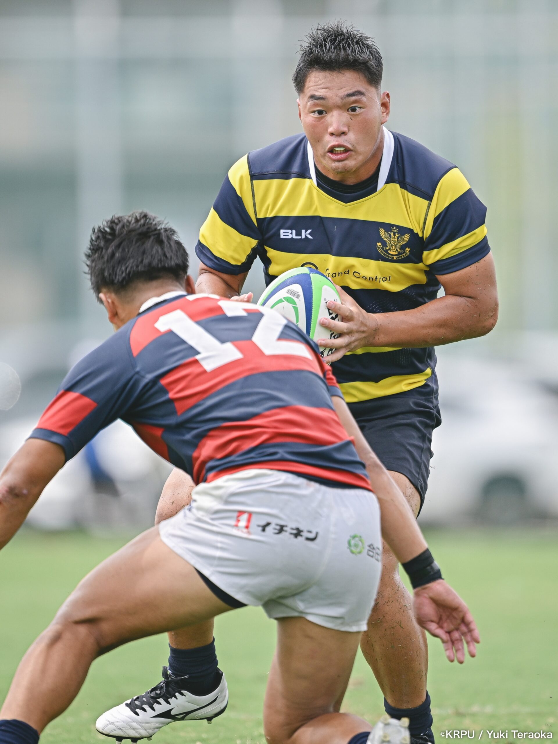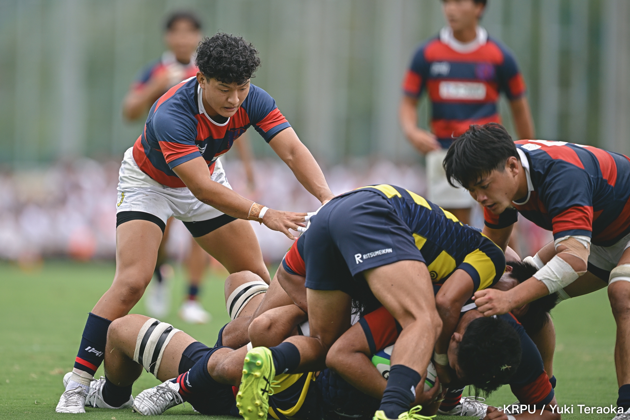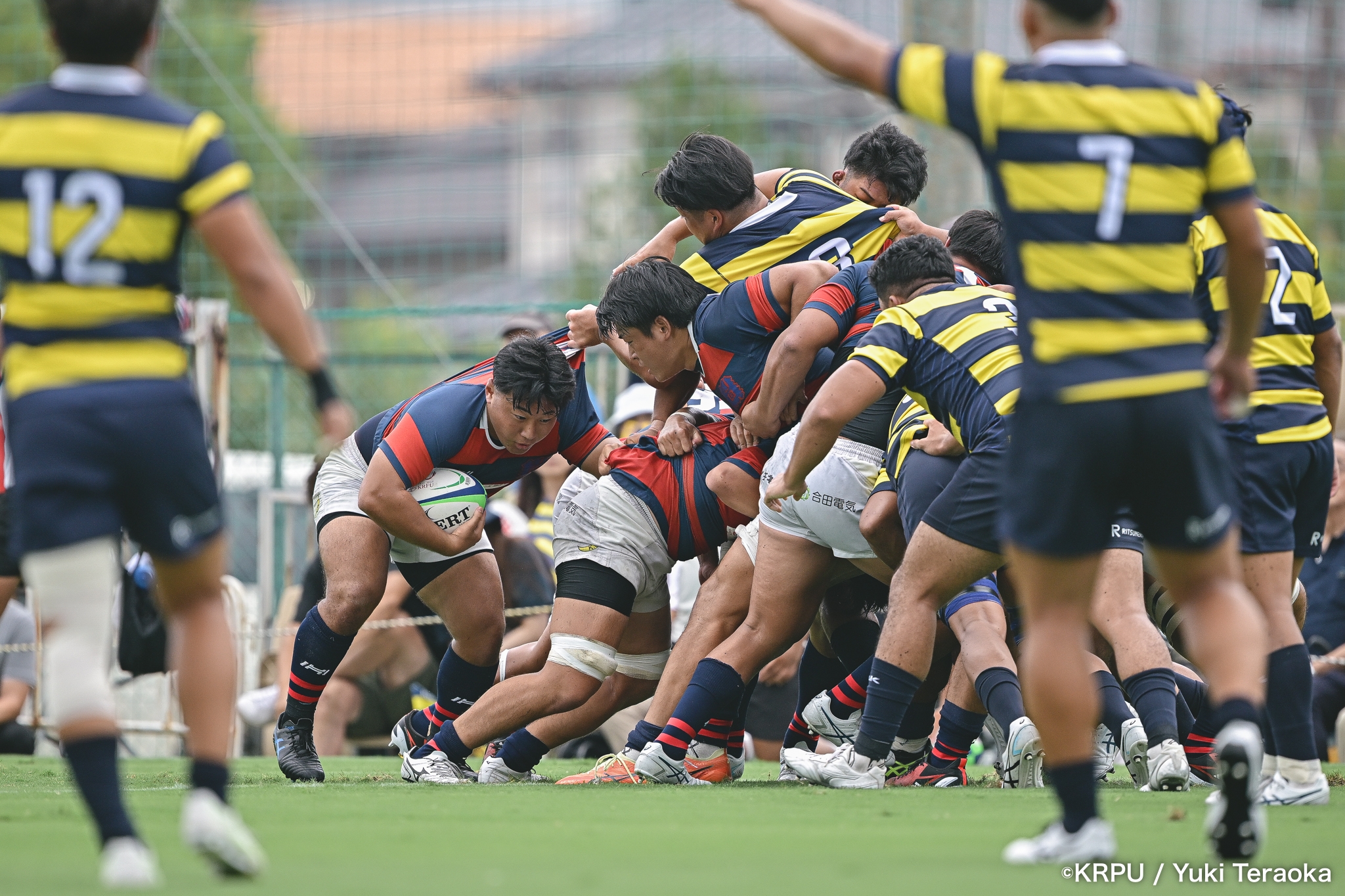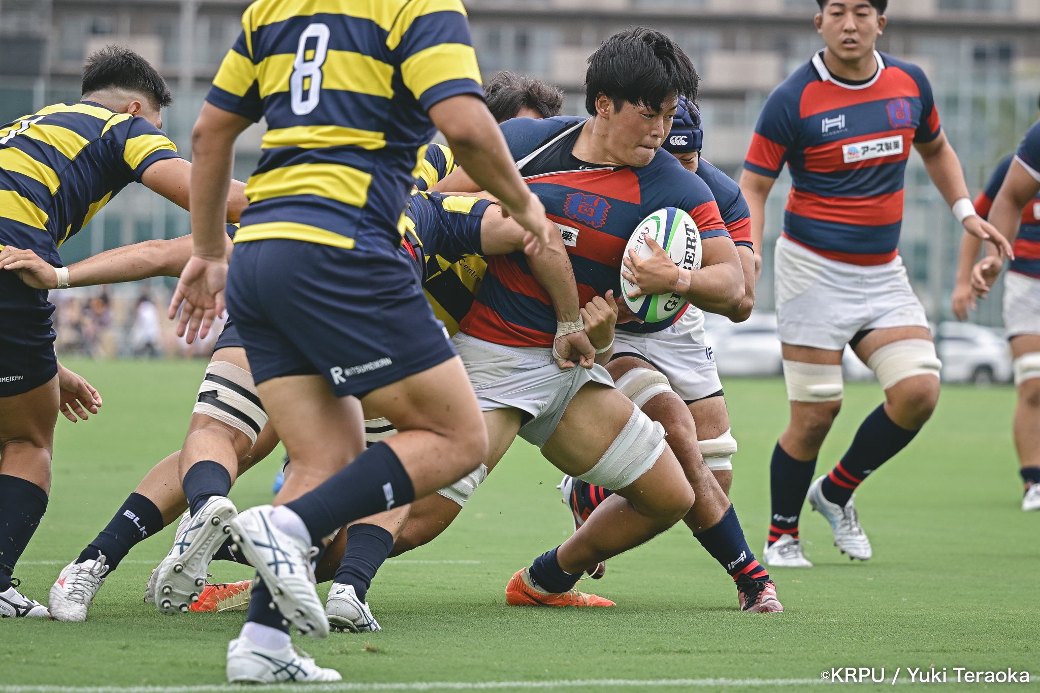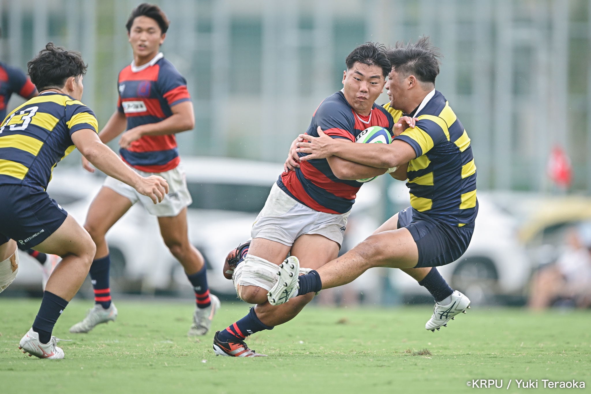 6分、立命はCTB⑫中村颯太がラインブレイクして関学陣に入るも、後が続かない。その後は関学が立命陣でアタックを続けるが、立命が激しいディフェンスで対抗。10分には関学が立命TLに迫るも、WTB⑭三浦遼太郎のスチールでピンチを脱出。