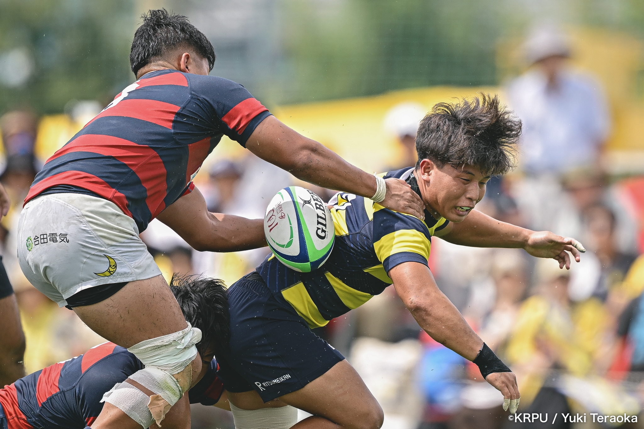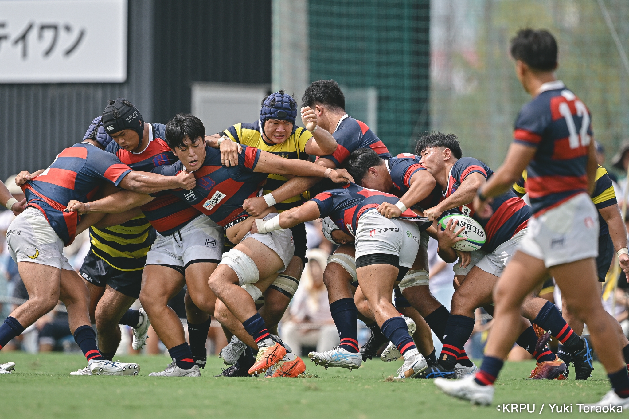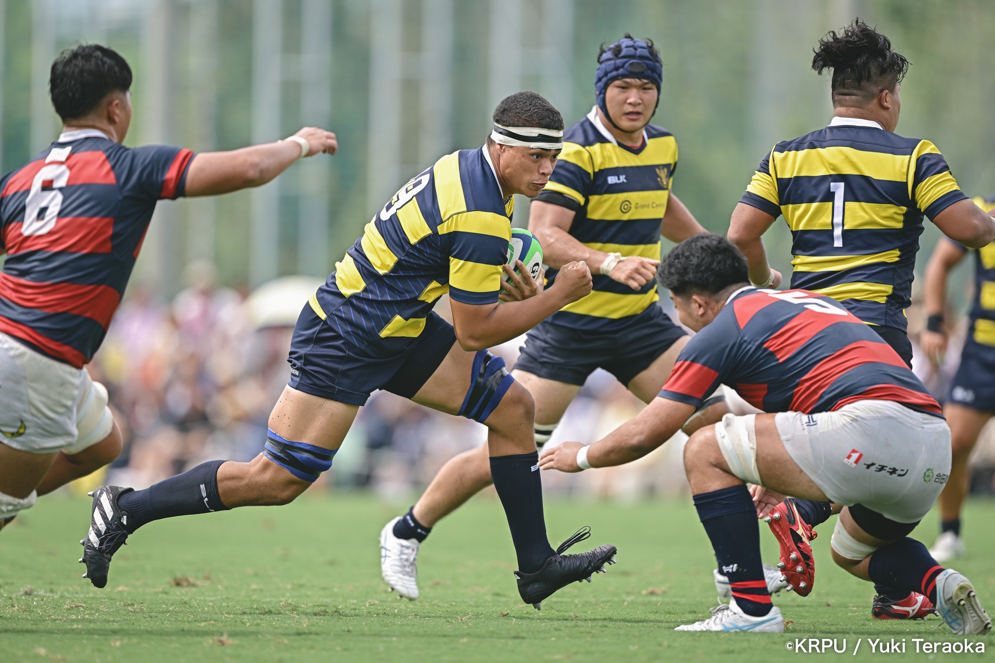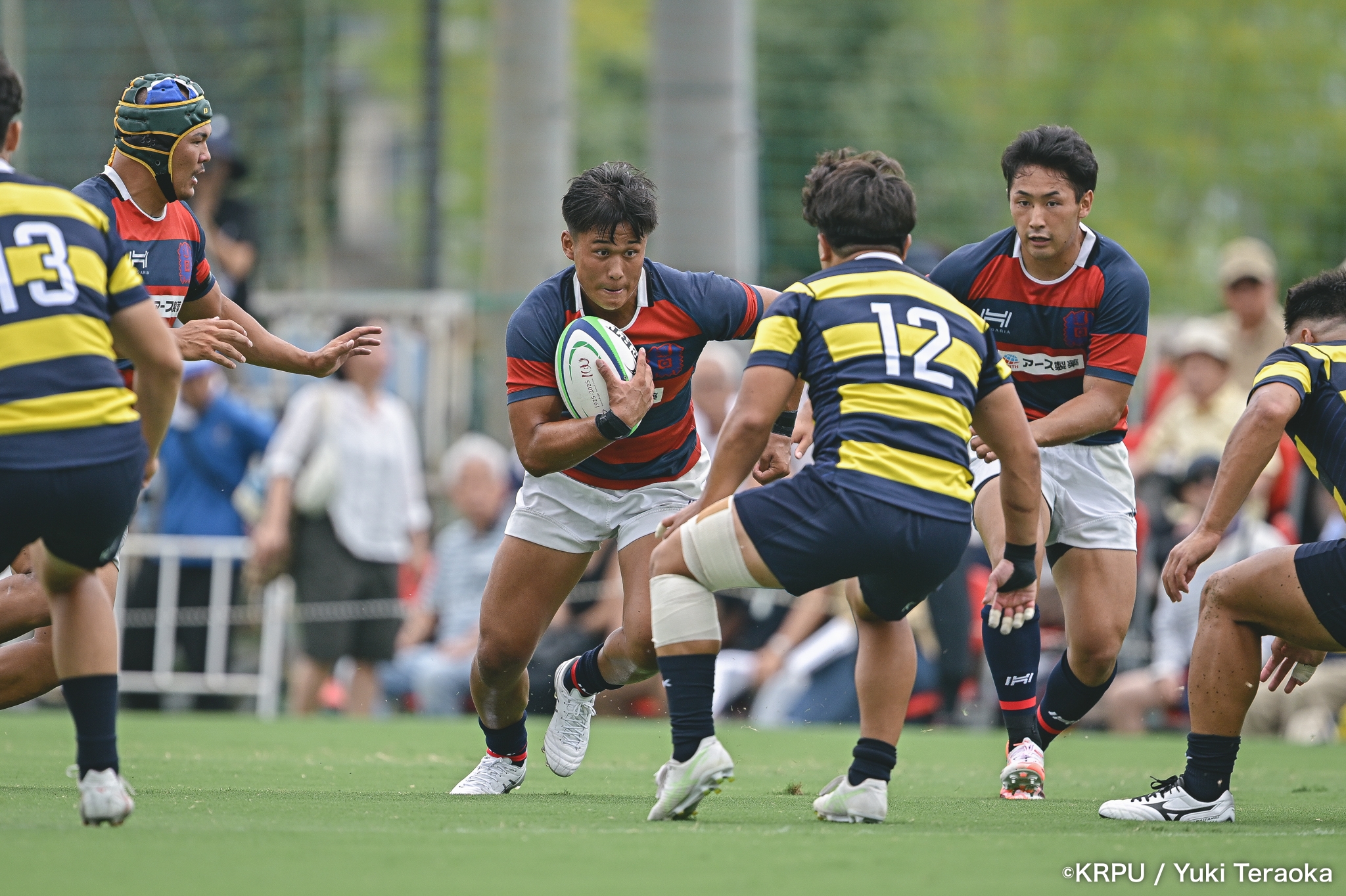 6分、立命はCTB⑫中村颯太がラインブレイクして関学陣に入るも、後が続かない。その後は関学が立命陣でアタックを続けるが、立命が激しいディフェンスで対抗。10分には関学が立命TLに迫るも、WTB⑭三浦遼太郎のスチールでピンチを脱出。