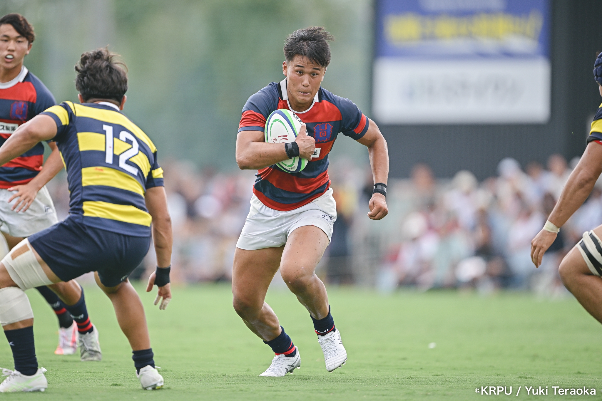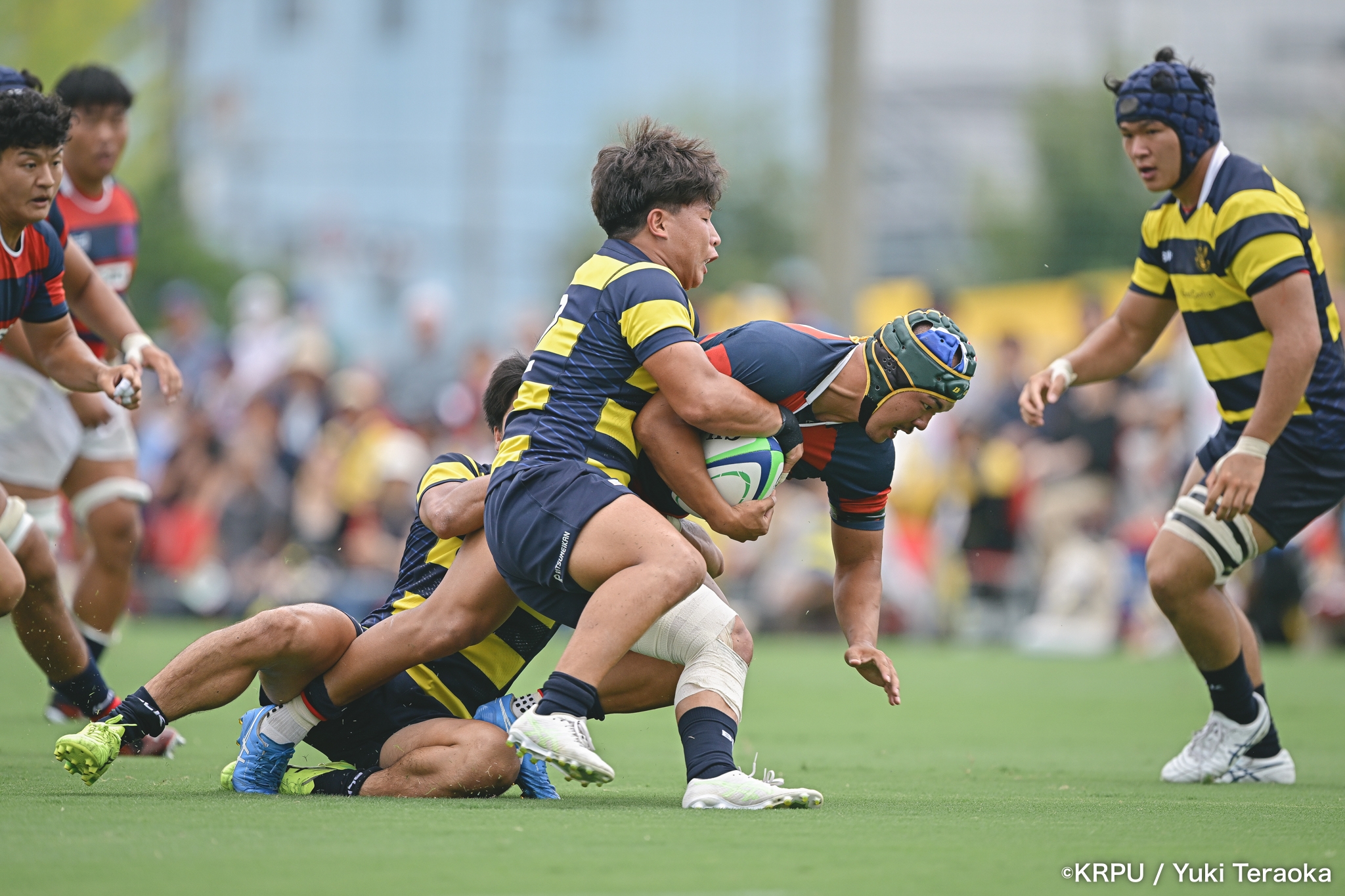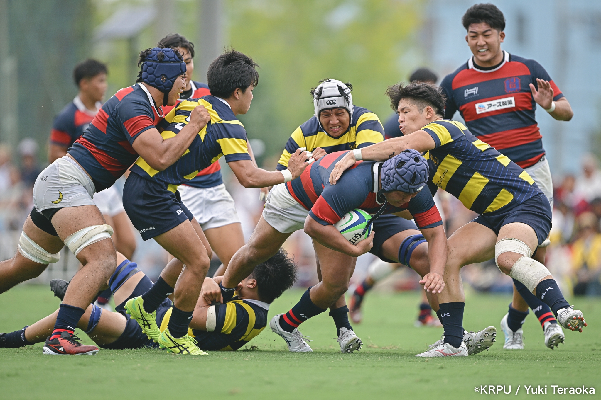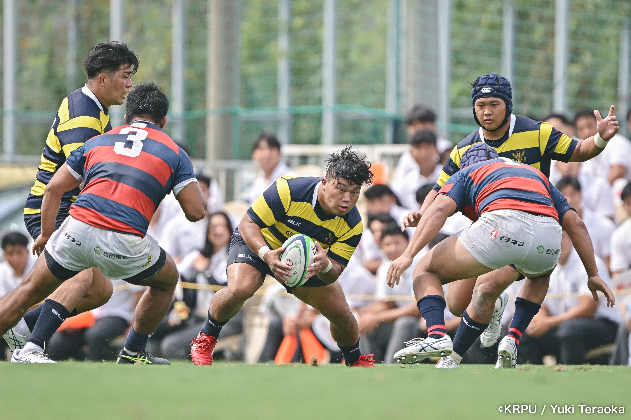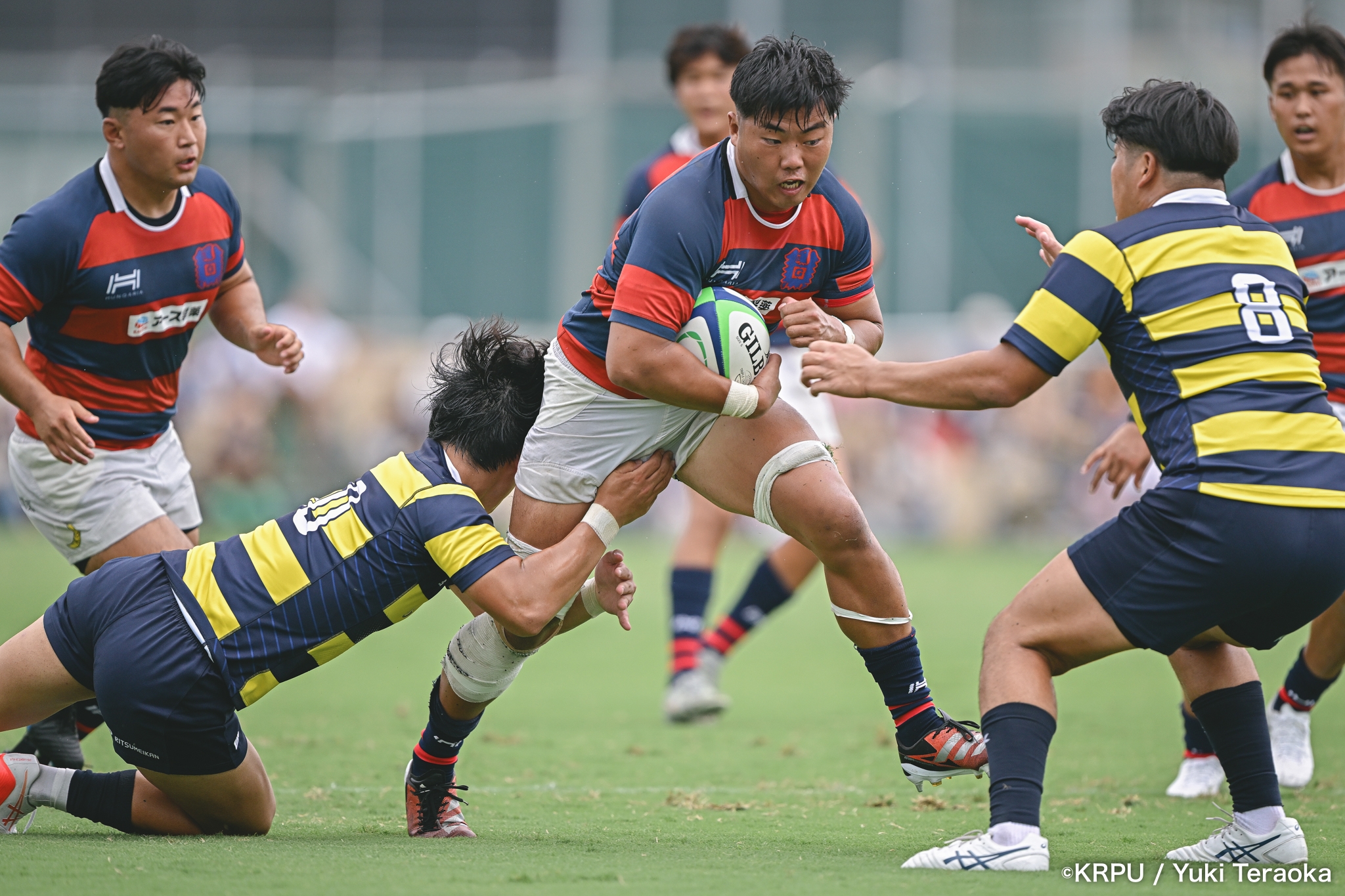 6分、立命はCTB⑫中村颯太がラインブレイクして関学陣に入るも、後が続かない。その後は関学が立命陣でアタックを続けるが、立命が激しいディフェンスで対抗。10分には関学が立命TLに迫るも、WTB⑭三浦遼太郎のスチールでピンチを脱出。
