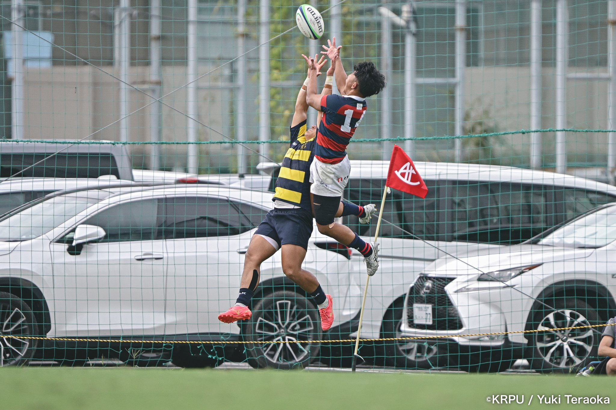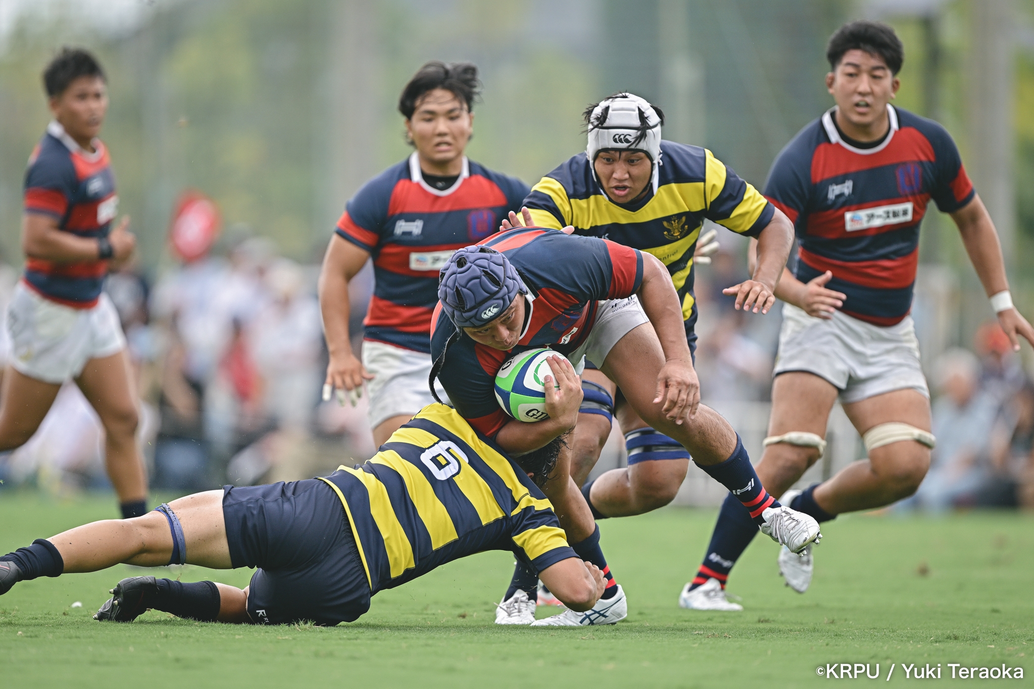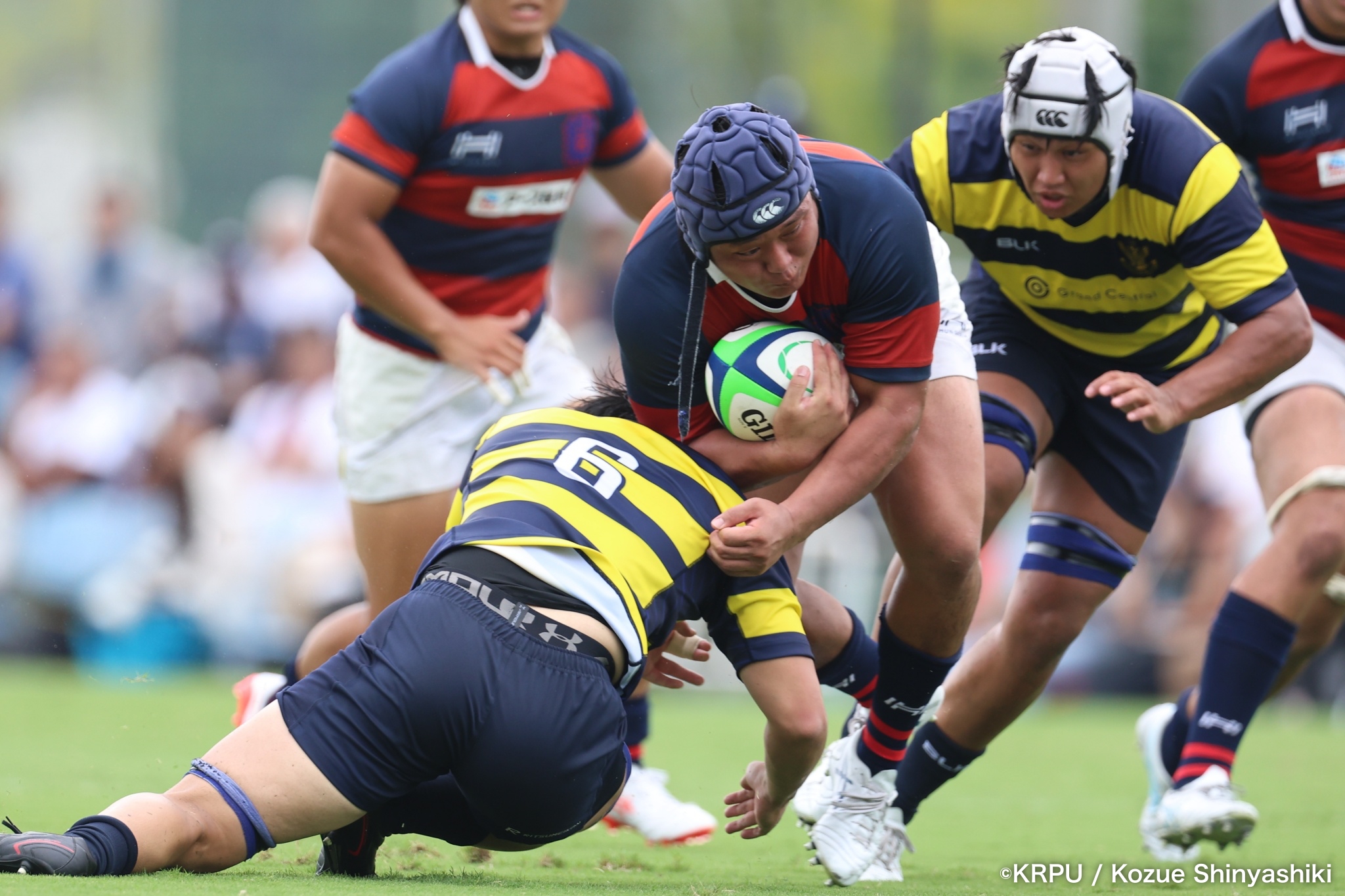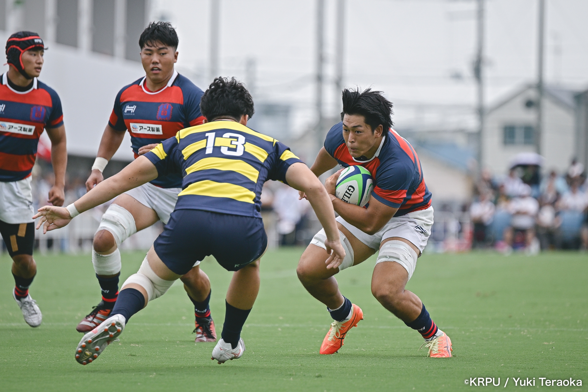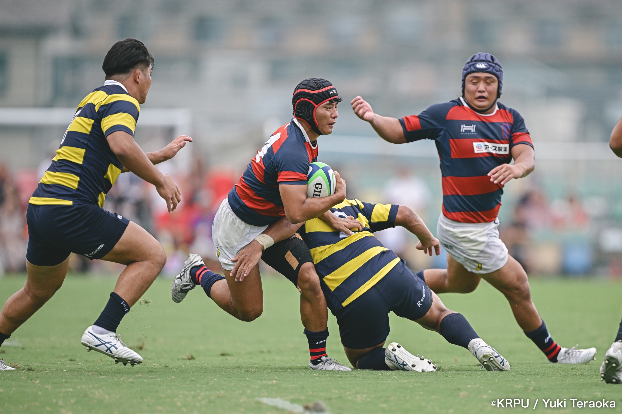 6分、立命はCTB⑫中村颯太がラインブレイクして関学陣に入るも、後が続かない。その後は関学が立命陣でアタックを続けるが、立命が激しいディフェンスで対抗。10分には関学が立命TLに迫るも、WTB⑭三浦遼太郎のスチールでピンチを脱出。