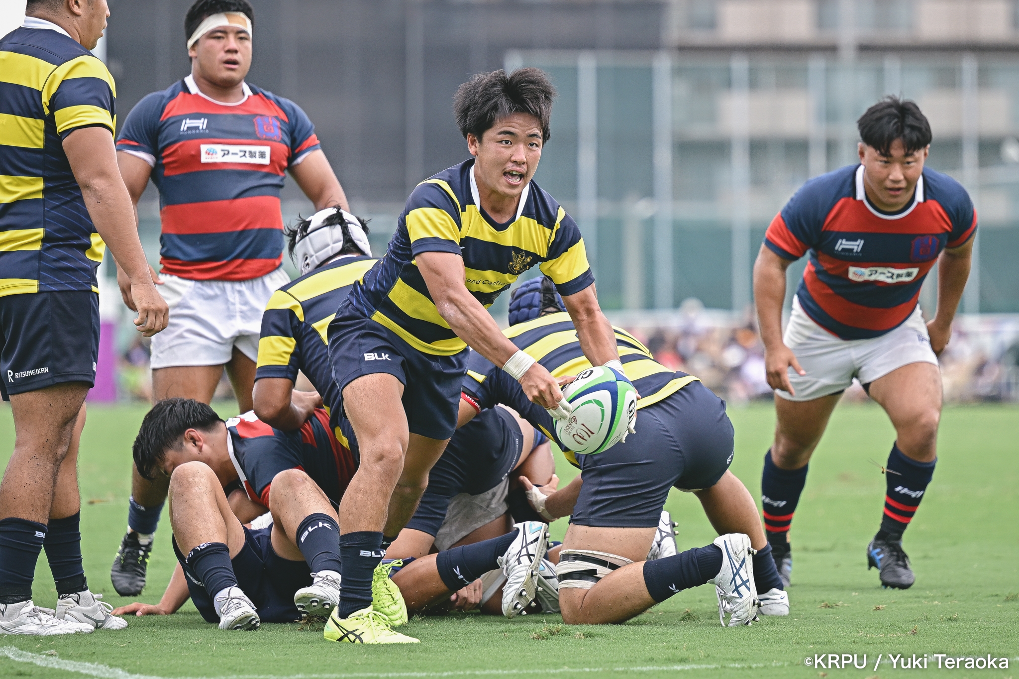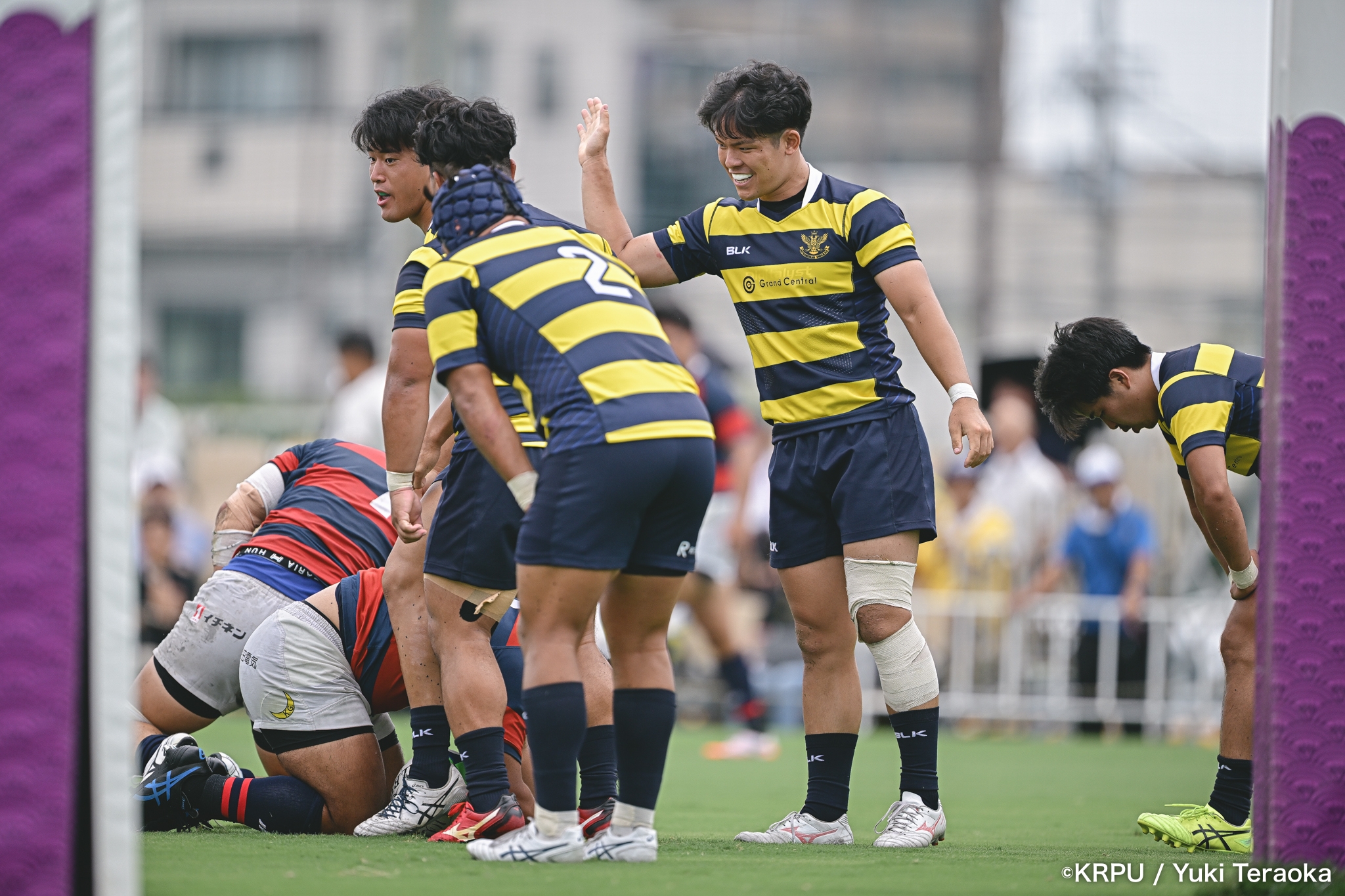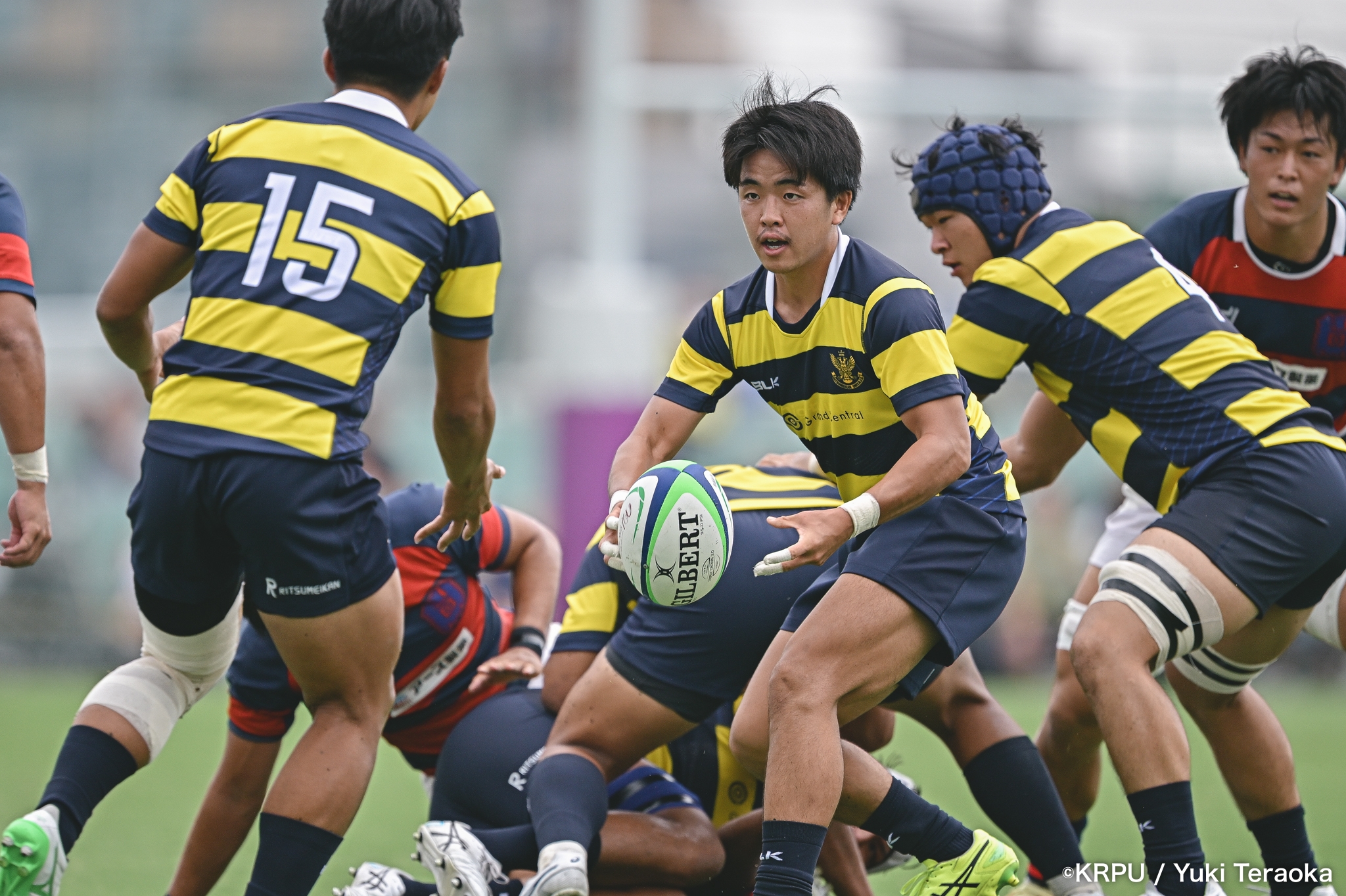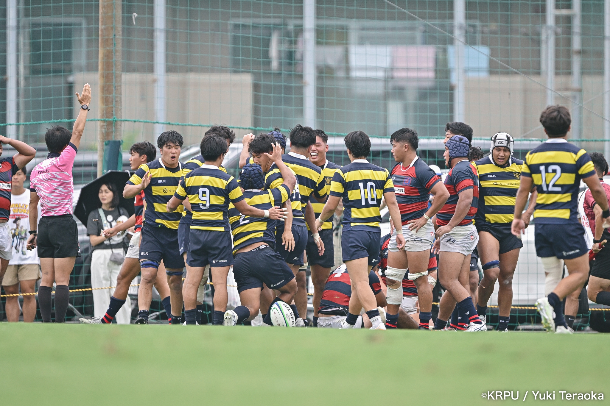 勢いに乗る関学は37分、立命陣左10m付近のラインアウトからFWがモールで前進。できたラックから右へ展開し、SH⑨川原大―SO⑩新井―CTB⑫金正優作。CTB⑫金正がブレイクし、最後はFB⑮的場が右隅へトライ。GK不成功で34-10。さらにロスタイム44分にもWTB⑭成田がトライし、SO⑩新井のゴールが決まり41-10。