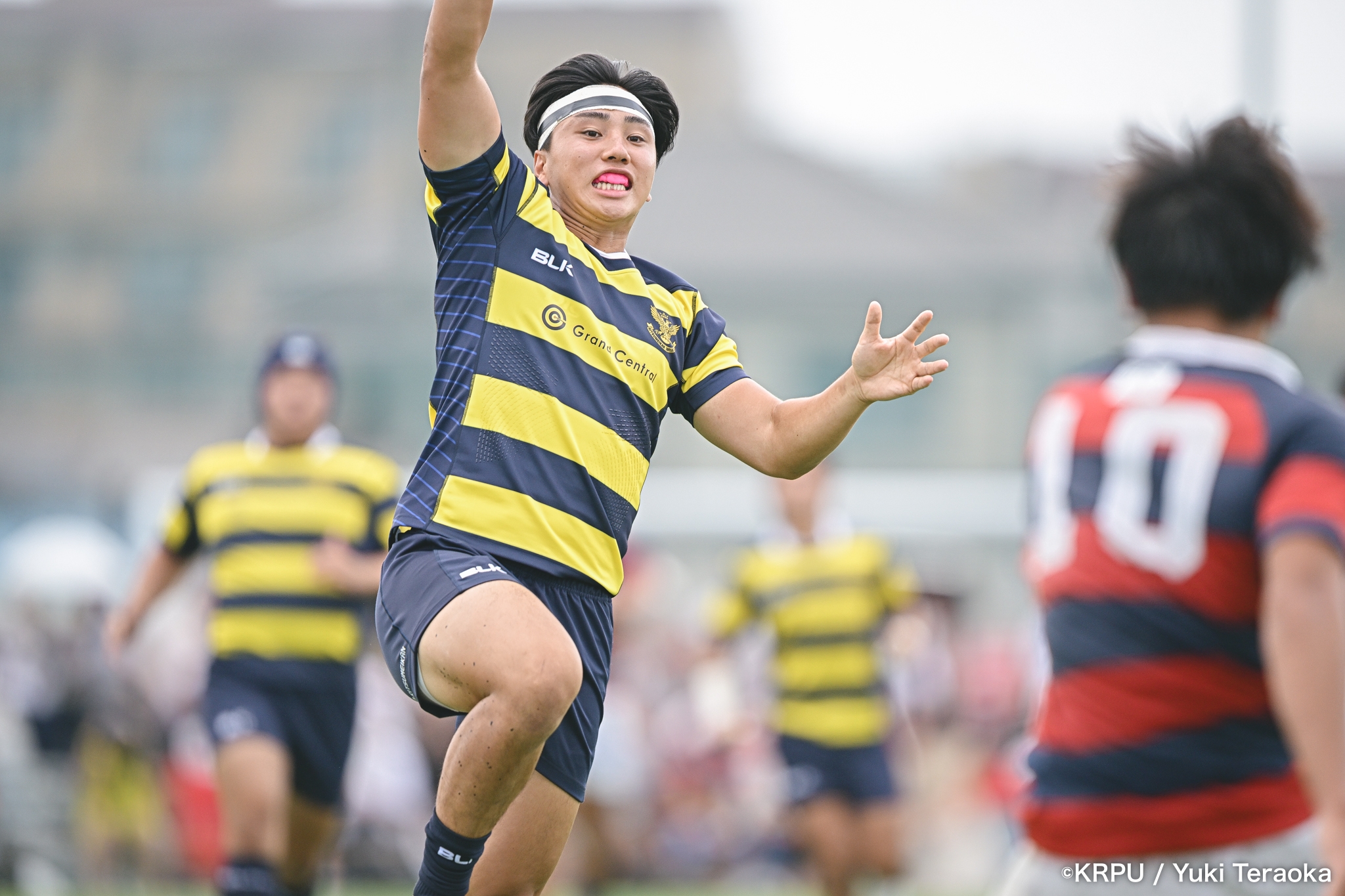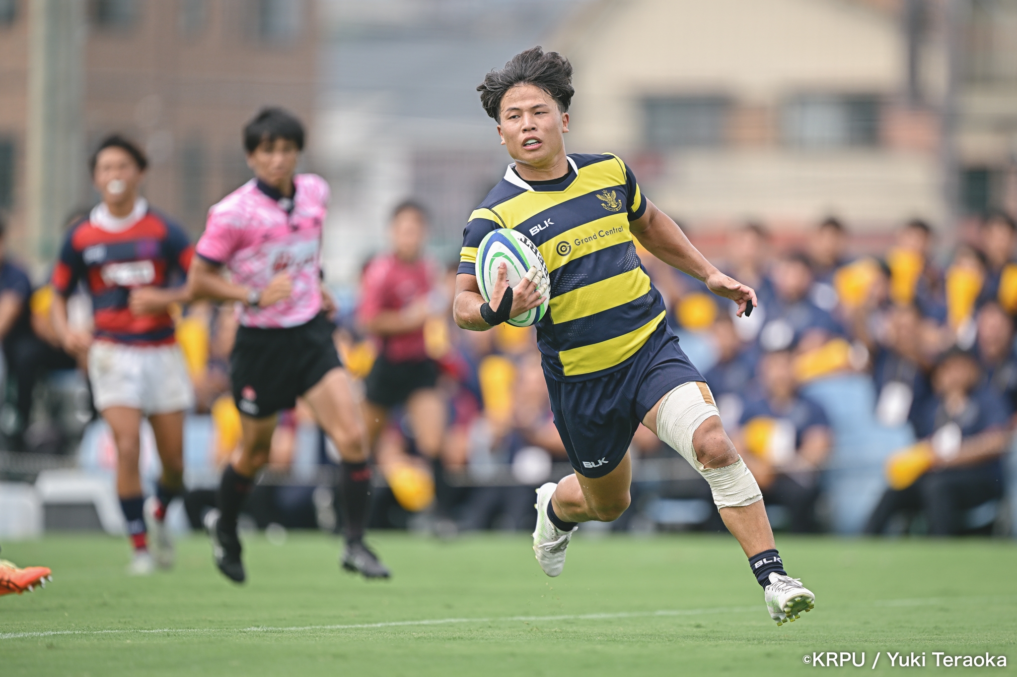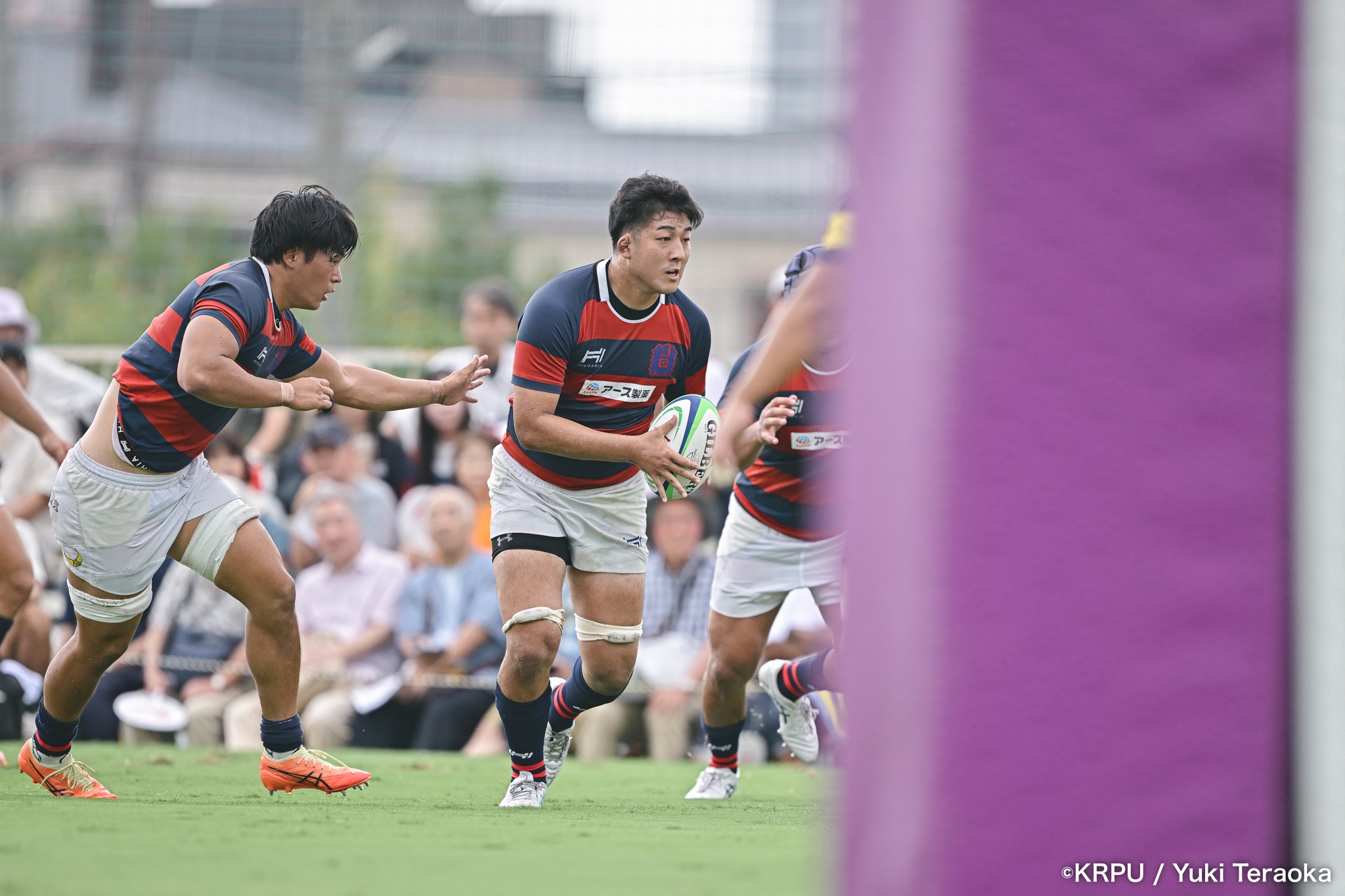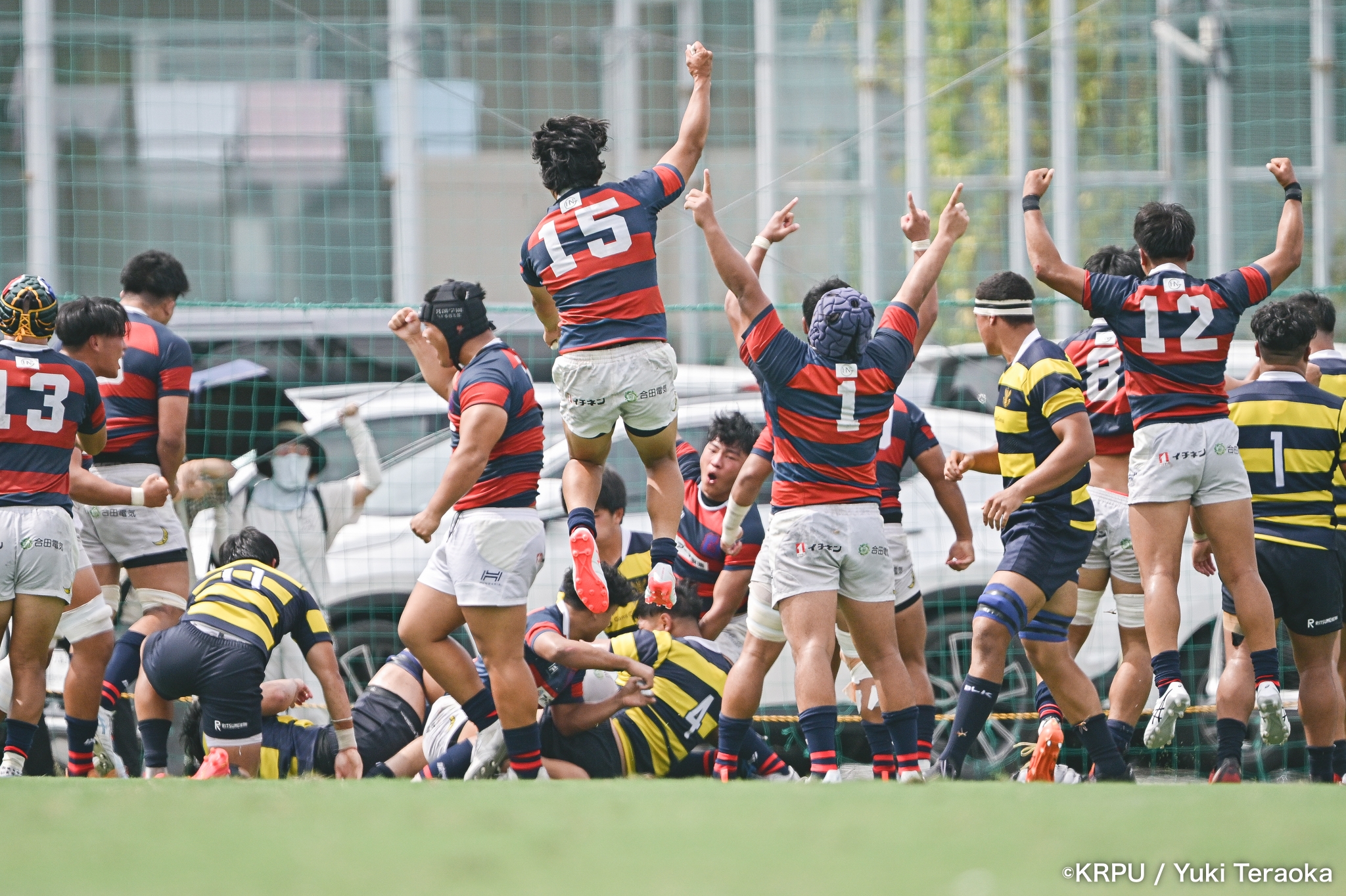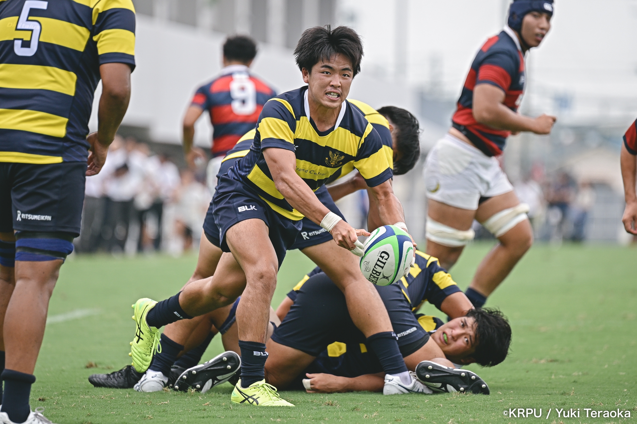勢いに乗る関学は37分、立命陣左10m付近のラインアウトからFWがモールで前進。できたラックから右へ展開し、SH⑨川原大―SO⑩新井―CTB⑫金正優作。CTB⑫金正がブレイクし、最後はFB⑮的場が右隅へトライ。GK不成功で34-10。さらにロスタイム44分にもWTB⑭成田がトライし、SO⑩新井のゴールが決まり41-10。