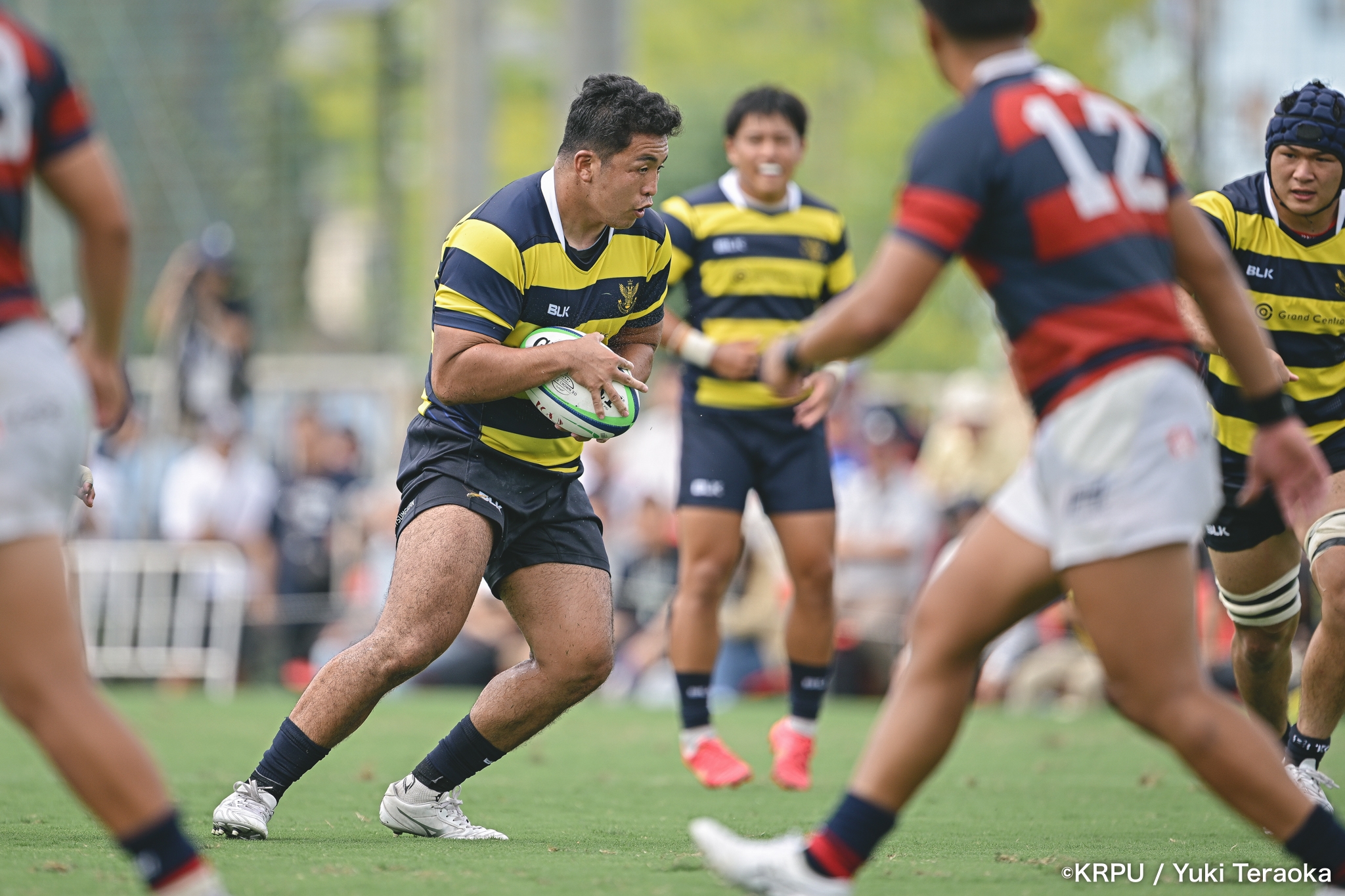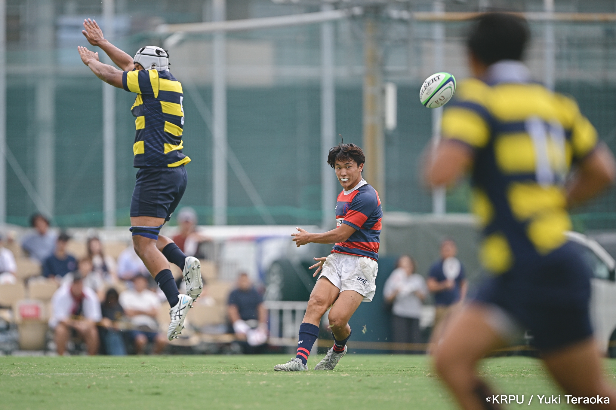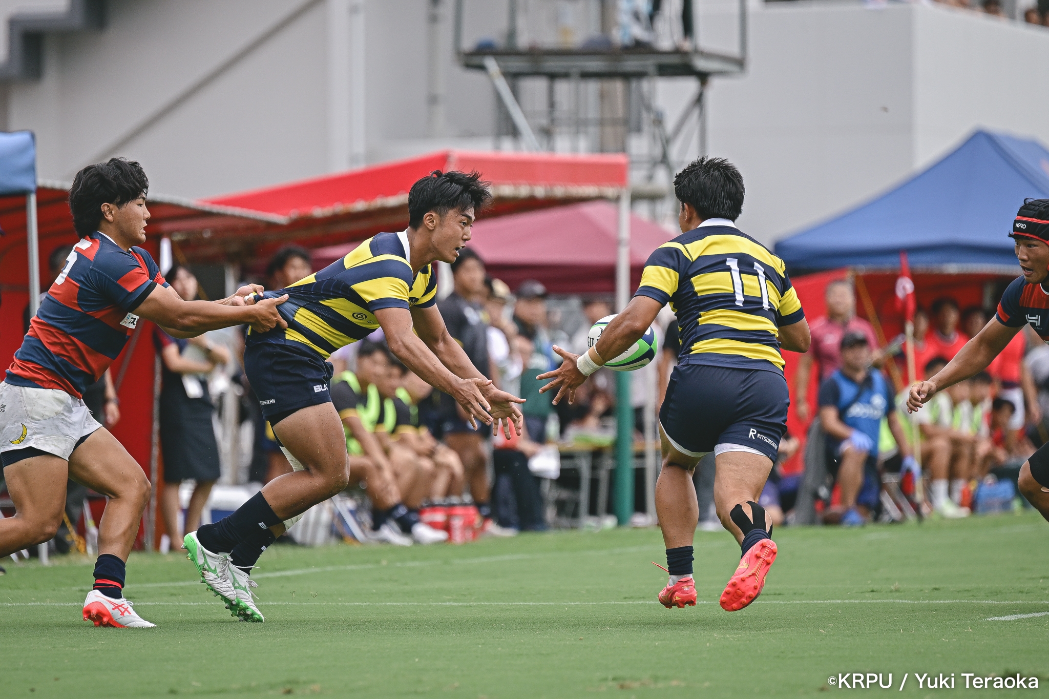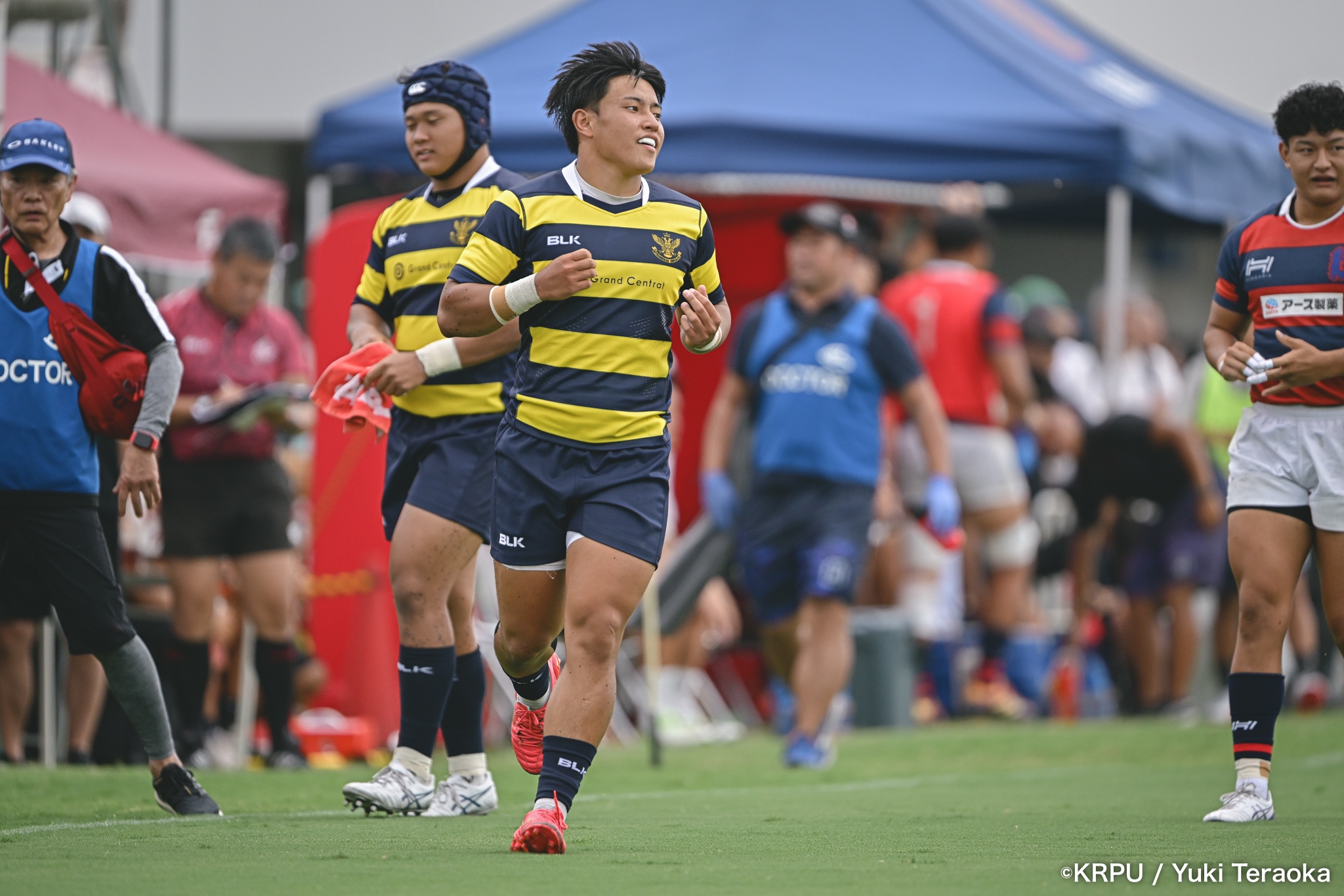 勢いに乗る関学は37分、立命陣左10m付近のラインアウトからFWがモールで前進。できたラックから右へ展開し、SH⑨川原大―SO⑩新井―CTB⑫金正優作。CTB⑫金正がブレイクし、最後はFB⑮的場が右隅へトライ。GK不成功で34-10。さらにロスタイム44分にもWTB⑭成田がトライし、SO⑩新井のゴールが決まり41-10。